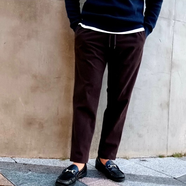 <商品詳細> Color:グレー ブラウン Size:S M L Price:¥19,800 tax in 素材:ポリエステル10% サイズ ウエスト 股上 股下 わたり 裾幅 S 74~ 28.0 67 28 16 M 77~ 28.5 68 29 16 L 80~ 29.5 69 30.5 16.5 <商品説明> 限定企画第一弾で大変ご好評頂きましたリラックスイージーパンツの素材変え。ドビー織りのような組織が表情のあるコーデュロイパンツ。素材感で秋冬らしさをプラスできるアイテムです。軽量で伸縮性があり、ストレスのない履き心地が魅力。程よくリラックス感のあるシルエットでトップスにボリュームのあるニットやコートを持ってきても良いし、レザー等コンパクトなシルエットのアイテムともバランス良く着れる。幅広いコーディネートで楽しんで頂ける逸品です。こちらはLサイズまでの展開ですがウエストゴム仕様、もも回りにゆとりがあるため体格の良い方にもおすすめできます。