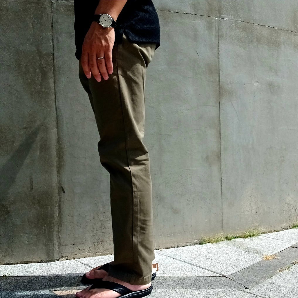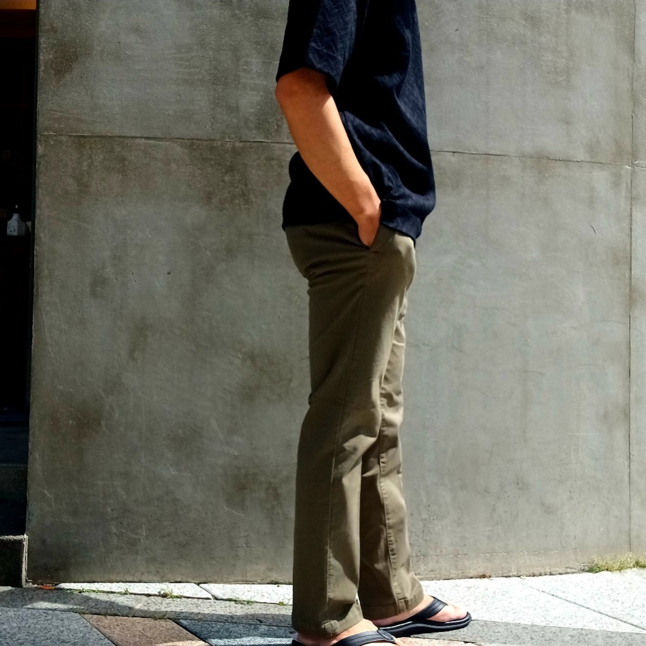 生地は製品染め用のストレッチ入りチノ素材。程よくキックバックもあり、膝抜けがしづらい素材感。