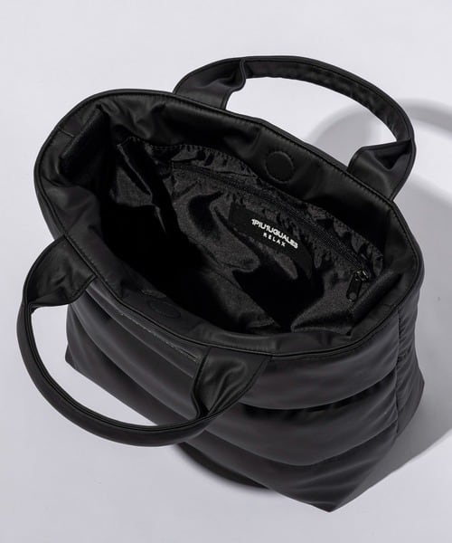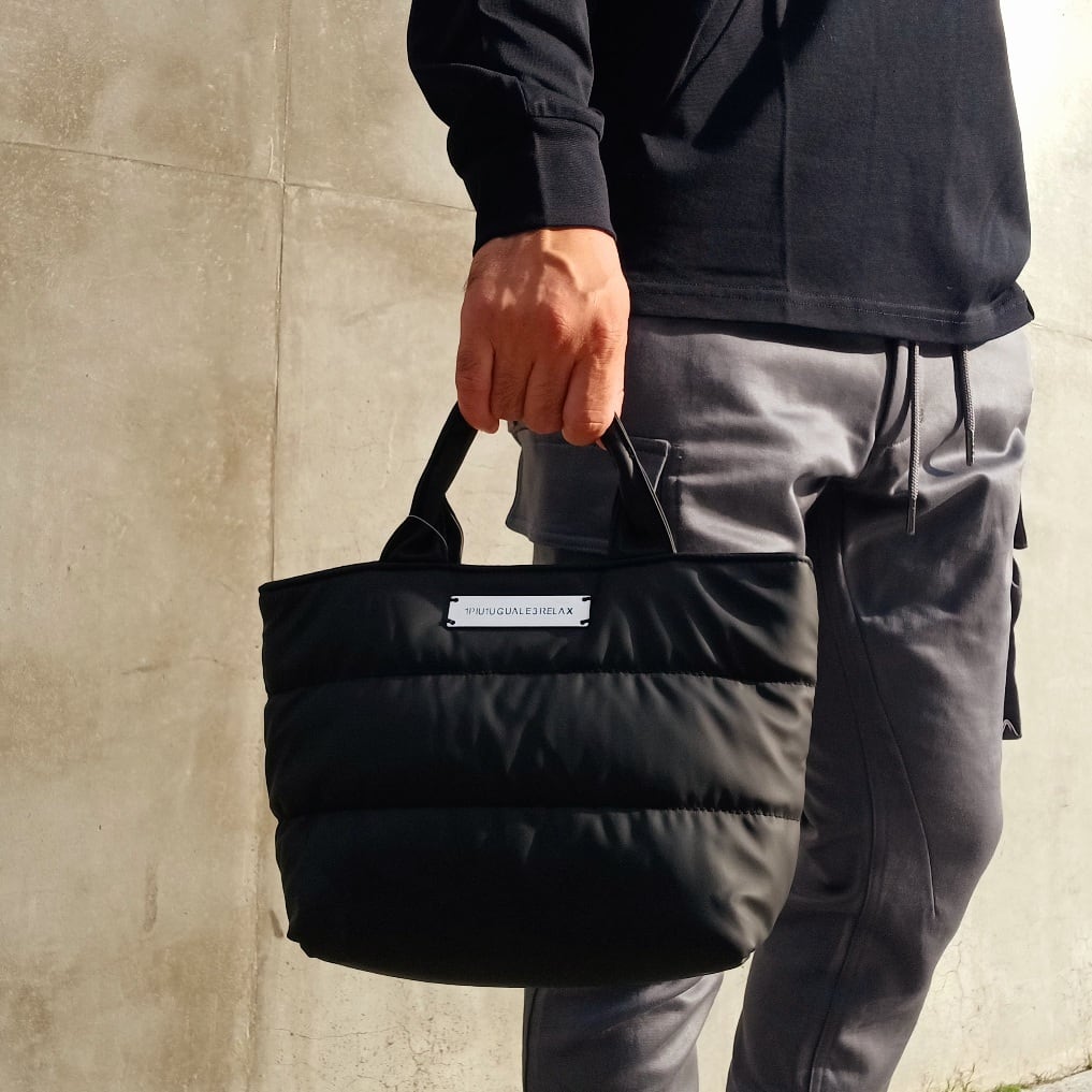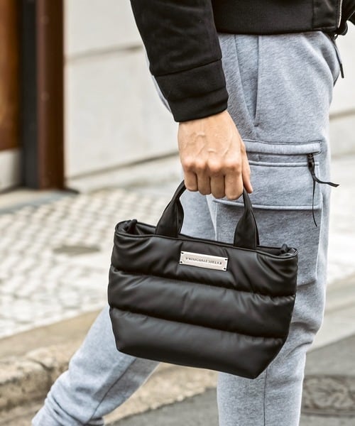 1PIU1UGUALE3 RELAXからトートバッグの登場です。フロントにシルバープレートでブランドロゴを差し込んだミニトート。高級感のある輝きで大人のカジュアルスタイルを格上げ。必要最低限をスマートに持ち運べる無駄をそぎ落としたコンパクトサイズに、丸みを帯びた中綿のフォルムが愛嬌を感じさせます。内側にはファスナーポケットを備え、小物の収納に最適。