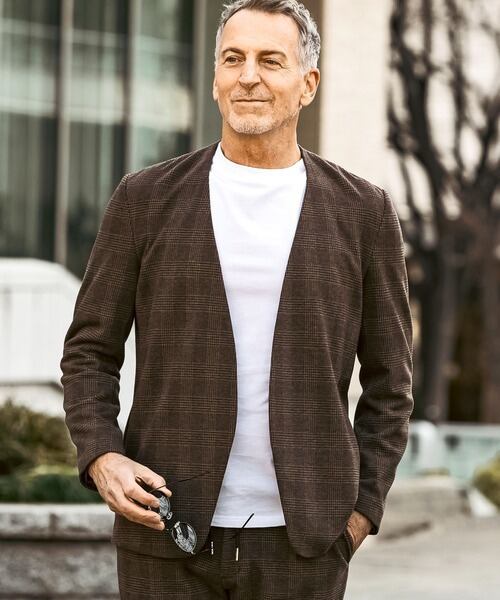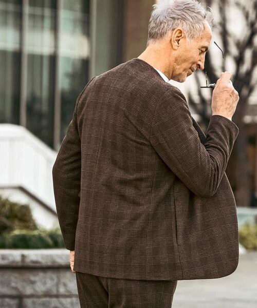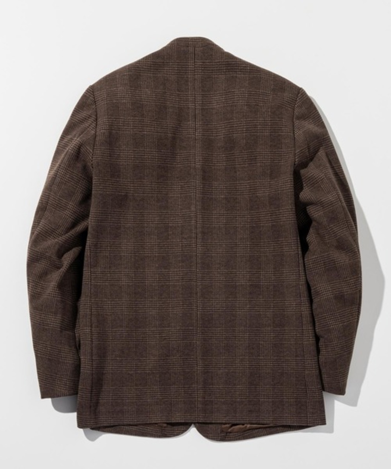 クラシカルなグレンチェック柄が落ち着いた品格を演出するノーカラージャケット。