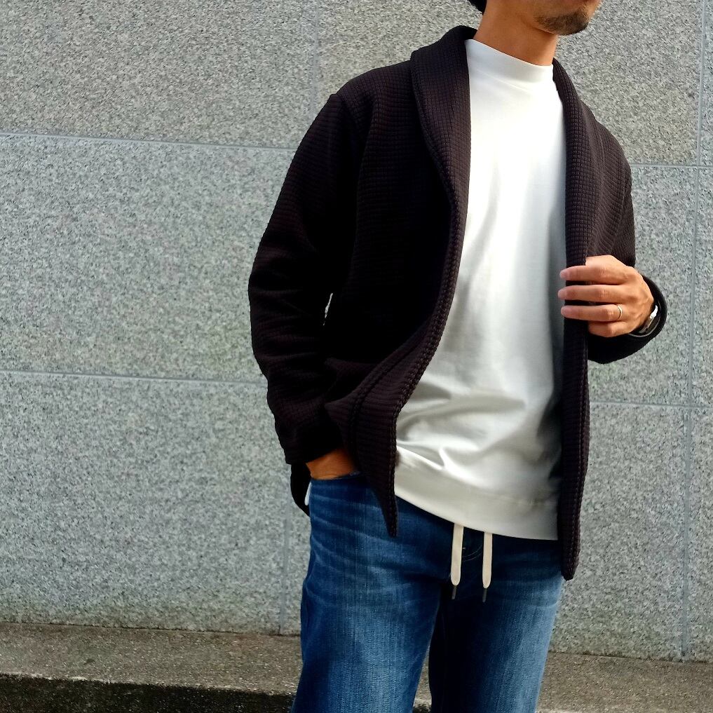 パッと羽織るだけで雰囲気よく着られる、ボタンレスの着流しデザインが魅力。メンズメルローズ浜松のみでの展開となる完全別注アイテム。程よい肉感がありながら非常に軽量で秋から冬、そして春とインナーを変えながらロングシーズン着用可能な一着。