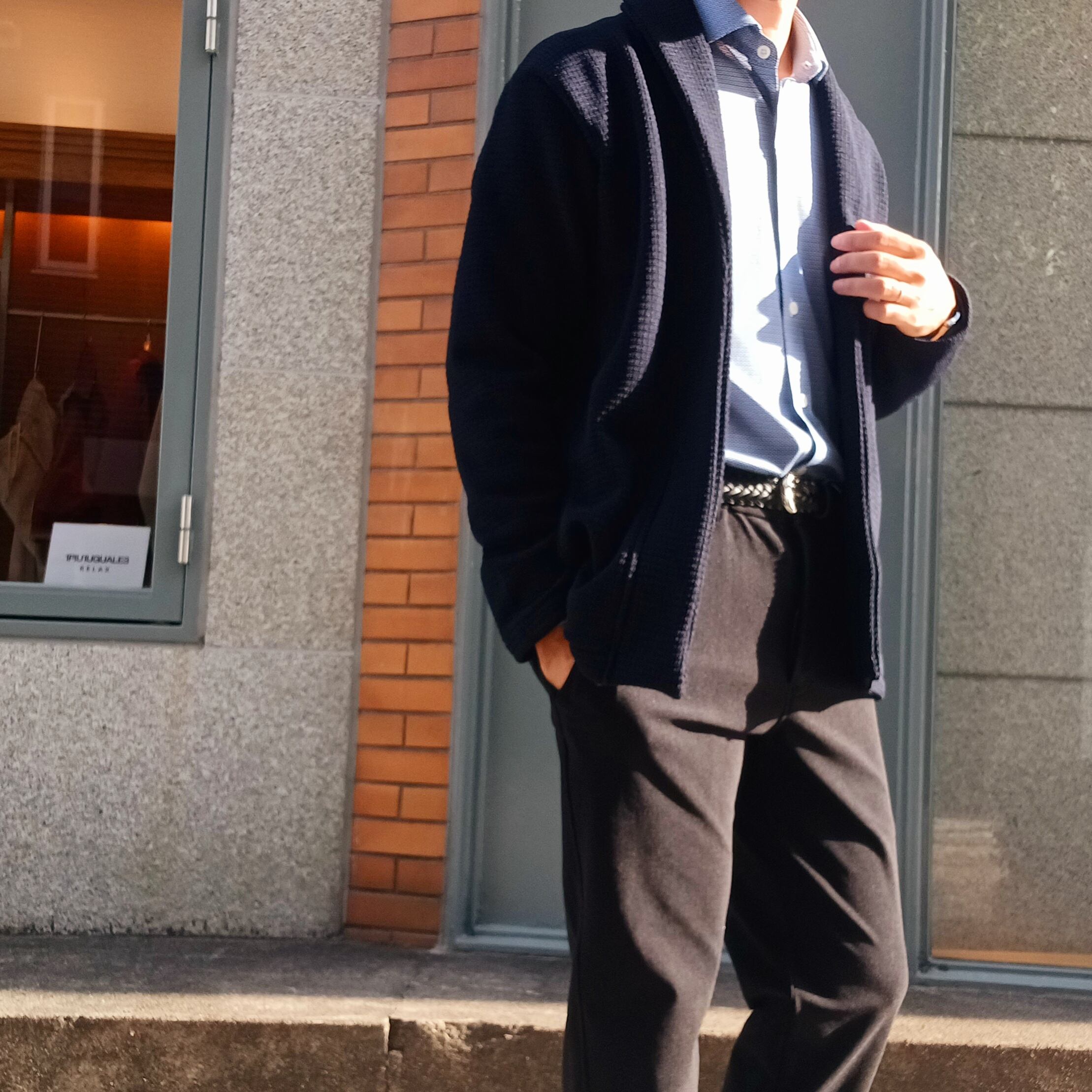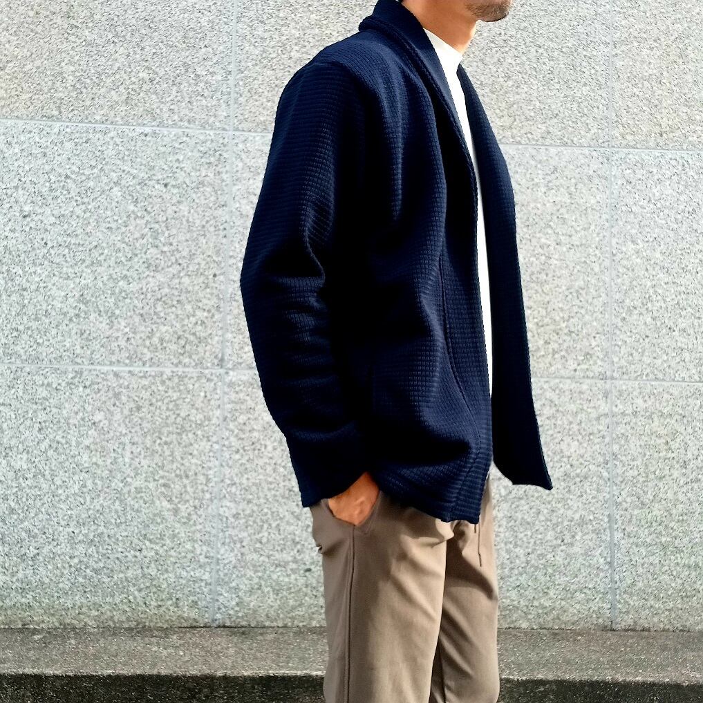 ショールカラーなので、ビジネスカジュアルとしても活躍するアイテムです。