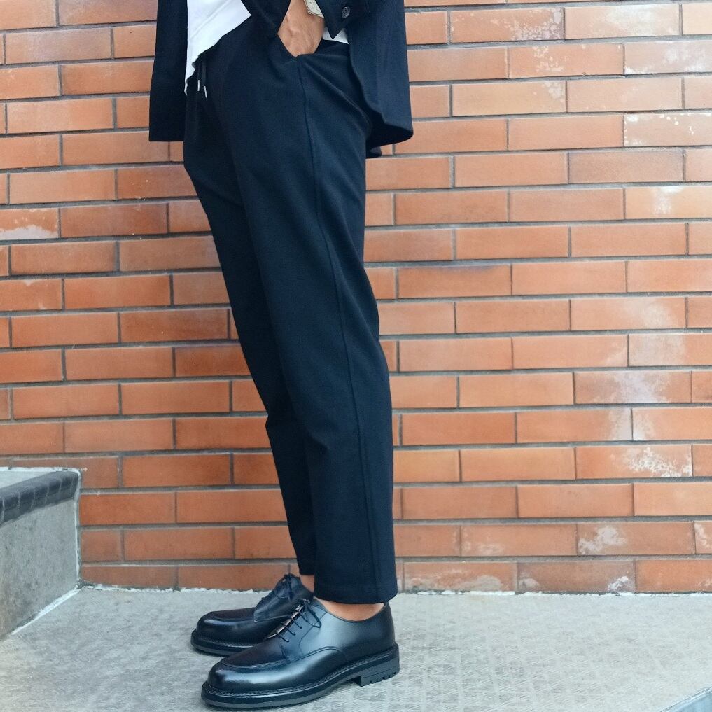 着心地の軽さとスポーティな雰囲気が特徴的なコンフォータブル(快適)な素材のイージーパンツ。高反発ストレッチ、軽量でソフトな肌触り、防シワ、ウォッシャブルの高機能素材になります。リラックスシャーリング型、スピンドル、ループ付き、両サイド玉縁ポケット。