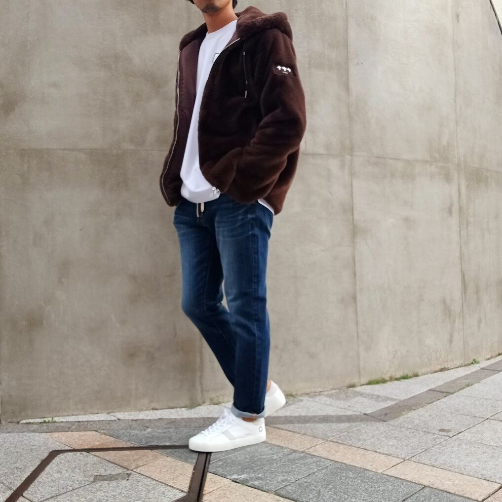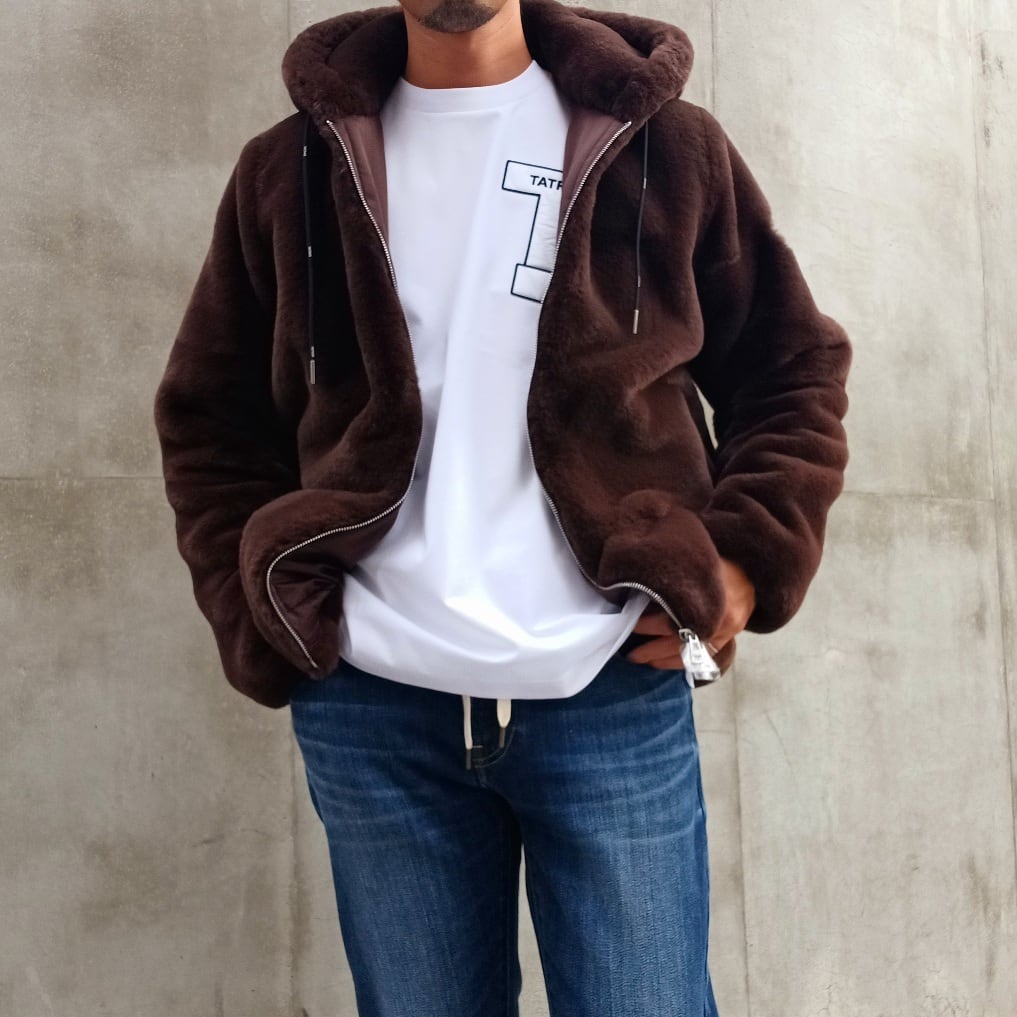 美しい艶感を持つ、エコファー素材を採用したフード付きブルゾン。