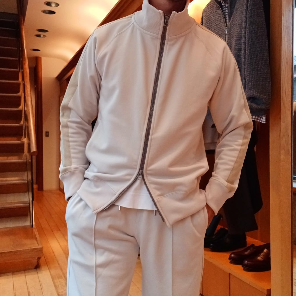 新素材キャノンループ、表面はポリエステルフィラメント糸使用で従来の裏毛よりスポーティさを演出し、裏面は綿100%で裏毛独特の肌触りの良さと膨らみ感をだし、また裏のループはさり気なく端正な綾目素材で編みたて、軽量で伸縮性もあります。新モデルのトラックジャケットはラグラン袖ですが身幅、腕回りをシャープに仕上げています。高めのリブ衿、袖には異素材テープ、ジップも配色になります。