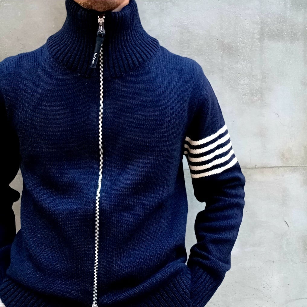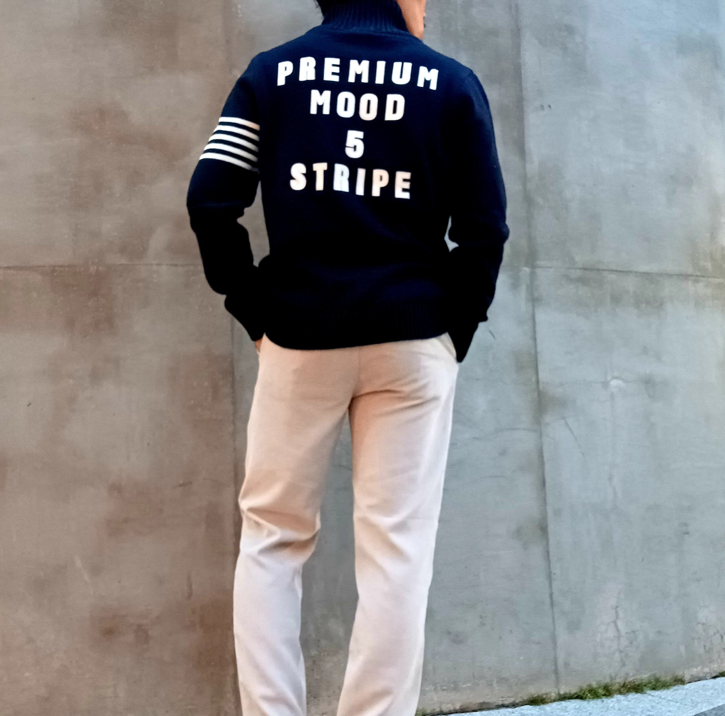 スポーティでありながら大人っぽさも感じるジップアップのニットブルゾン。背面にはパッチワークをあしらい、「PREMIUM MOOD 5 STRIPE」のメッセージを大胆に配置。左袖の5本ラインと相まってブランドらしい遊び心が光る一着です。