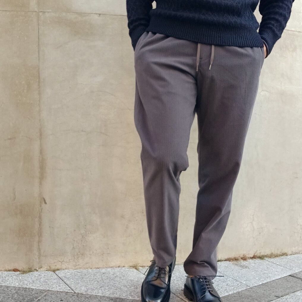 限定企画第一弾で大変ご好評頂きましたリラックスイージーパンツの素材変え。ドビー織りのような組織が表情のあるコーデュロイパンツ。素材感で秋冬らしさをプラスできるアイテムです。軽量で伸縮性があり、ストレスのない履き心地が魅力。程よくリラックス感のあるシルエットでトップスにボリュームのあるニットやコートを持ってきても良いし、レザー等コンパクトなシルエットのアイテムともバランス良く着れる。幅広いコーディネートで楽しんで頂ける逸品です。こちらはLサイズまでの展開ですがウエストゴム仕様、もも回りにゆとりがあるため体格の良い方にもおすすめできます。