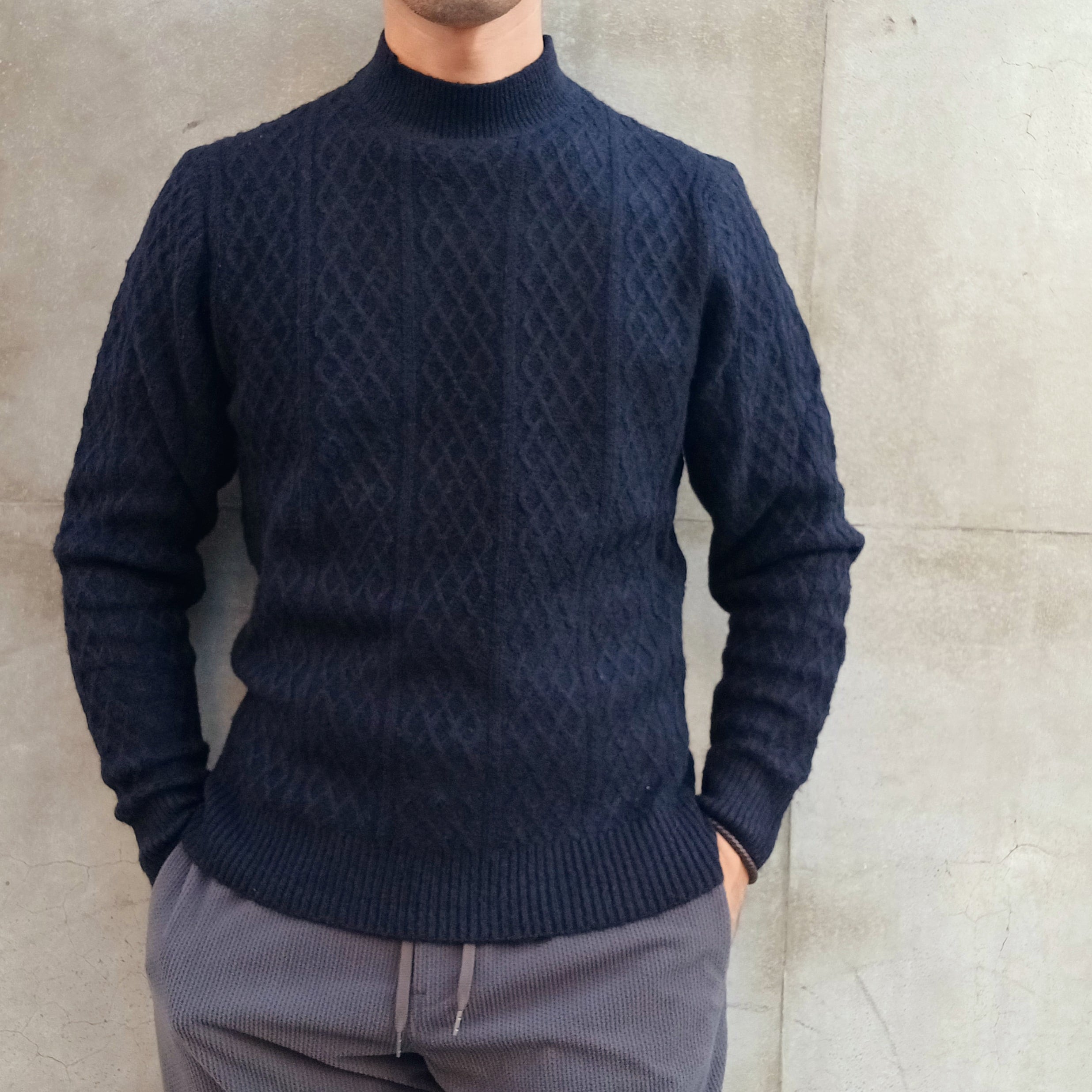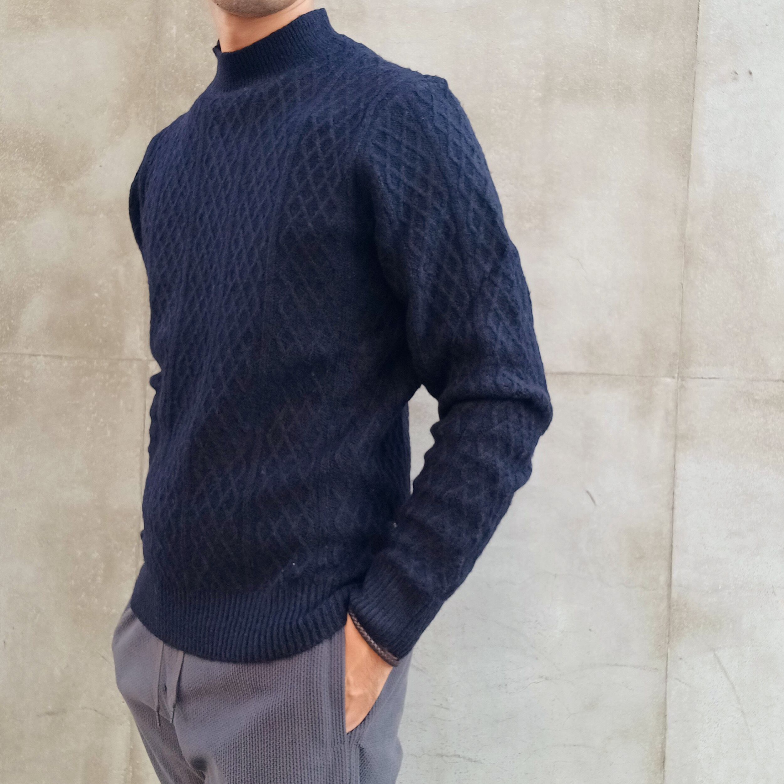 クルーネックよりも少し高く、タートルネックよりは浅いネックの高さで、トップスとしてもインナーとしても頼れる着回し力の高い一着。立体的な編地で羽織るだけでニュアンスたっぷりのスタイリングにしてくれるニットです。76%ポリエステルと21%のアクリルで作られており、柔らかさと優れたフィット感を提供します。ポリエステルは耐久性が高く、形状を保ちやすいため、長く着用しても型崩れしにくいのが魅力です。アクリルの混合により、軽やかさと保温性も兼ね備えています。