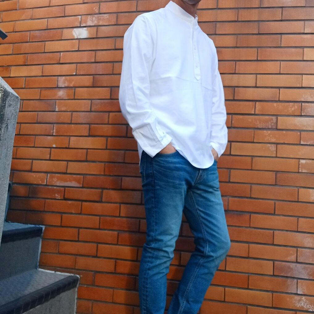 端正なバンドカラーに、胸元へと伸びるヘンリーネックが抜け感を添えた一着。