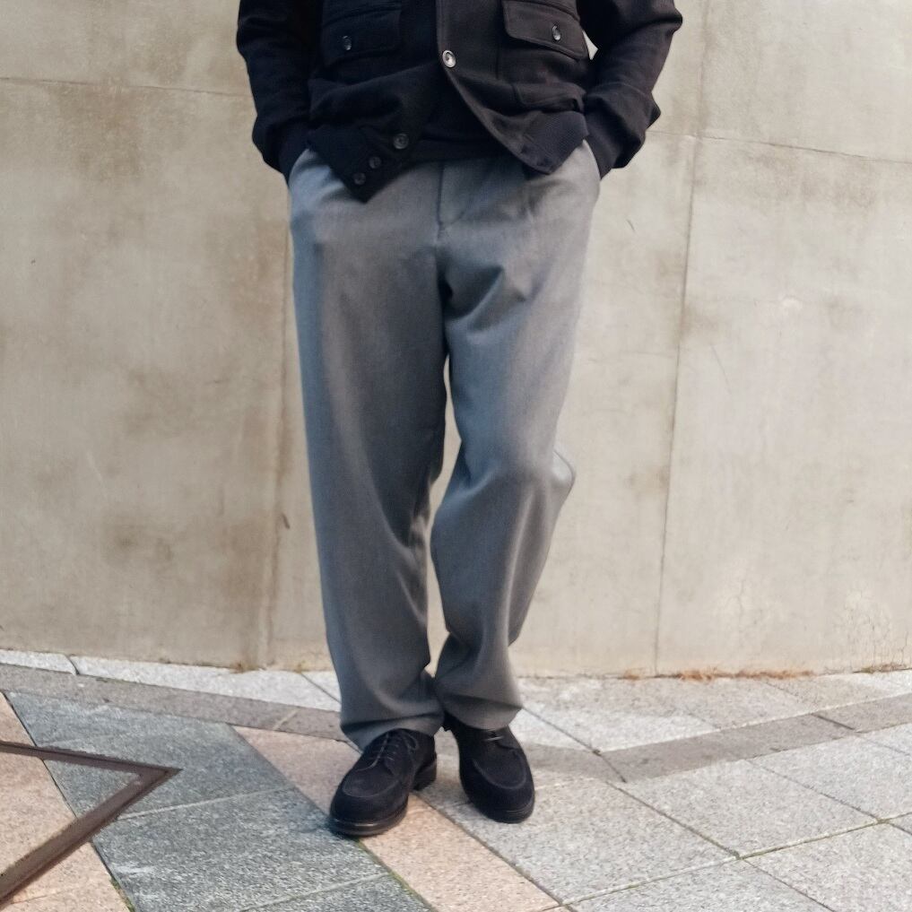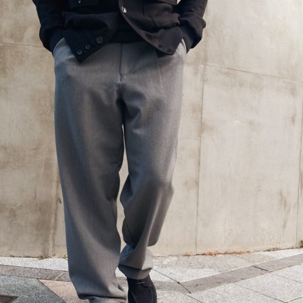 カシミタッチのフリース仕立て裏起毛2WAY素材。ウールのような温かみのある素材です。定番型のワンタックワイドパンツ。後身シャーリング、ループ付きモデル。