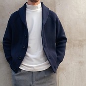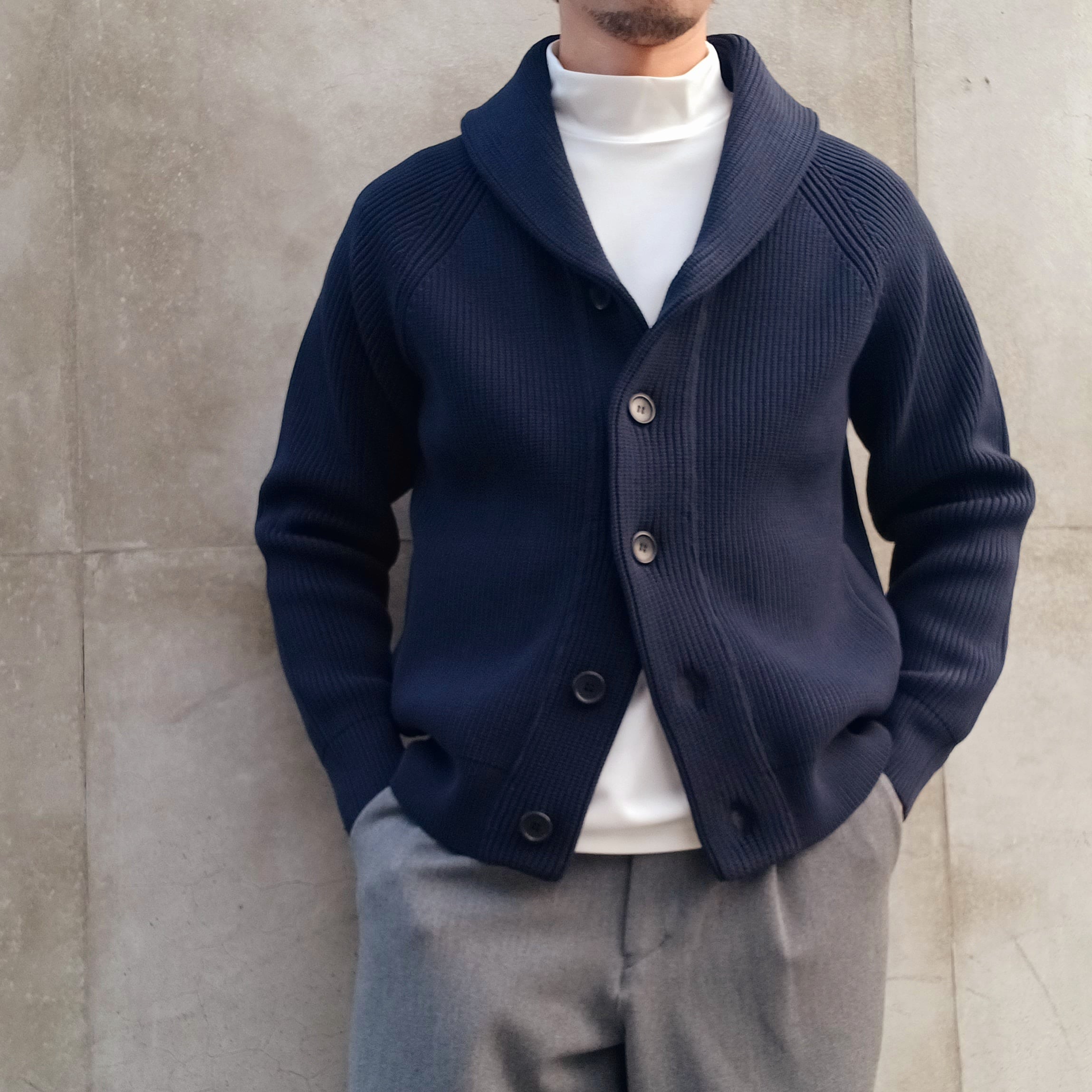 ショールカラーニットの良し悪しを見る上で、大事な生地のボリューム感もしっかりとあります。厚手のショールカラーといえばウールやコットンが主流ですが、これから段々と暖かくなる時期に着る事を考えると、ウールだと暑くなり過ぎるし、コットンでこのボリュームは物自体が重たくなりすぎる。そんな中でリナシェンテのK氏が出したアイデアはポリエステル100%。あまりニットでは馴染みの無い素材ですが、ボリューム感は出つつも軽量に仕上がるとまさに良いところ取りの素材なんです。化繊ならではの発色の良さがウールやコットンでは出し得ない色味を表現してくれるのもポイントです。