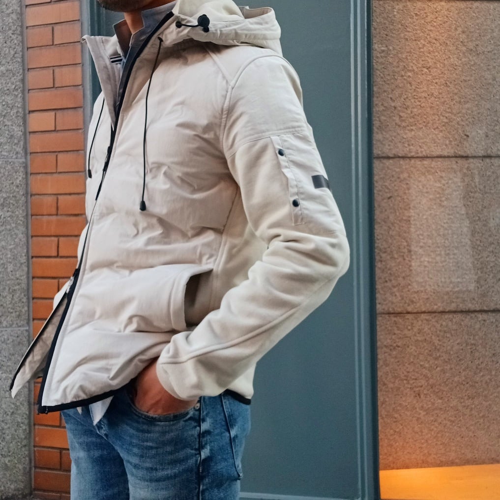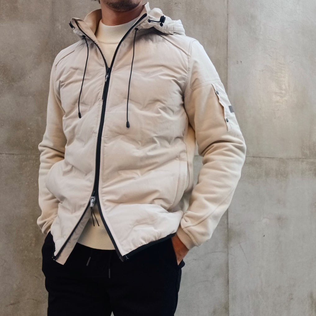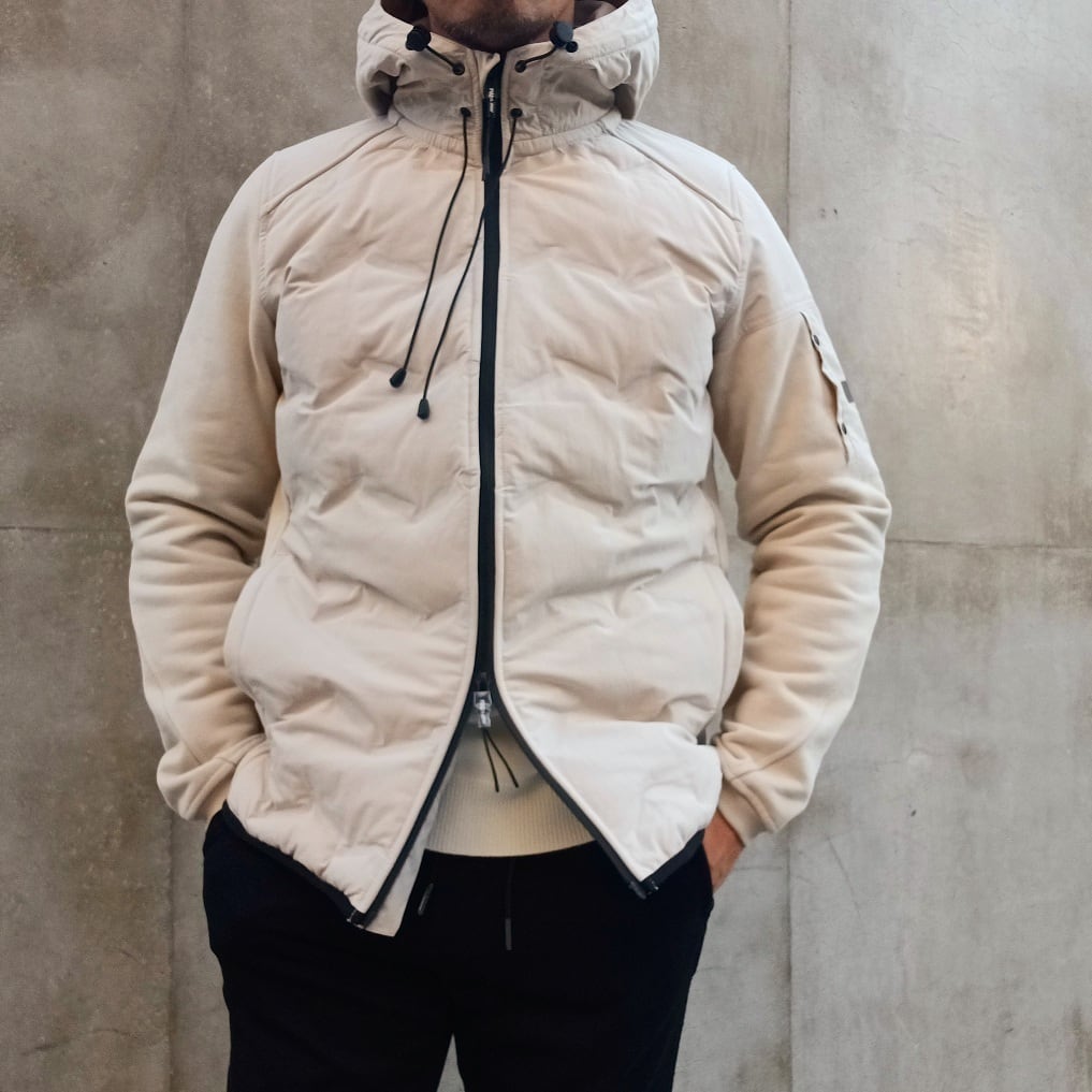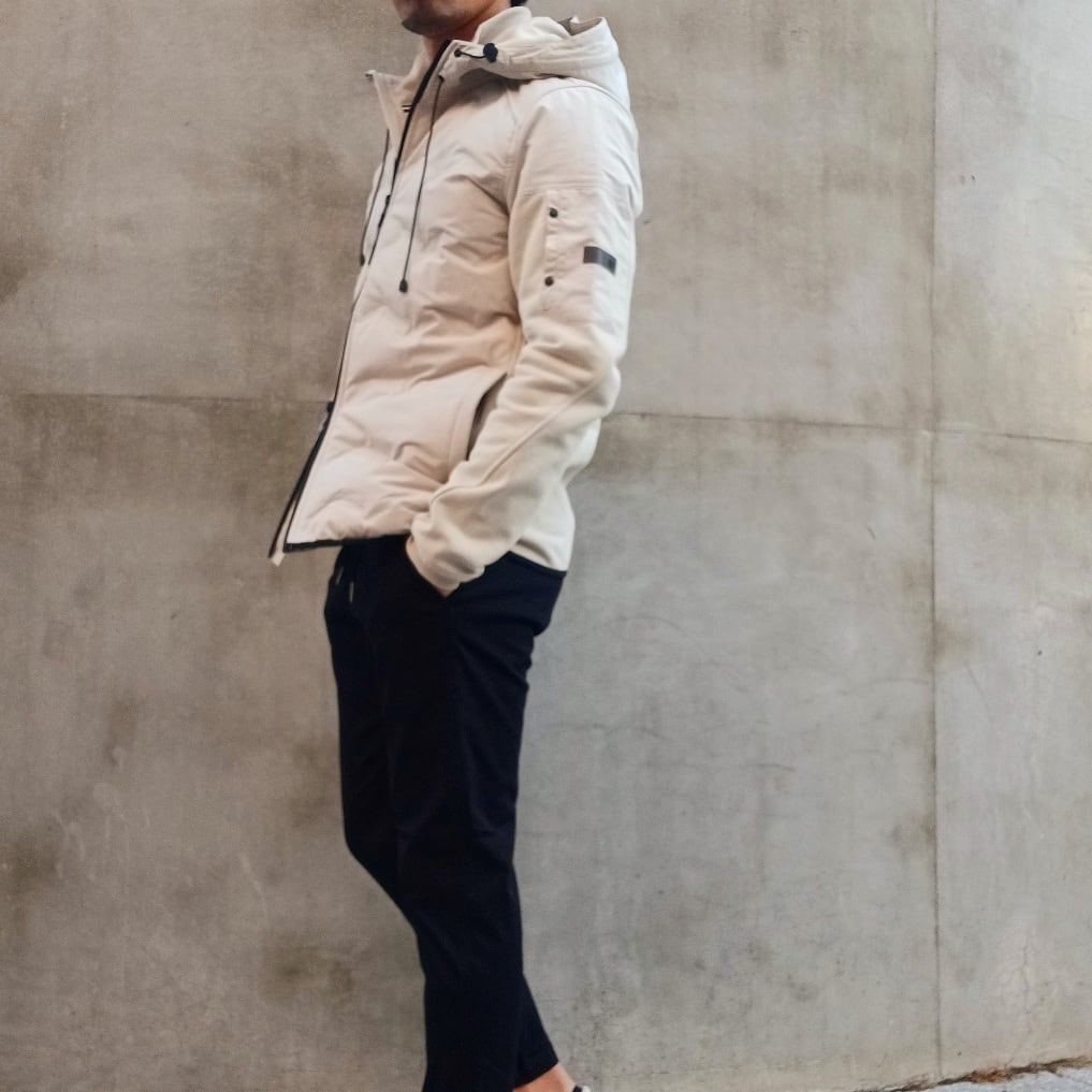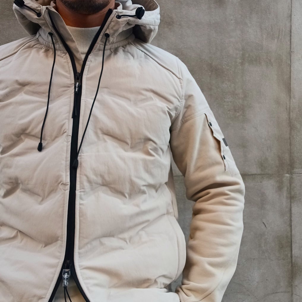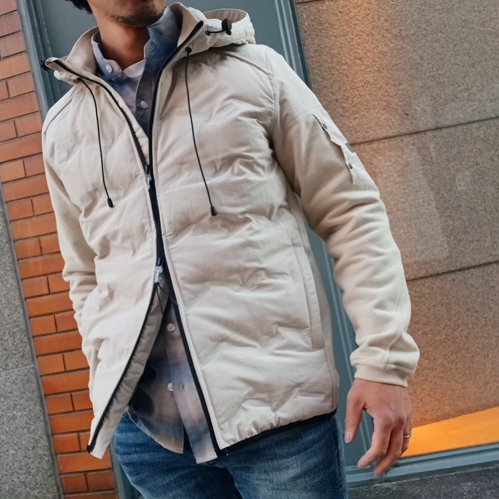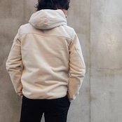 身頃には軽量で丈夫なナイロン素材を使用し、ほどよく中わたを入れることで防寒性を確保しています。後ろ身頃と袖には柔らかなコットン素材を組み合わせ、動きやすさと快適な着心地を叶えた異素材コンビのフード付きブルゾンです。