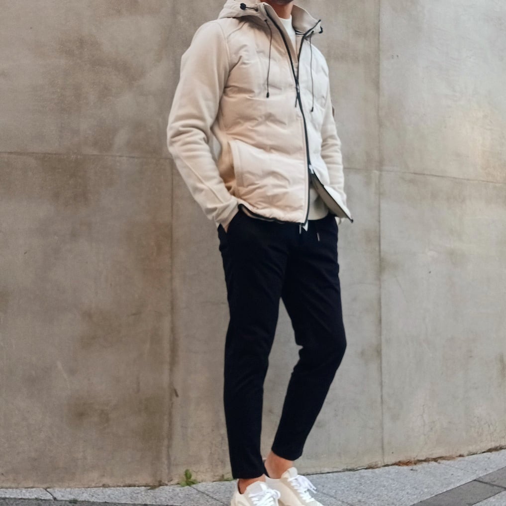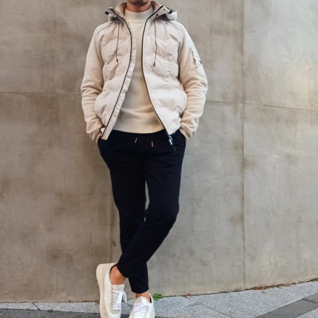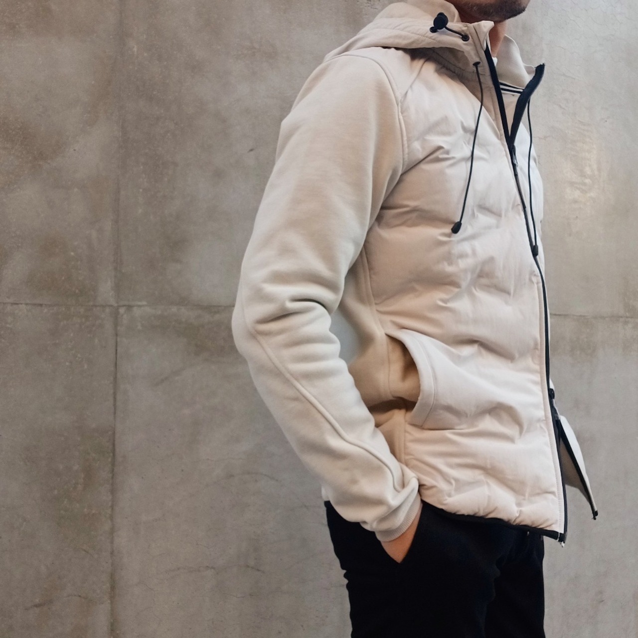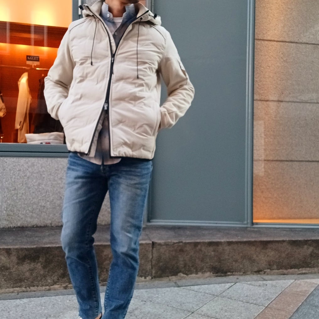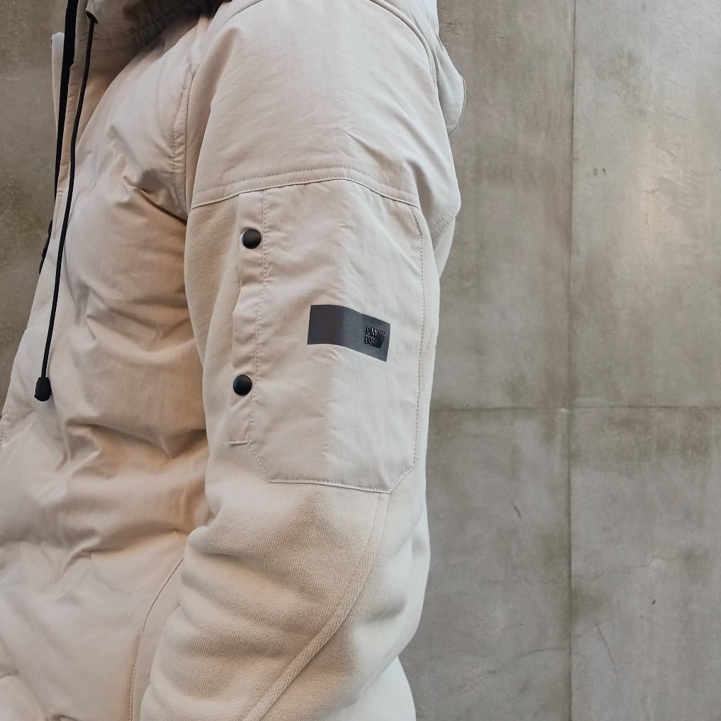 身頃には軽量で丈夫なナイロン素材を使用し、ほどよく中わたを入れることで防寒性を確保しています。後ろ身頃と袖には柔らかなコットン素材を組み合わせ、動きやすさと快適な着心地を叶えた異素材コンビのフード付きブルゾンです。