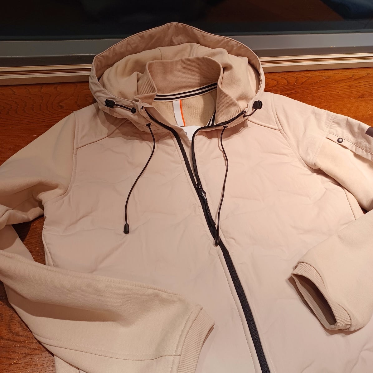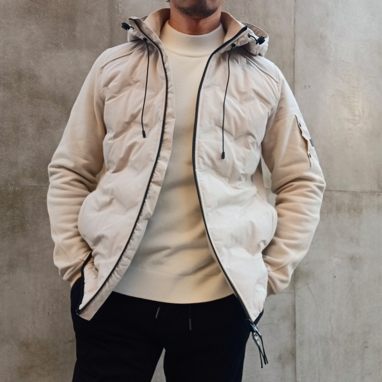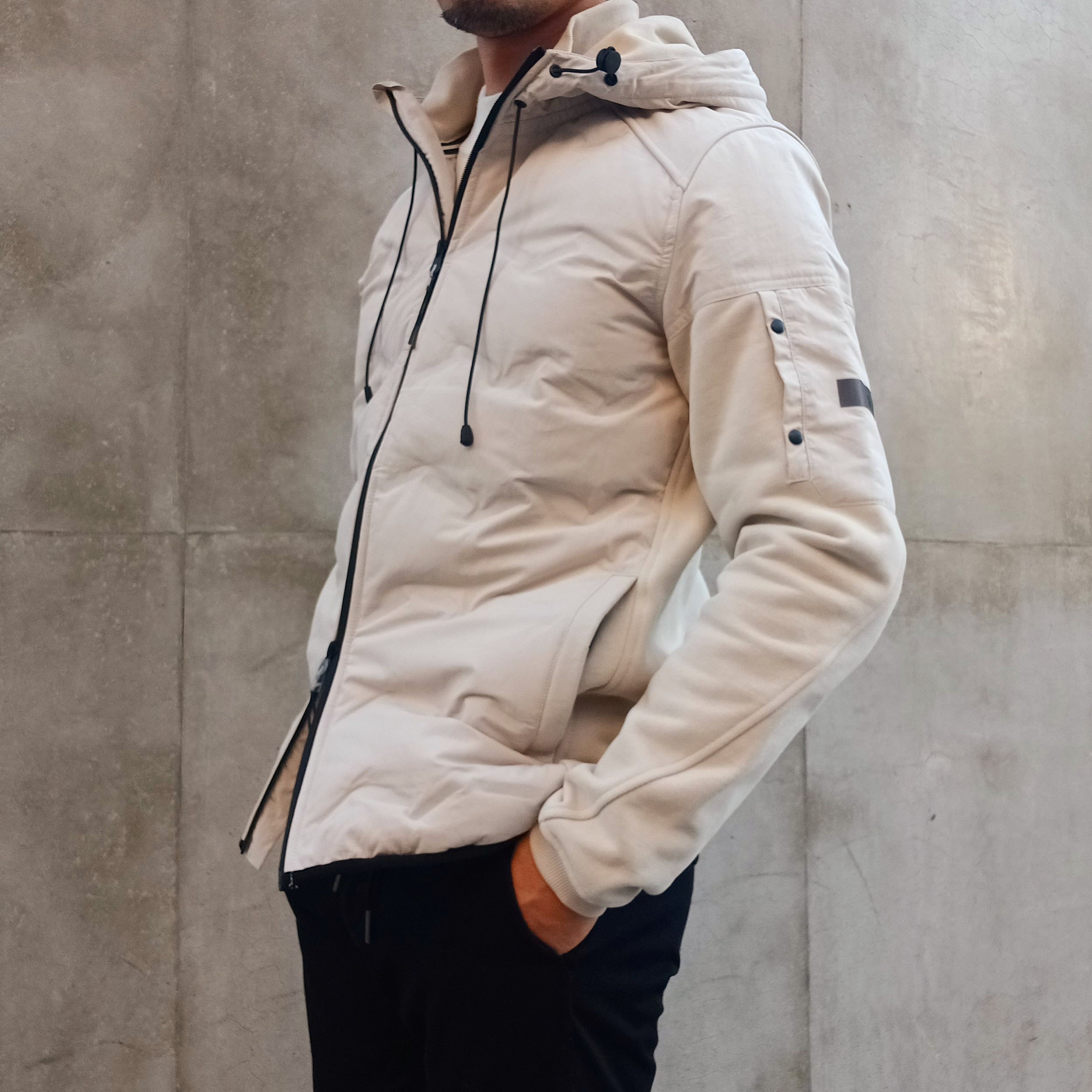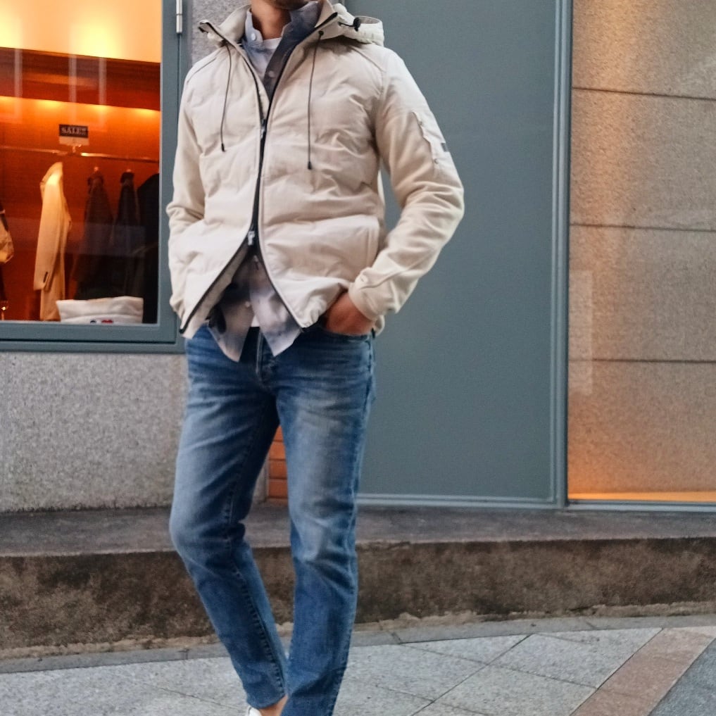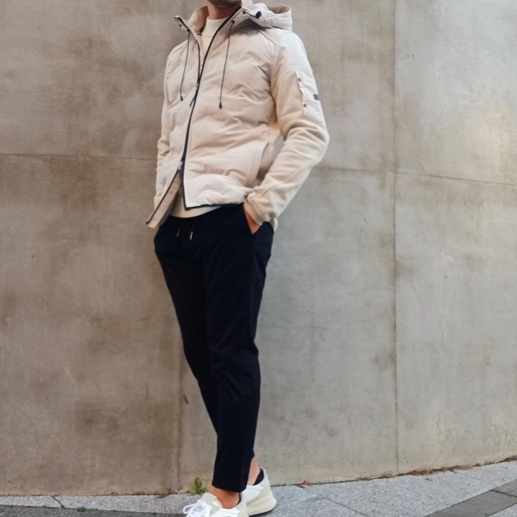 身頃には軽量で丈夫なナイロン素材を使用し、ほどよく中わたを入れることで防寒性を確保しています。後ろ身頃と袖には柔らかなコットン素材を組み合わせ、動きやすさと快適な着心地を叶えた異素材コンビのフード付きブルゾンです。