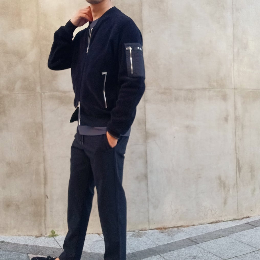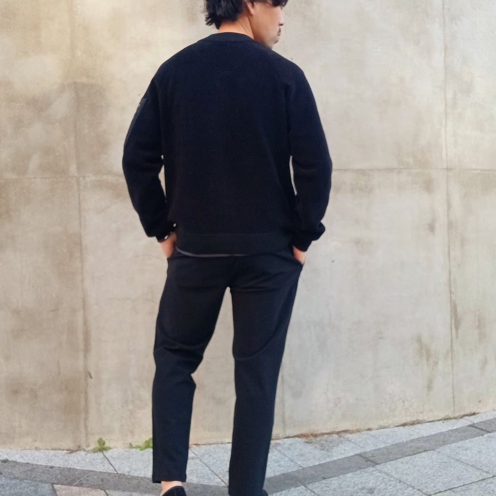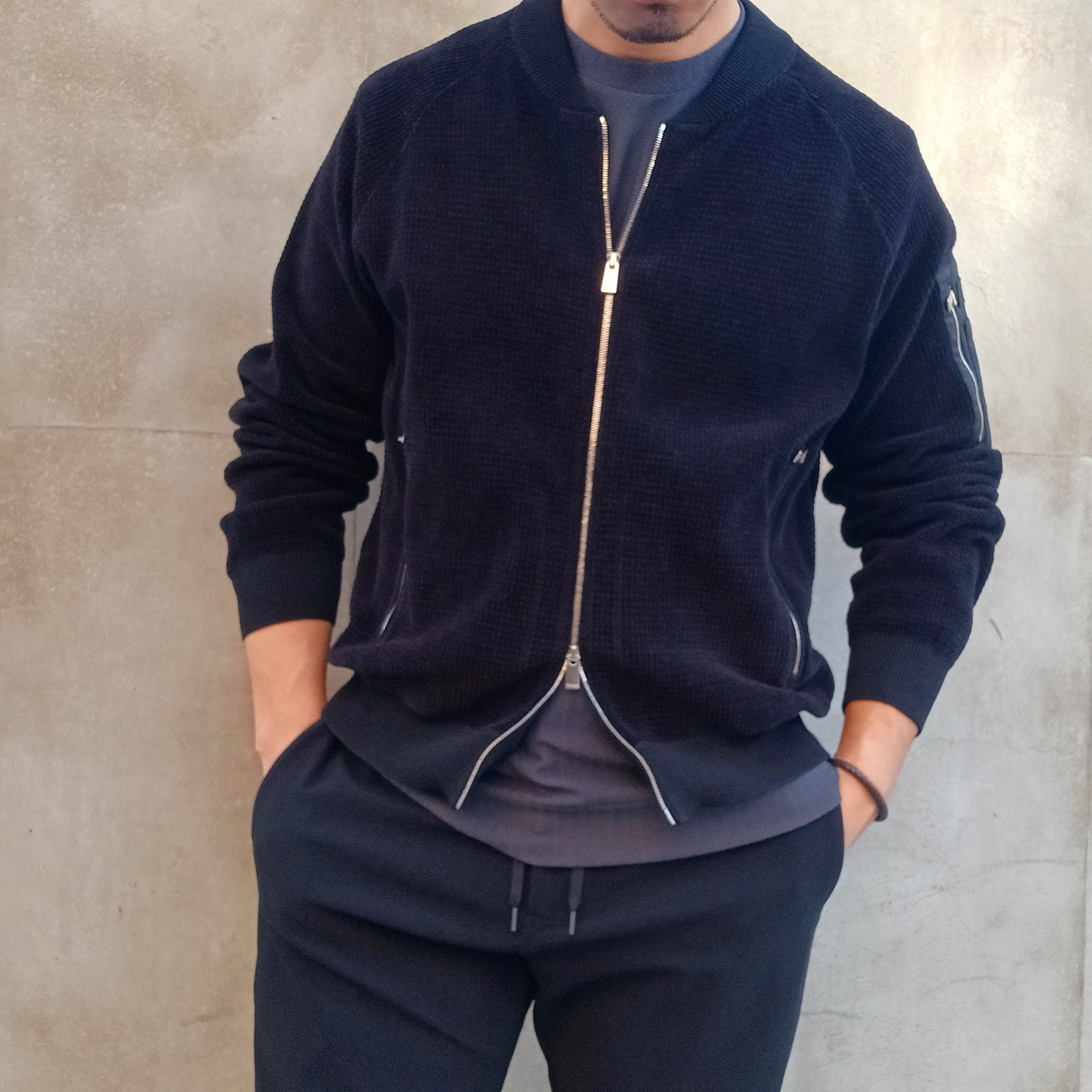 カーディガン感覚で羽織れるMA-1タイプのニットジャケット。ベルベット調の糸を使用しており、ラグジュアリーな風合いが楽しめる1着。袖のシガレットポケットには〈タトラス〉のロゴ刺繍をプラス。ポケット部分にスポーティなナイロン素材を用いて、ディテールまで本格的なMA-1の仕様にこだわったアイテムフ。フロントはダブルジップ仕様で上下開閉が可能。着心地