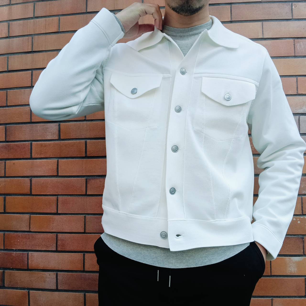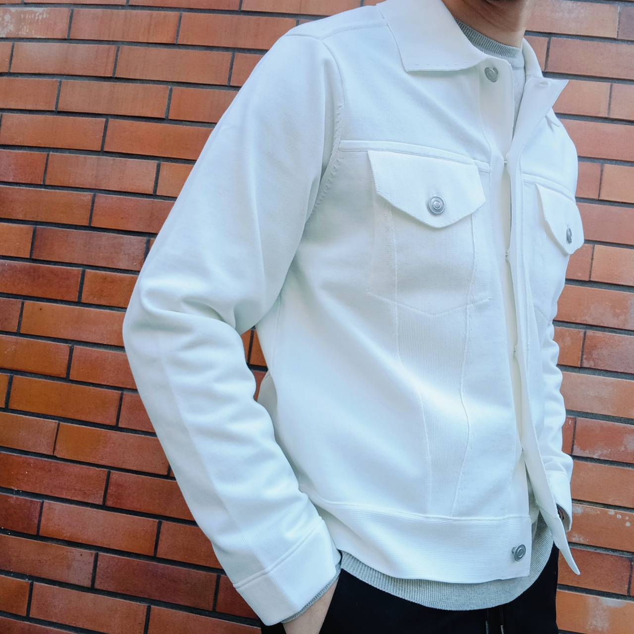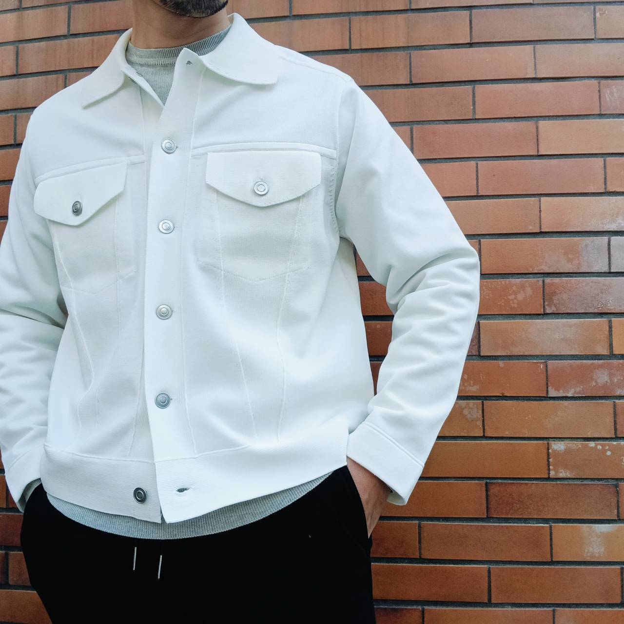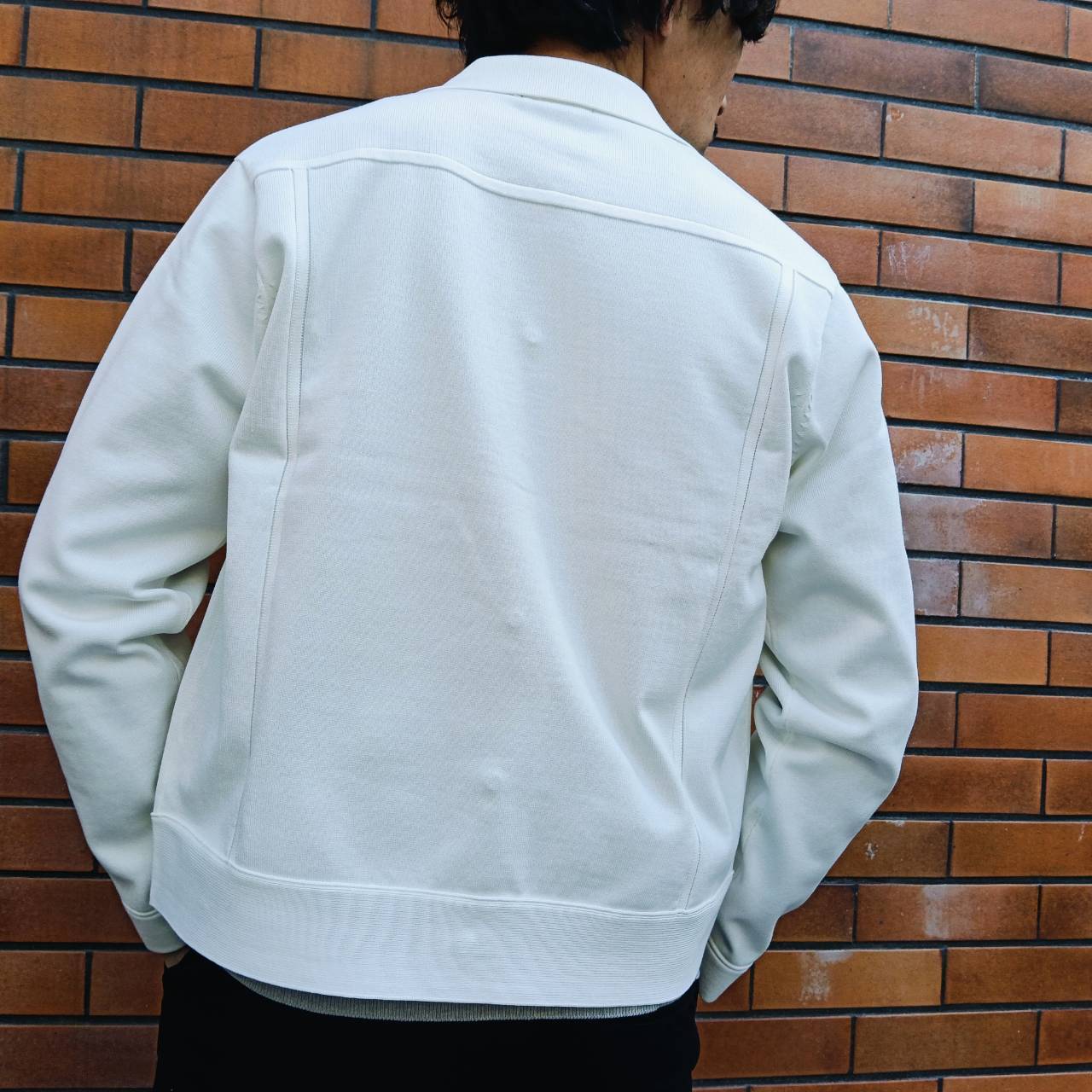 一見すると織物を縫って作製したブルゾンのようにカッチリとした存在感のある表情に仕上げながらも、着心地は「ニット」そのもので、生地が突っ張らずに体になじむ伸縮性やソフトな風合い、軽さなど、快適な着心地が魅力の1着です。表が綿素材で裏がポリエステルの二重編み。綿だけだとダラけてしまうのを裏のポリエステルがカバーしているので良い具合にハリコシが出て形をキープしてくれます。また、程よく厚みがあるため高級感もありライトアウターぐらいの保温感もございます。見栄えも良ければ着こなしやすさも◎非常にこの春いや年間通して活躍してくれそうです。