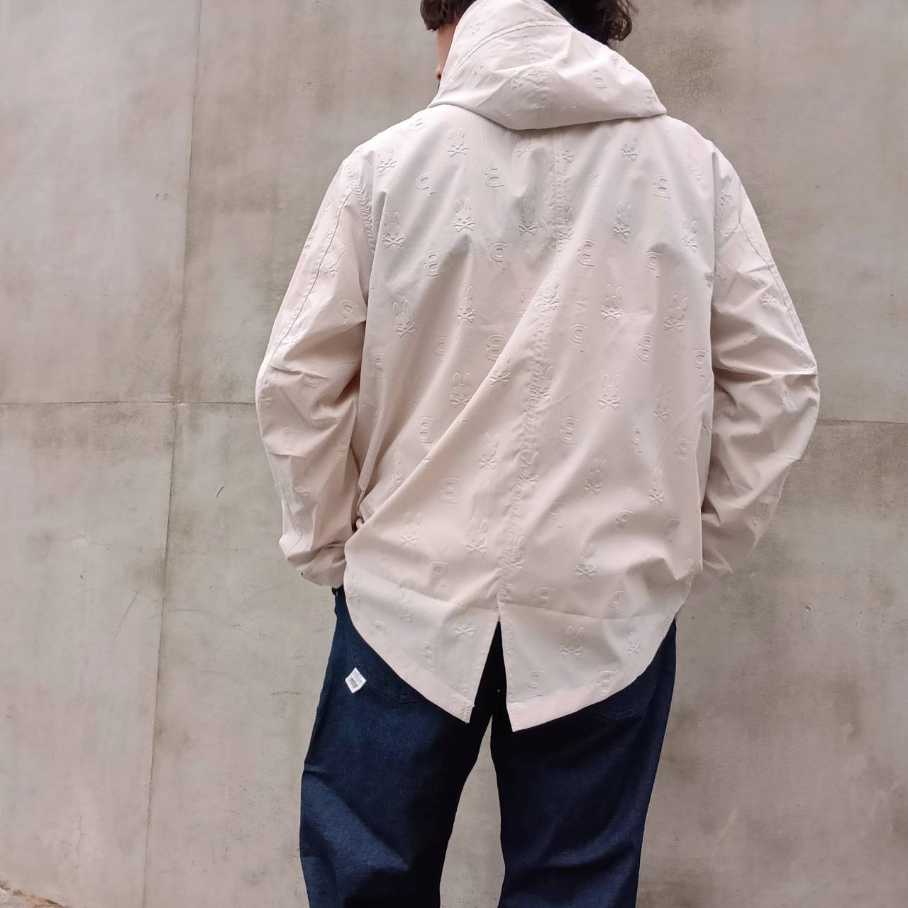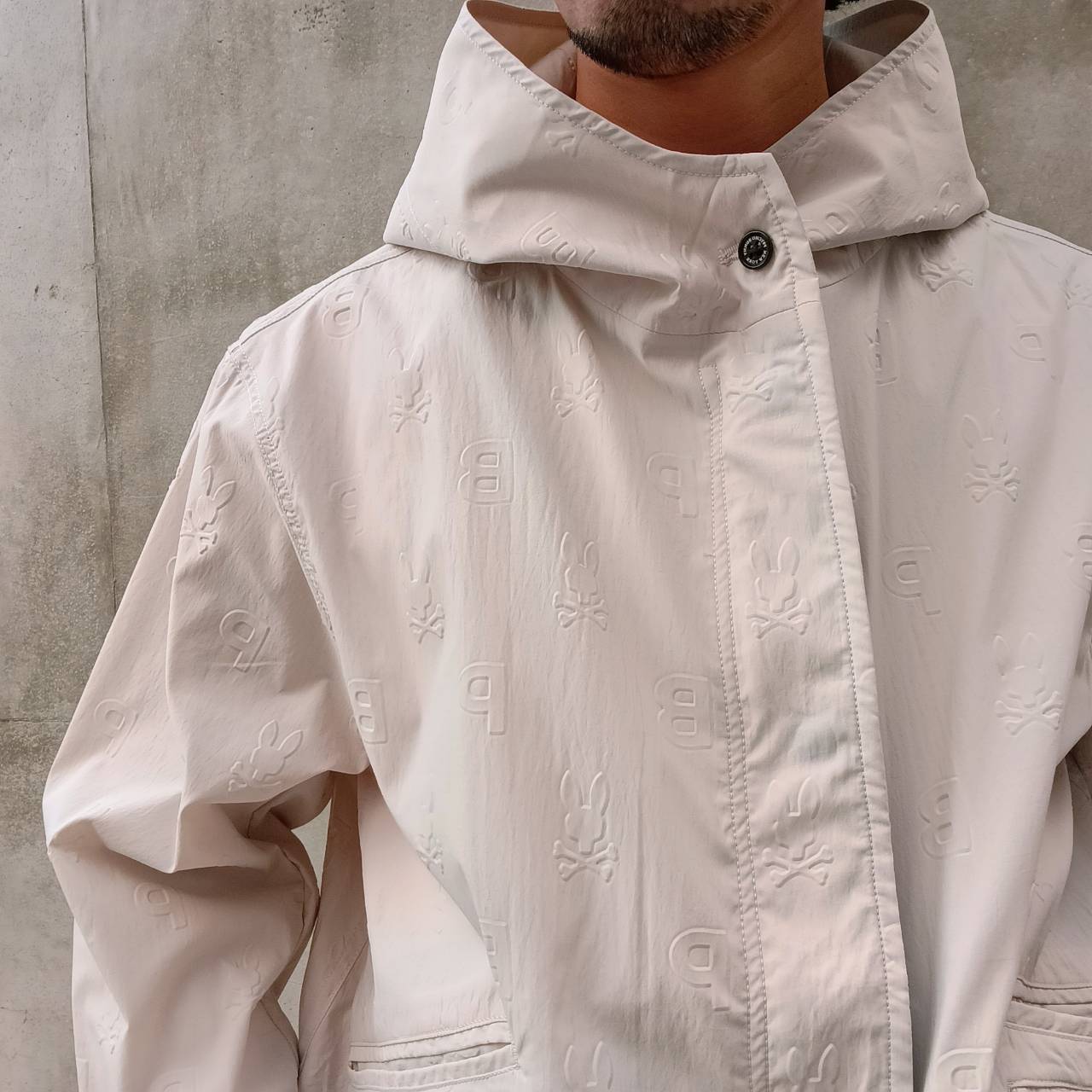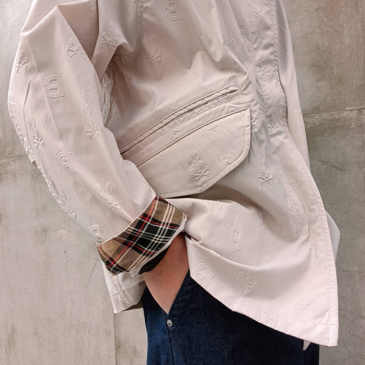 表面全体にエンボス加工でロゴを施した、サイコバニー初のショート丈モッズコートです。