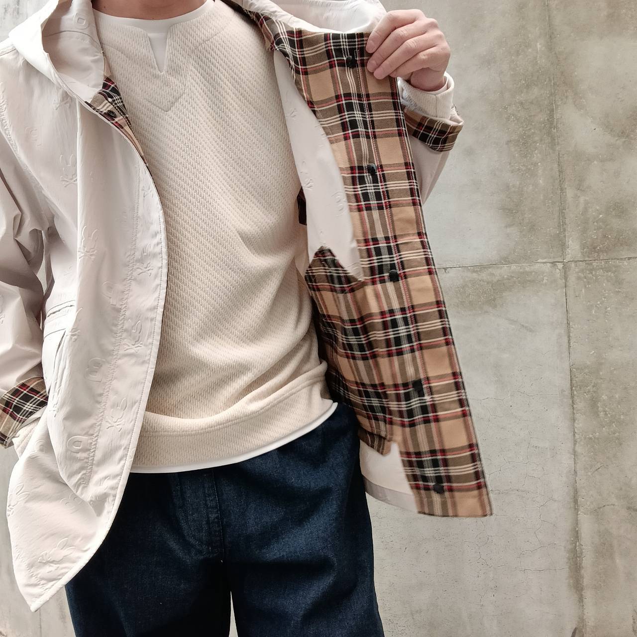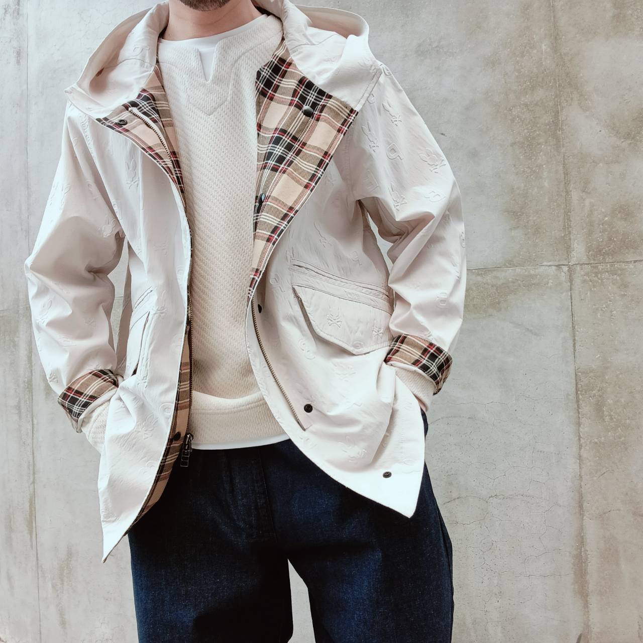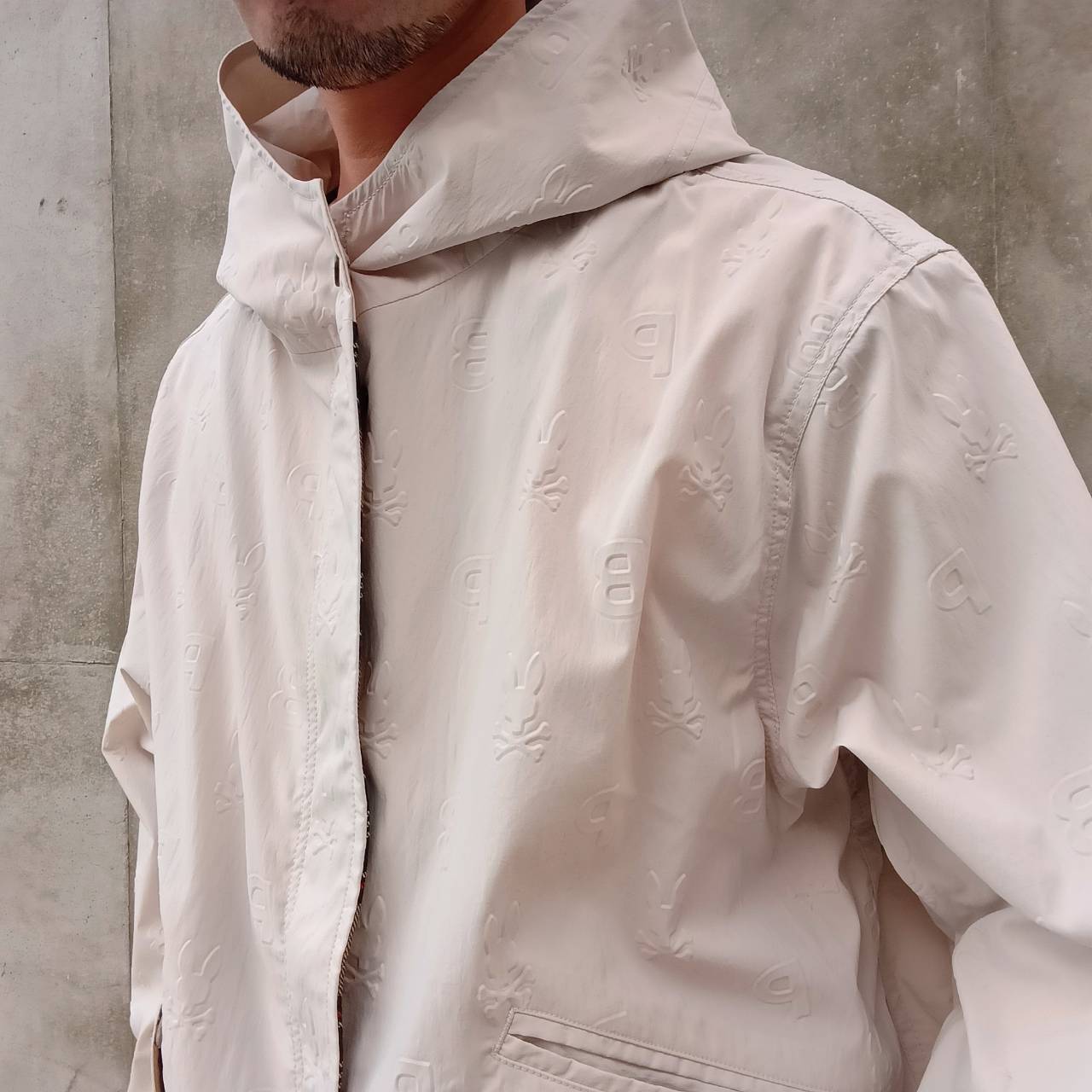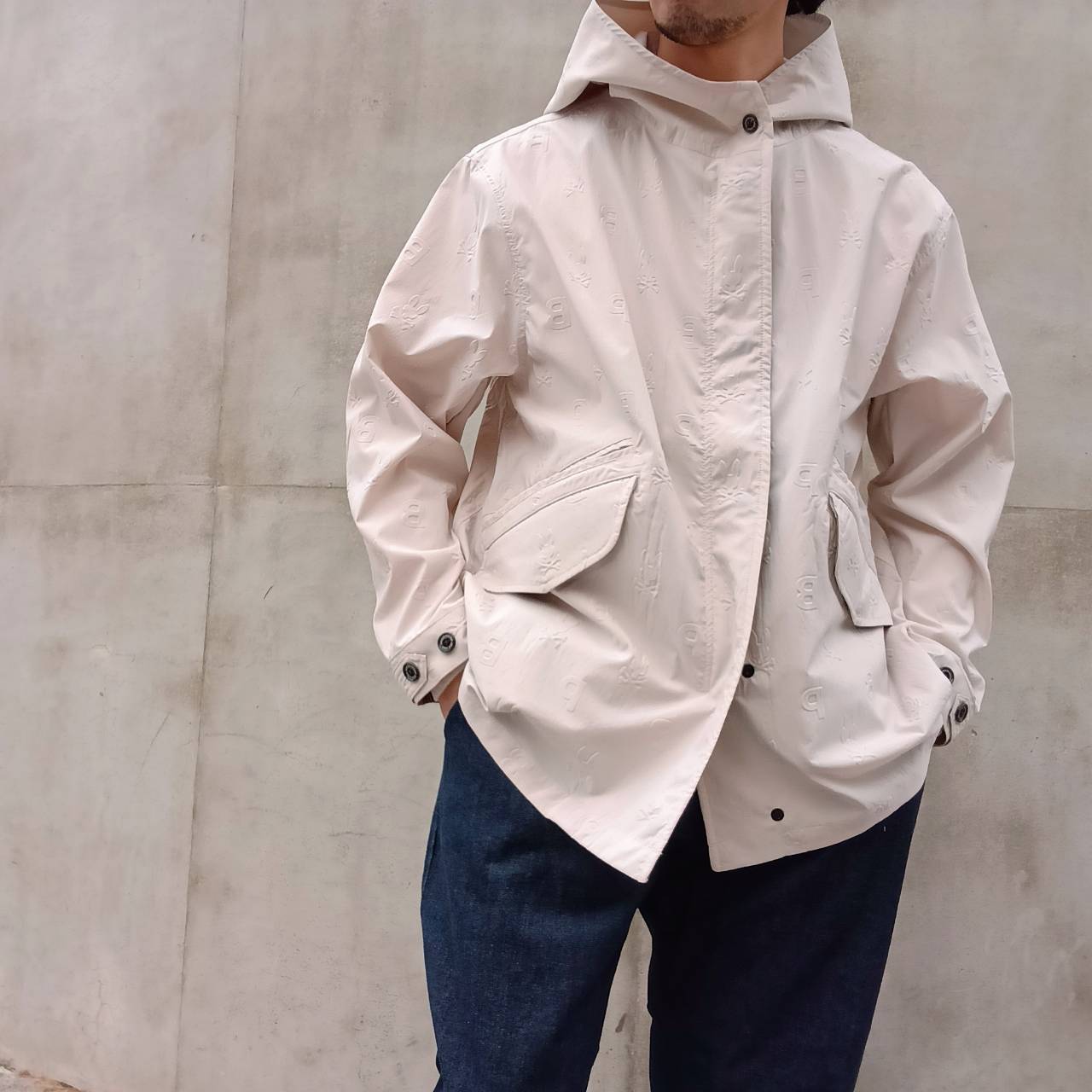 表面全体にエンボス加工でロゴを施した、サイコバニー初のショート丈モッズコートです。