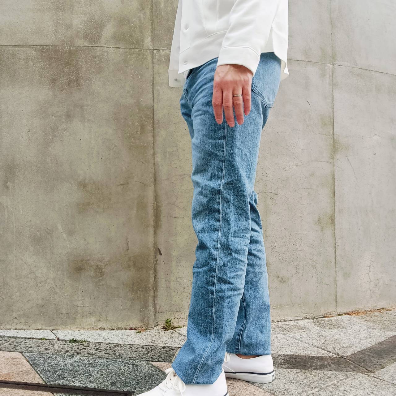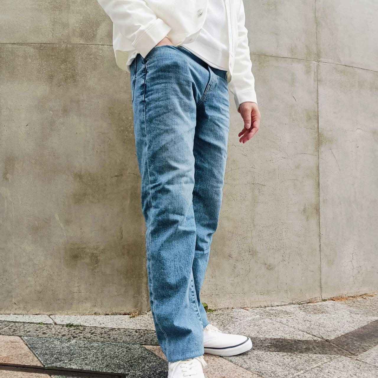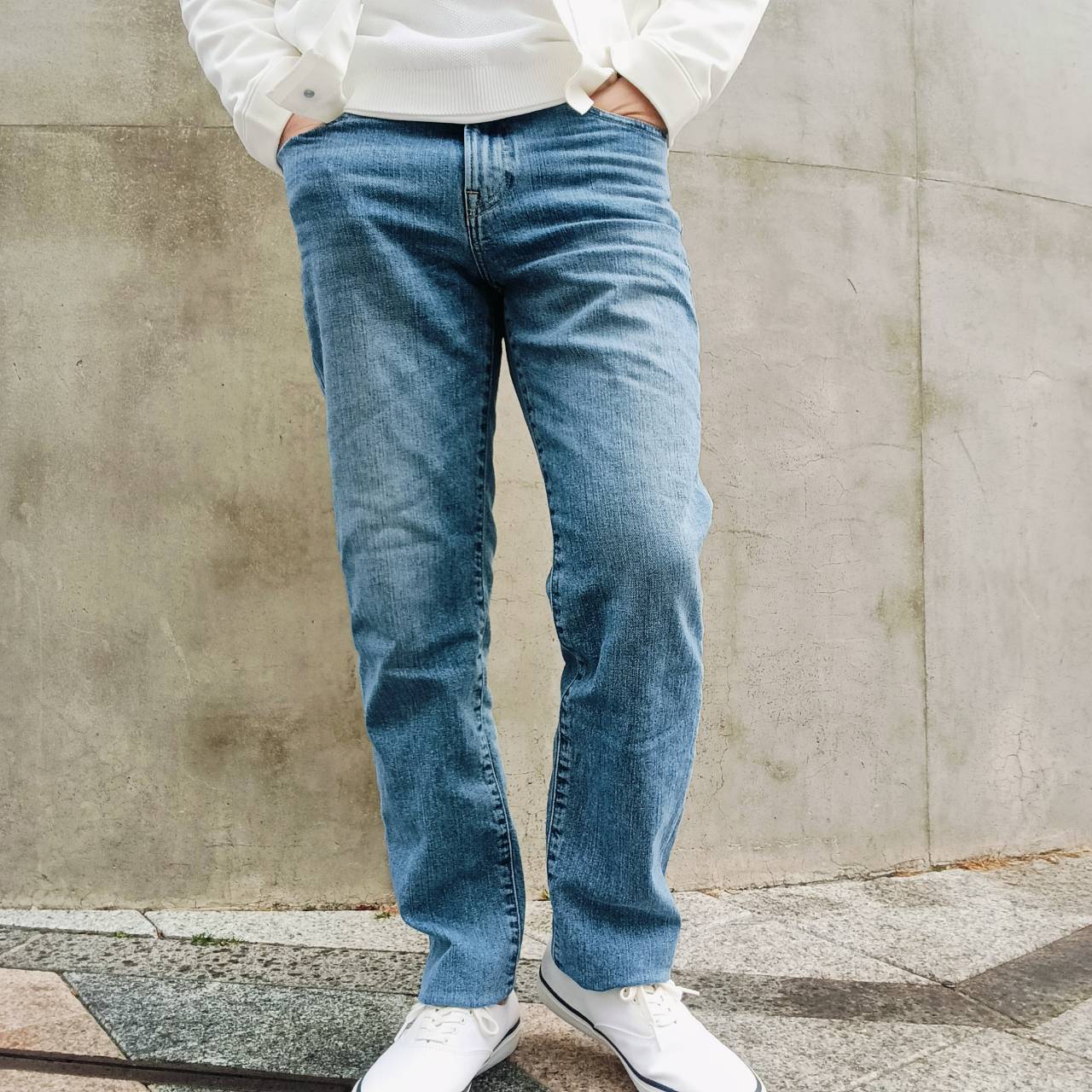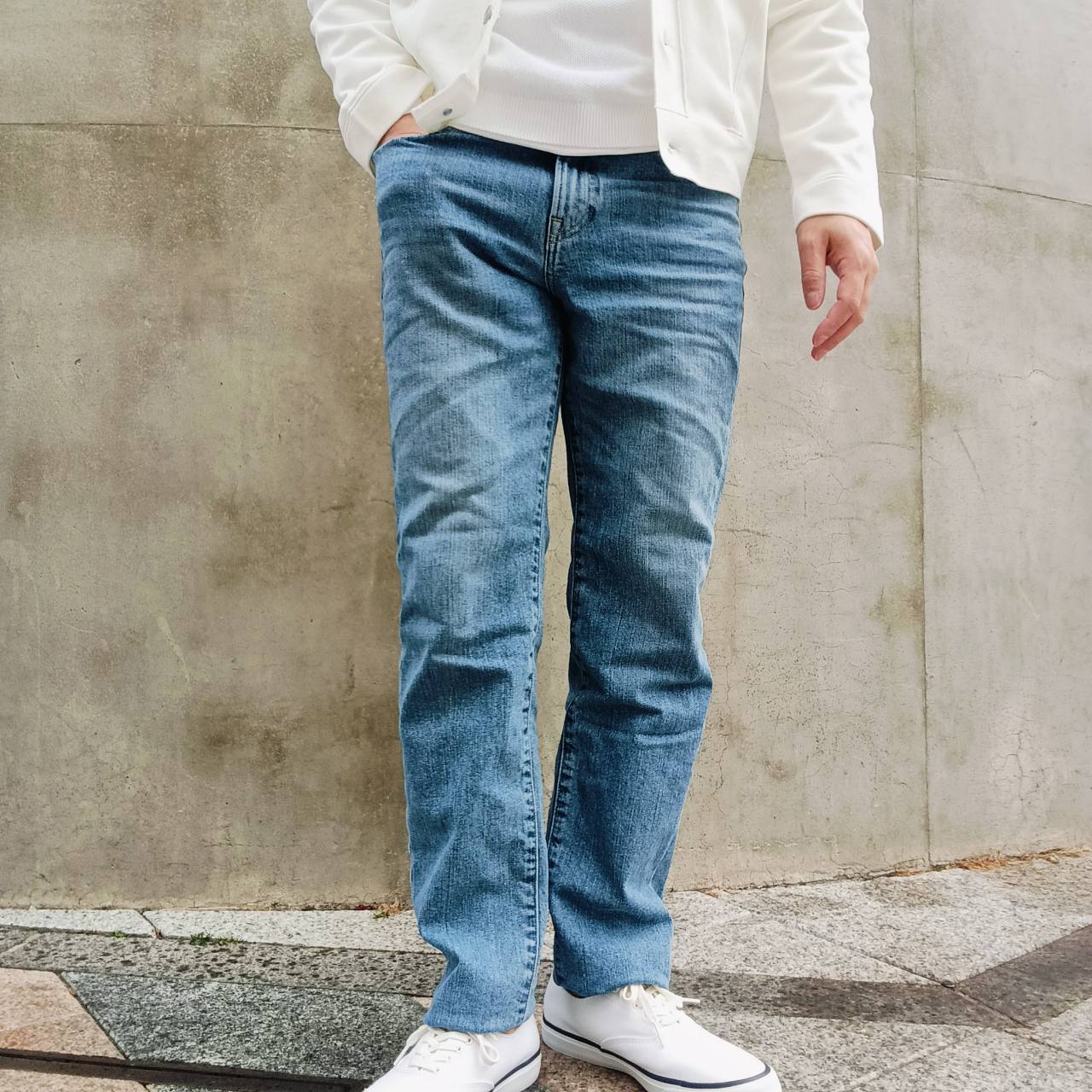 股上を少し長めに取り、足長効果のある、大人ストレートシルエット。