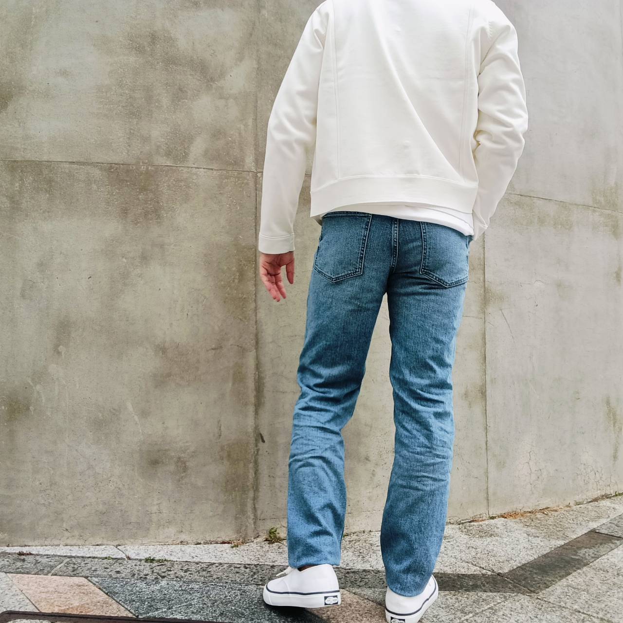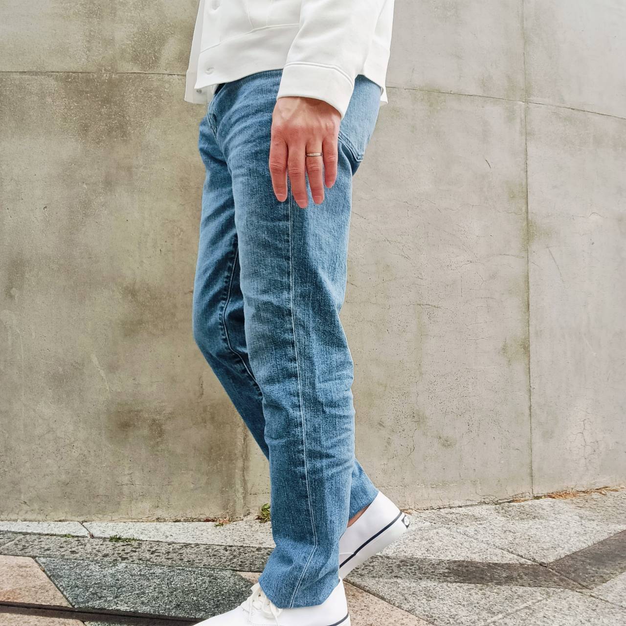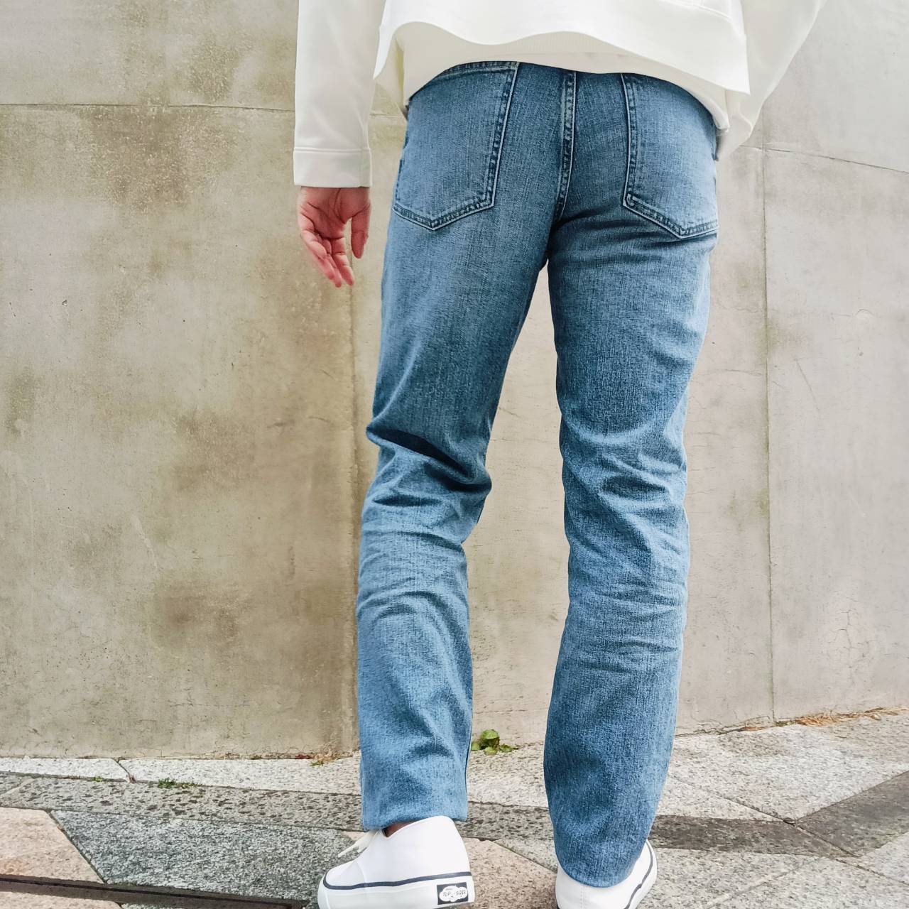 股上を少し長めに取り、足長効果のある、大人ストレートシルエット。