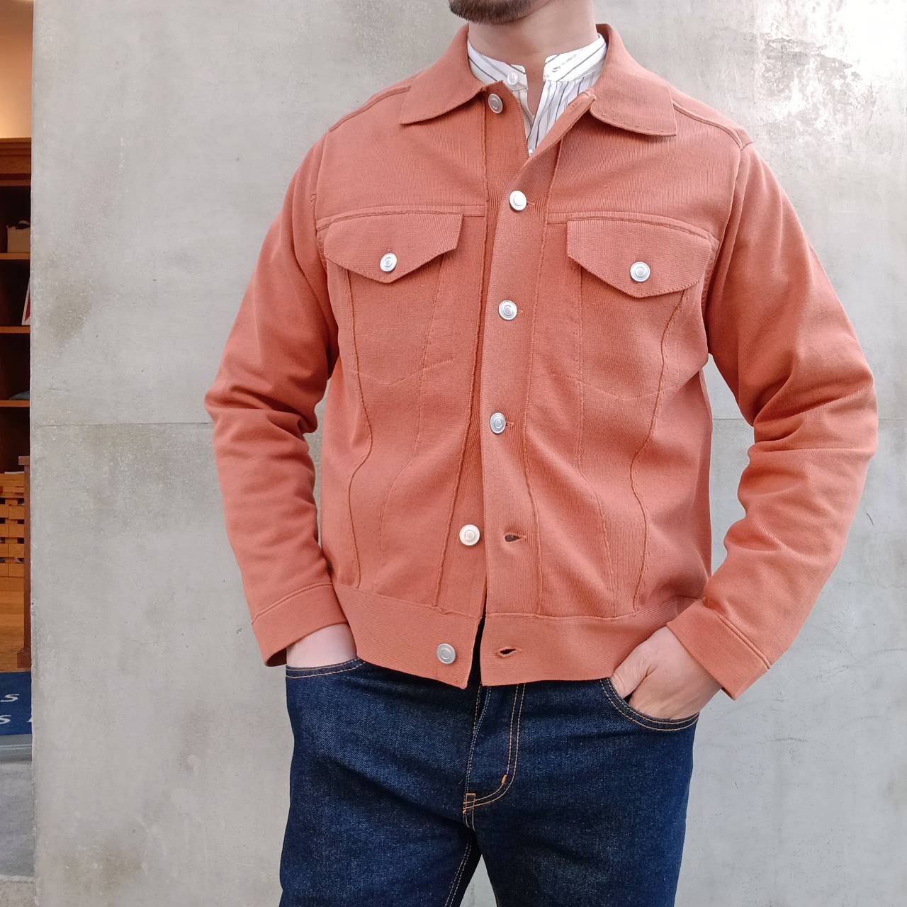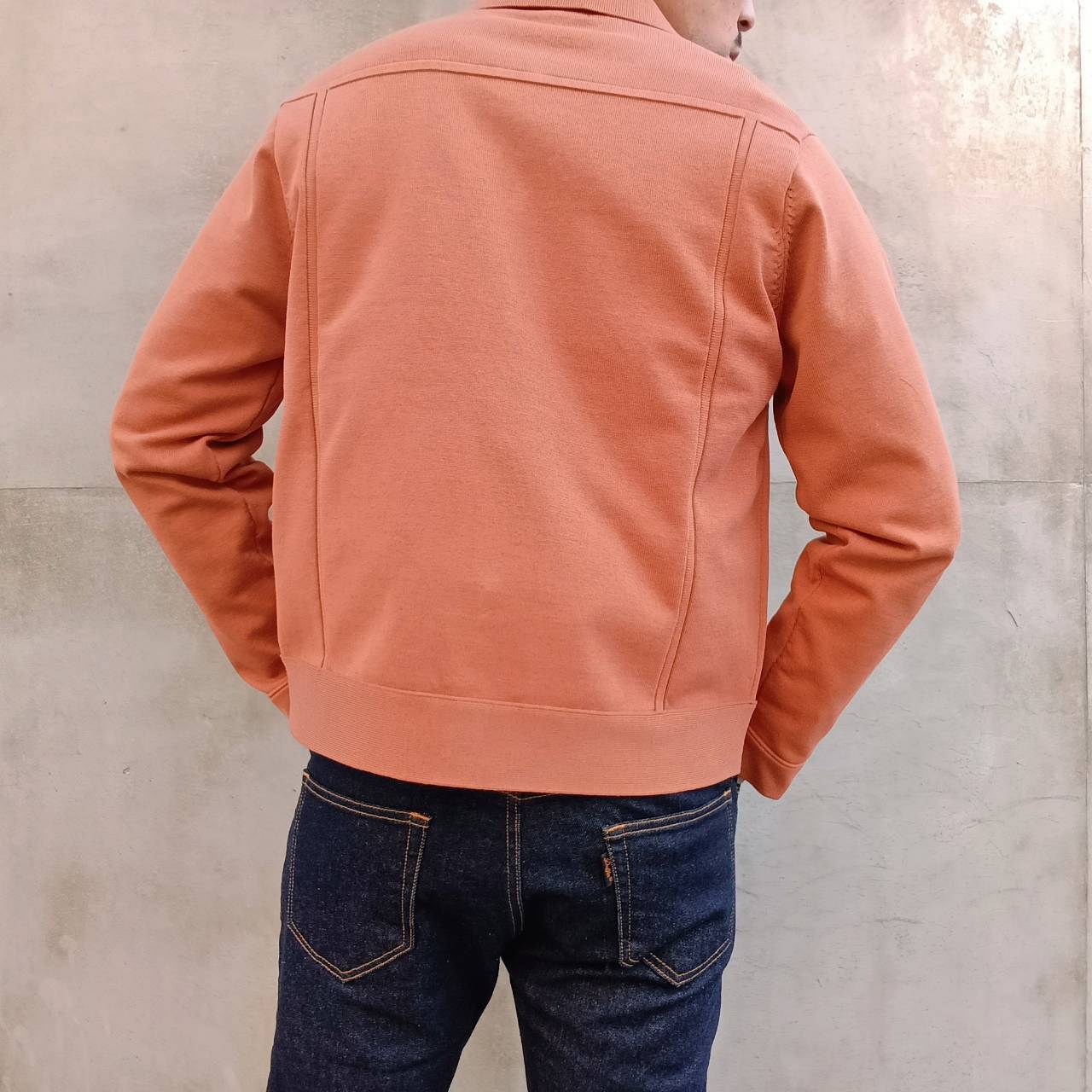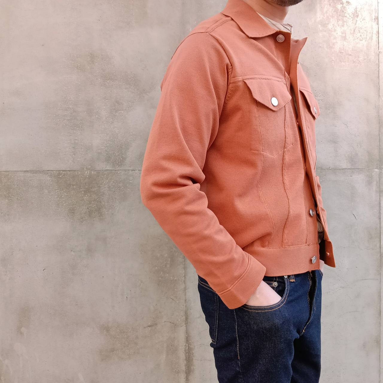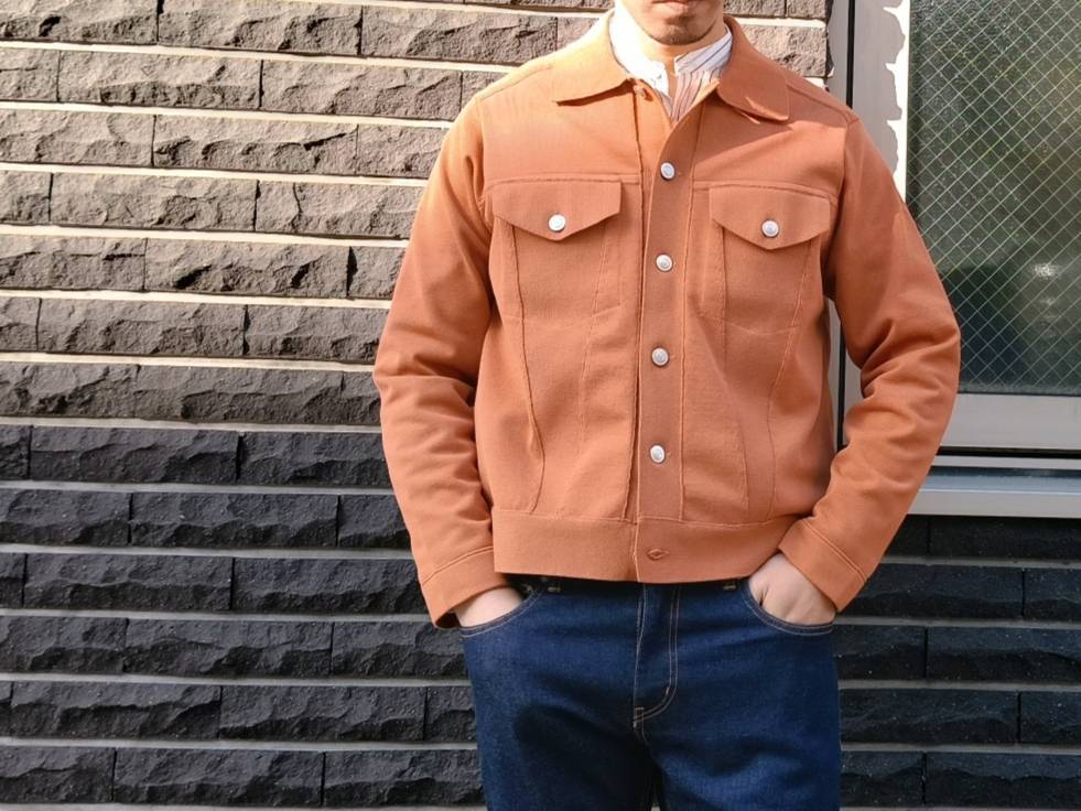 一見すると織物を縫って作製したブルゾンのようにカッチリとした存在感のある表情に仕上げながらも、着心地は「ニット」そのもので、生地が突っ張らずに体になじむ伸縮性やソフトな風合い、軽さなど、快適な着心地が魅力の1着です。表が綿素材で裏がポリエステルの二重編み。綿だけだとダラけてしまうのを裏のポリエステルがカバーしているので良い具合にハリコシが出て形をキープしてくれます。また、程よく厚みがあるため高級感もありライトアウターぐらいの保温感もございます。見栄えも良ければ着こなしやすさも◎非常にこの春いや年間通して活躍してくれそうです。