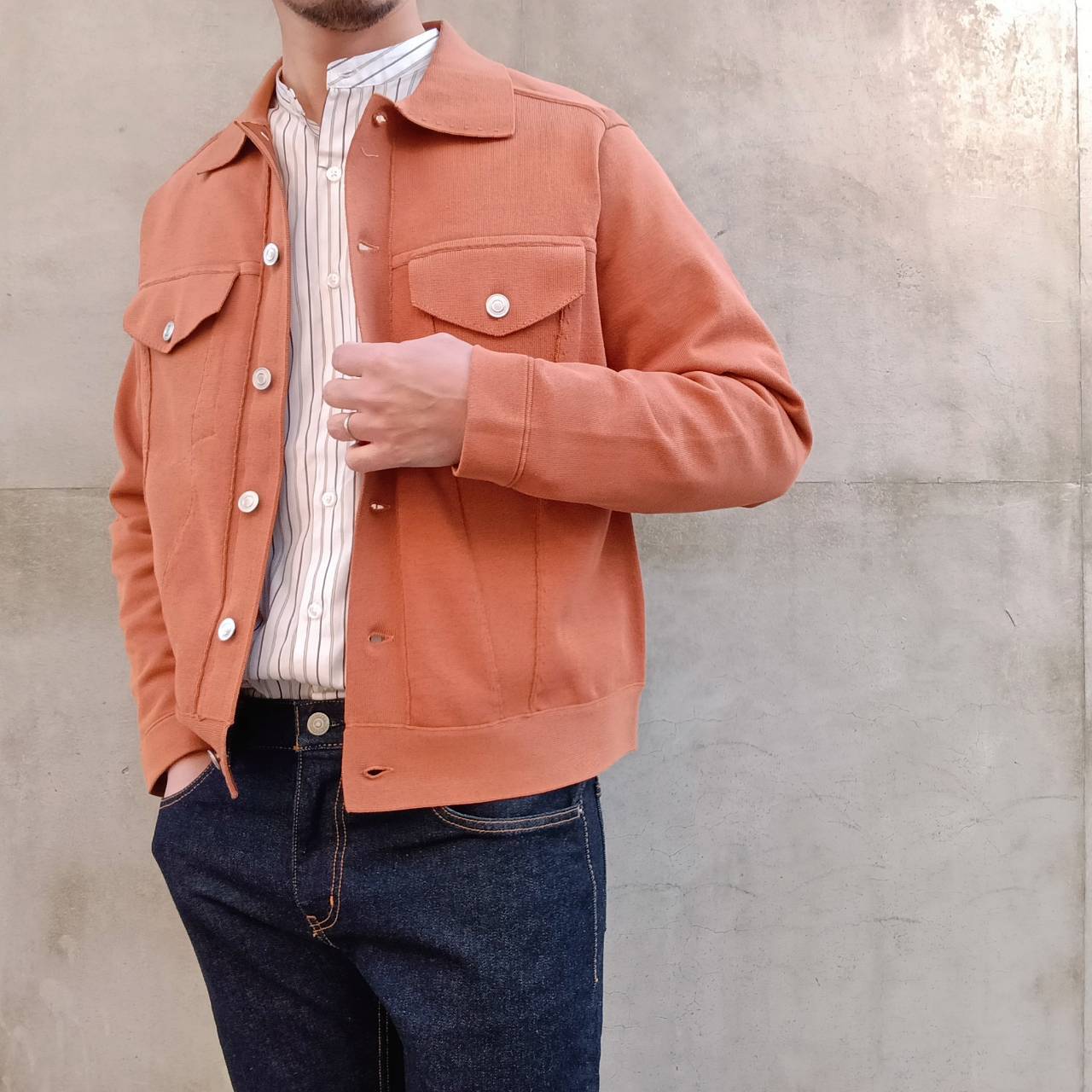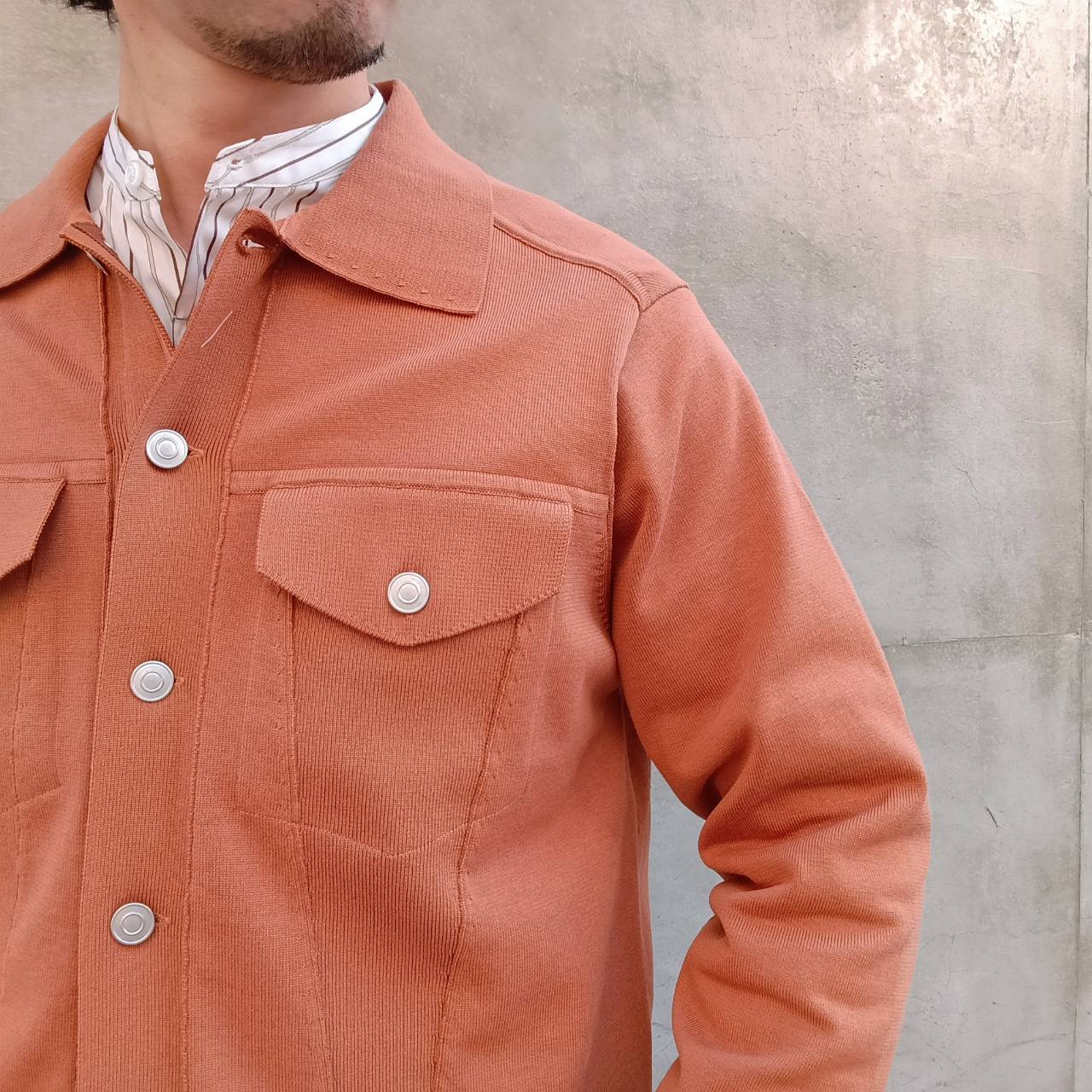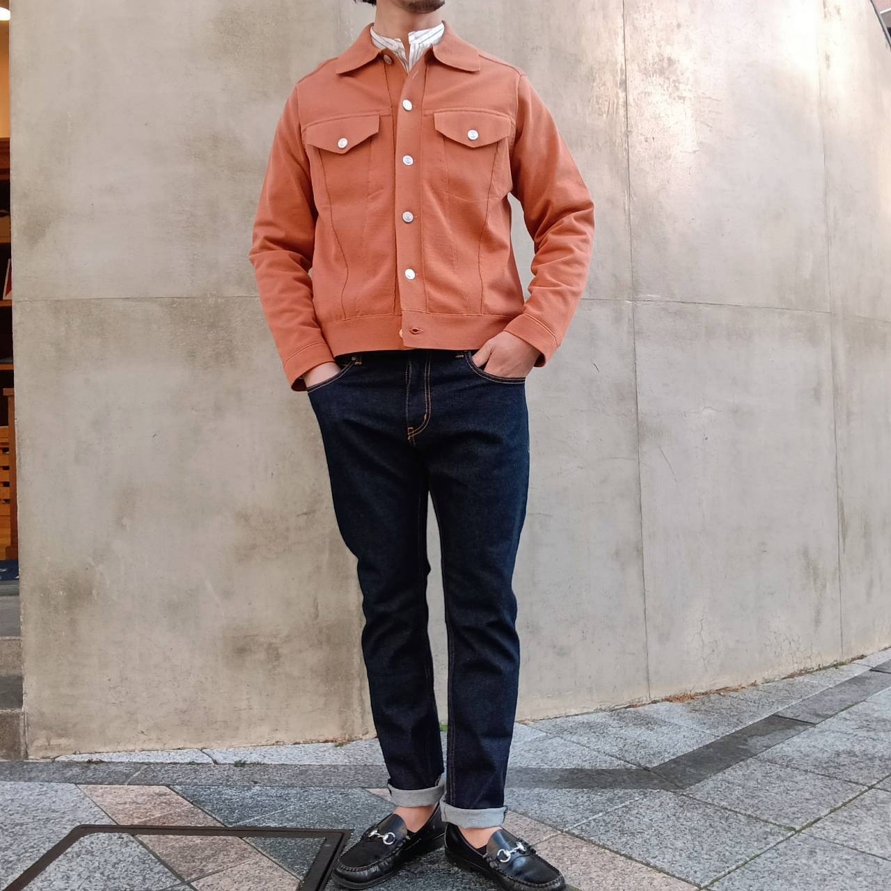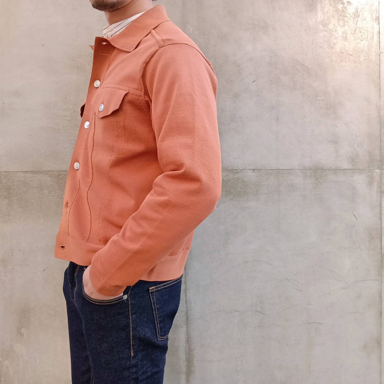 一見すると織物を縫って作製したブルゾンのようにカッチリとした存在感のある表情に仕上げながらも、着心地は「ニット」そのもので、生地が突っ張らずに体になじむ伸縮性やソフトな風合い、軽さなど、快適な着心地が魅力の1着です。表が綿素材で裏がポリエステルの二重編み。綿だけだとダラけてしまうのを裏のポリエステルがカバーしているので良い具合にハリコシが出て形をキープしてくれます。また、程よく厚みがあるため高級感もありライトアウターぐらいの保温感もございます。見栄えも良ければ着こなしやすさも◎非常にこの春いや年間通して活躍してくれそうです。