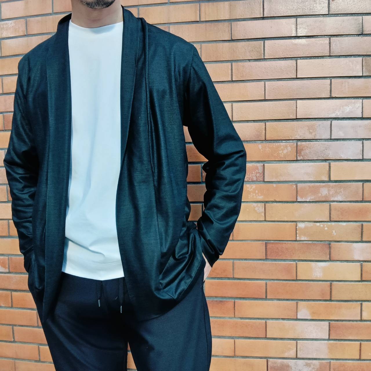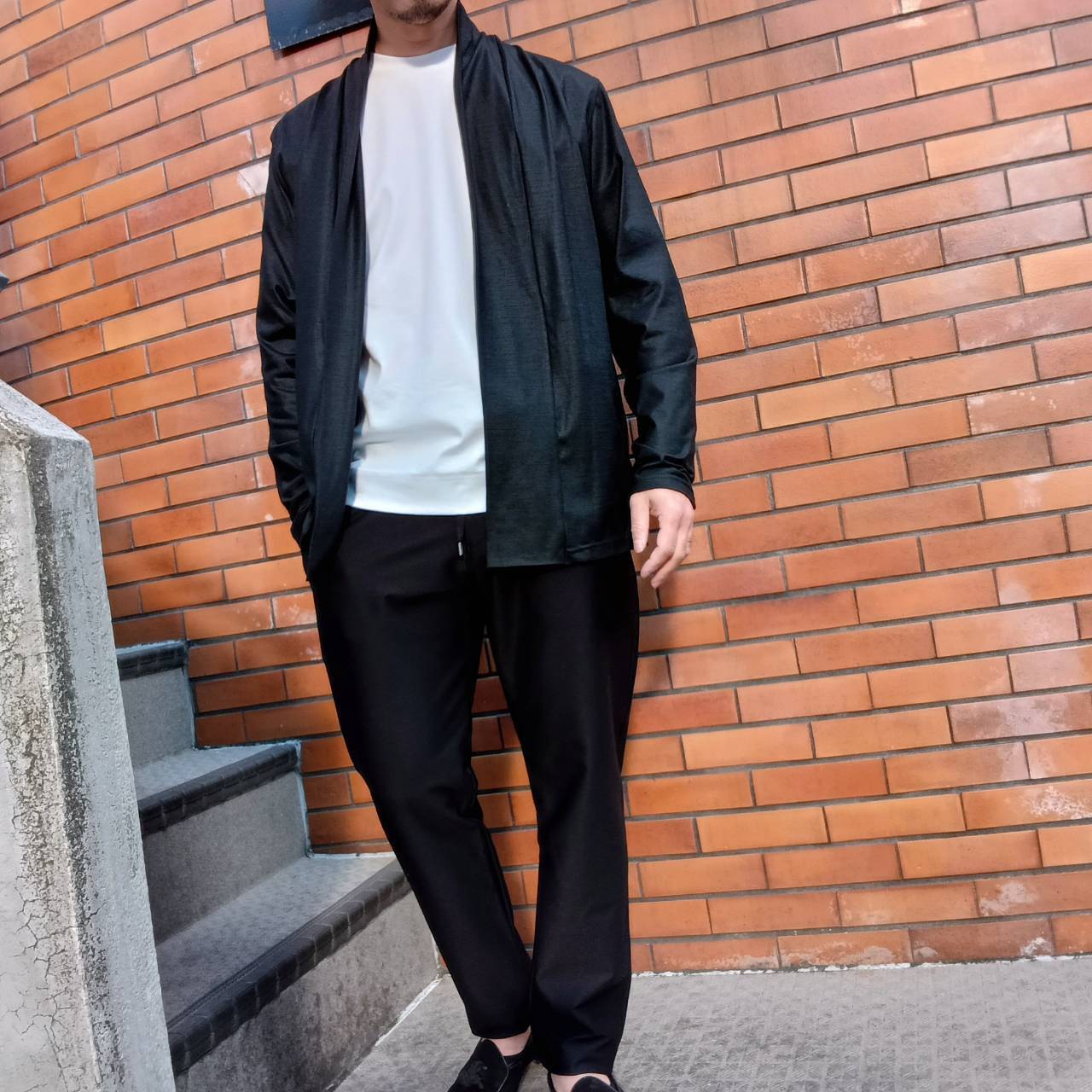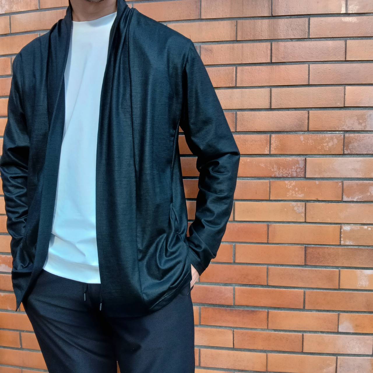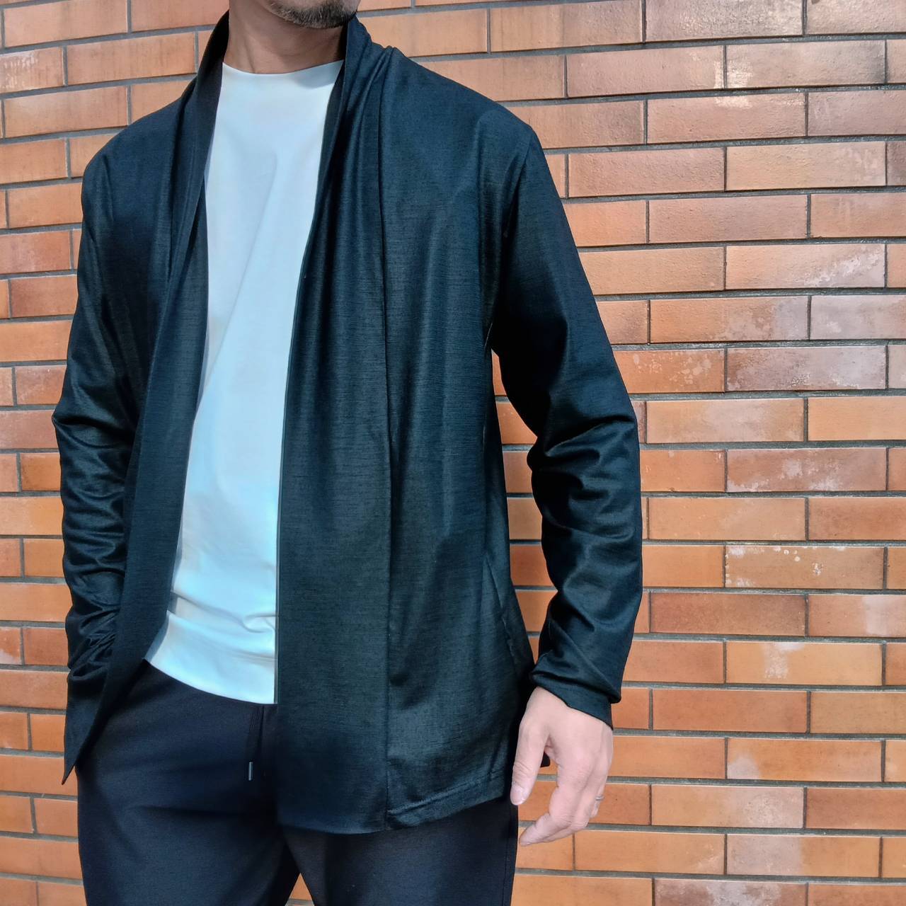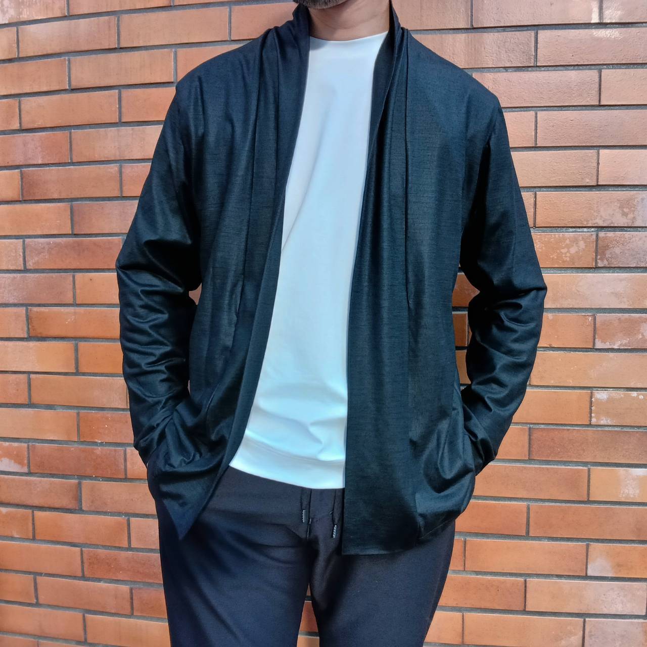 32G 1/60 SZ天竺。高級な極細で柔らかい原毛を使用したサマーウール天竺。プロテインウォッシャブル加工を施すことでウール特有のチクチク感をなくし、滑らかな肌触りを実現しています。糸加工を施してから編み立てることで、生地コーティングには無い伸縮性があり、高級メリノウール(16.5マイクロン)ならではの繊維の機能を保つことができるのも特徴の一つです。上記の素材を使用したサマーウールカーディガン。ウール本来の特性である優れた吸湿発散、通気性による特性を活かした、春~夏の羽織アイテムとして最適な新提案シリーズ。サラッと羽織れるボタンレスカーディガン。ミドル丈とすることで、スタイリングアイテムとして汎用性のあるデザインに仕上げた。wjk定番シームラインをリブ編み素材で切り替えることで、ブランドらしいアクセントを加えている。素材の良さを活かしたミニマルデザイン。上質なウールジャージー素材を掛け合わせることで生まれる絶妙なドレープによる光沢感が、より存在感を引き立てる一着に仕上がっている。