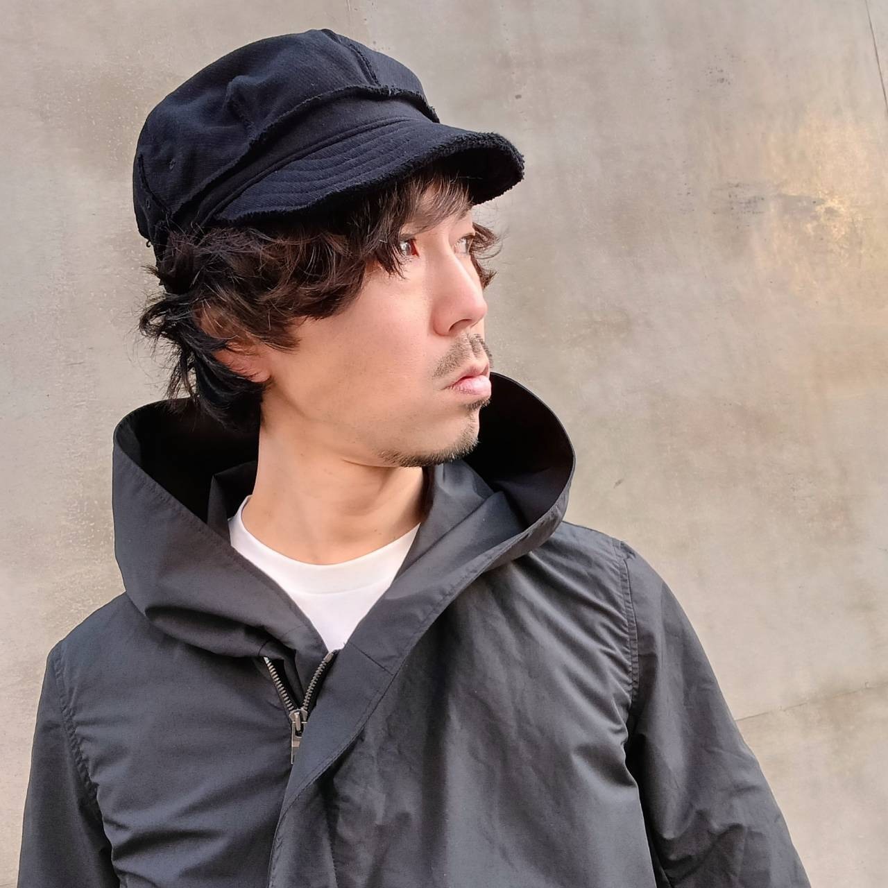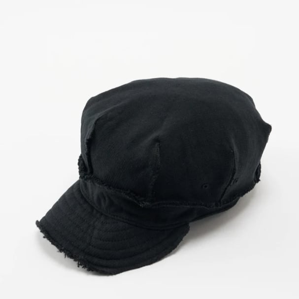 wjkのベストセラーアイテムであるワークキャップ。クラウンをワンピースで取った特徴的なパターン、全体に裁切りを残した無骨感を全面に打ち出したデザイン。着用することで自然なカーブができるよう計算された芯なしブリム。長さを短めに設定することでより大人の雰囲気を演出。素材は着用感を追求したミディアムジャージ。柔らかな被りに加え、着用者それぞれの頭部に馴染みやすい素材。内側の「すべり」をパイル生地にする事で着用時のフィット感や汗止めといった機能面にも一役かっている。内側の「すべり」裏のアジャスターテープにより、頭回りの広さを調整可能。ブラックカラーはブランドととしての核である色「黒」をより追求し、老舗の染工場「京都紋付」にて「深黒染め」を依頼。国内に3件しか残っていないといわれる紋付袴の着物の黒染めを創業以来100年にわたって行ってきた。紋付袴のキモである「より深い黒」に染める加工を現代の服に落とし込み、wjkが長年求めてきた「真っ黒」を表現するとともに、よりソフトで滑らかな素材感を実現した。