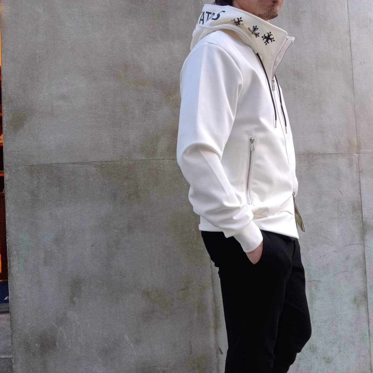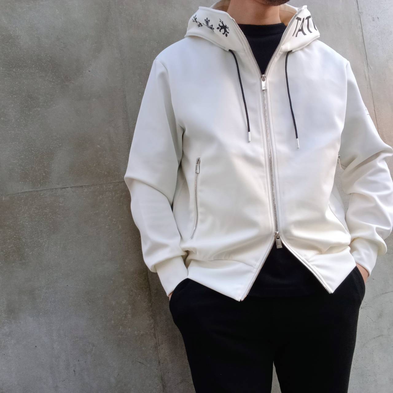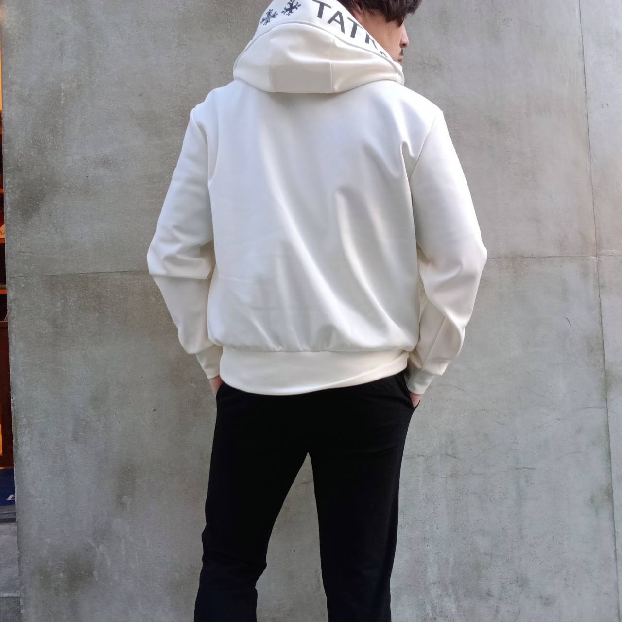 リラックス感のあるシルエットと、動きやすいストレッチ素材で快適な着心地に仕上がっています。フード部分は形が崩れないようしっかりスタンドする設計仕様。シルバーメッキのファスナーがTATRASらしい高級感を演出しています。