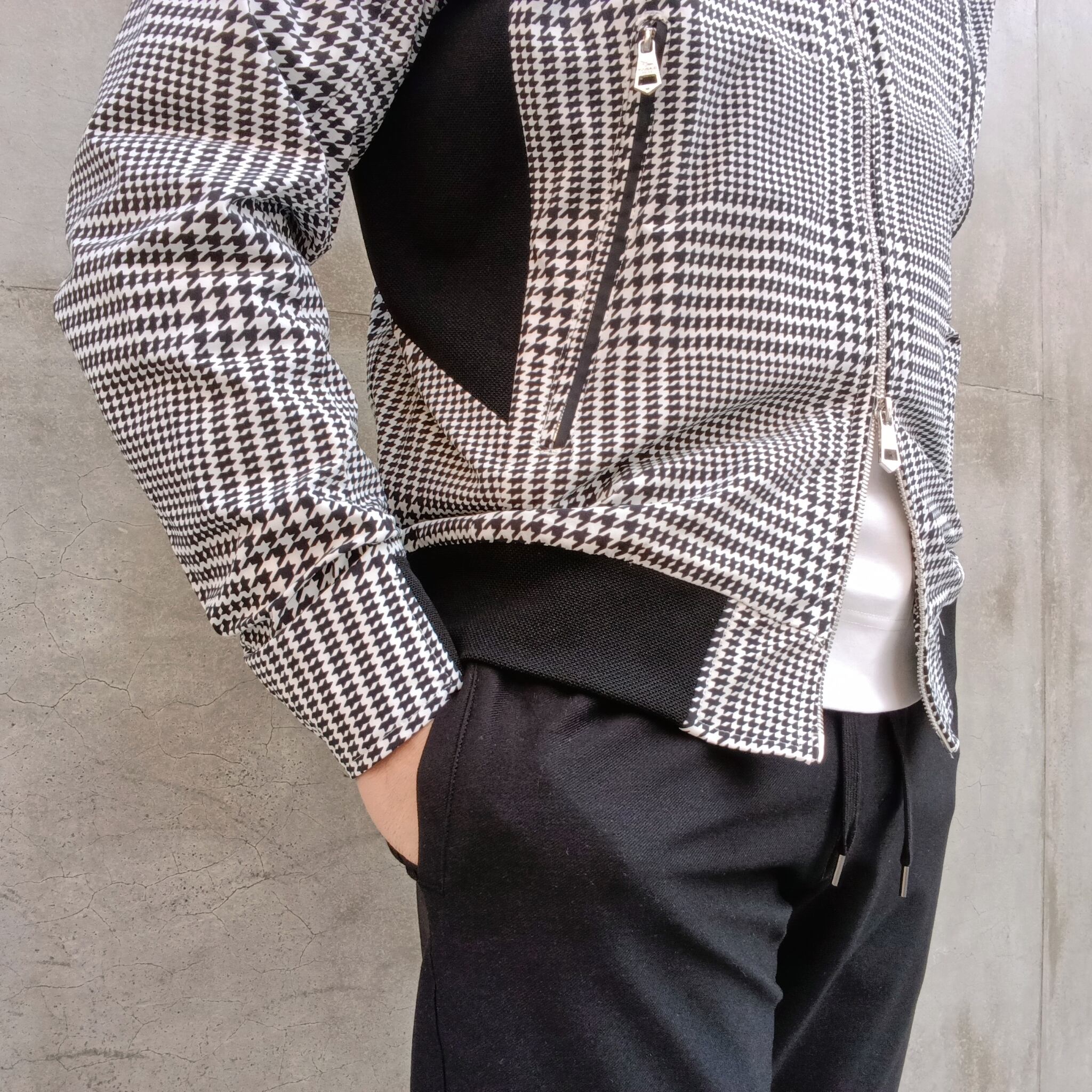 フロントに走るアシンメトリーなファスナーポケットがモードなアクセントをプラス。
