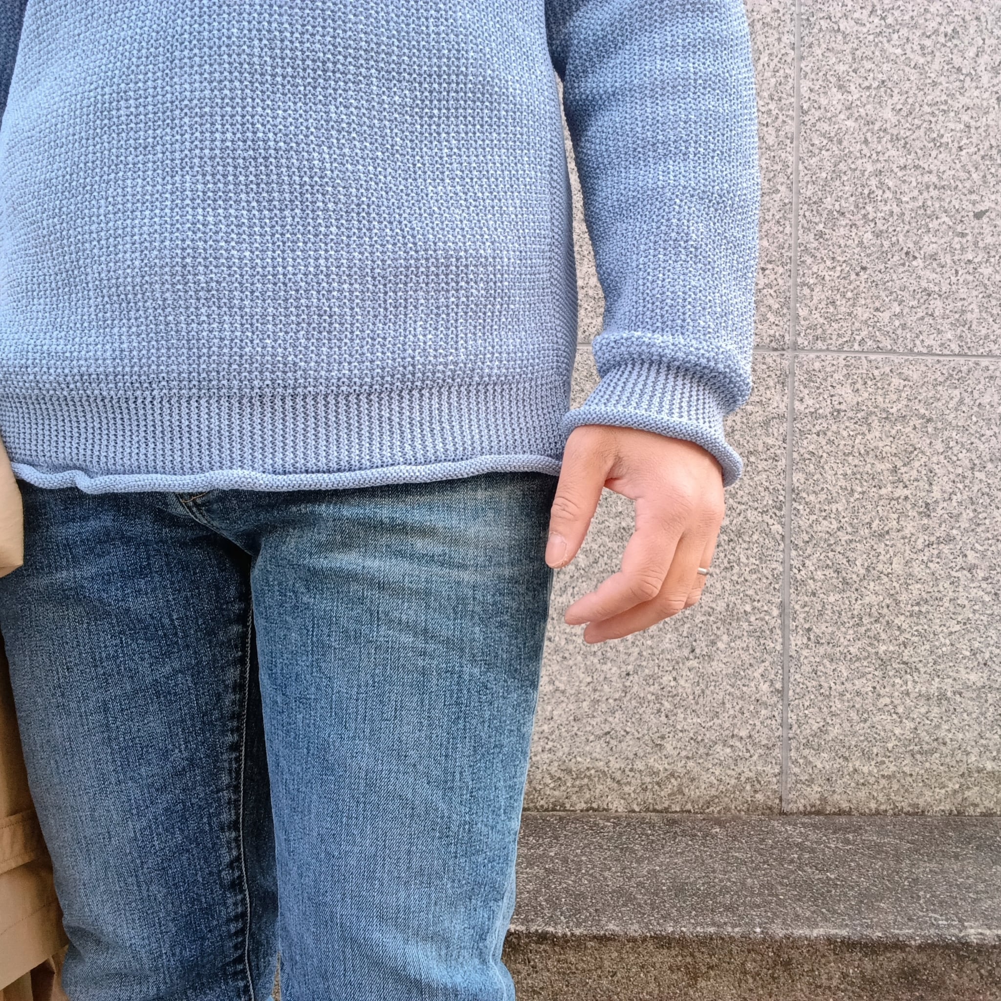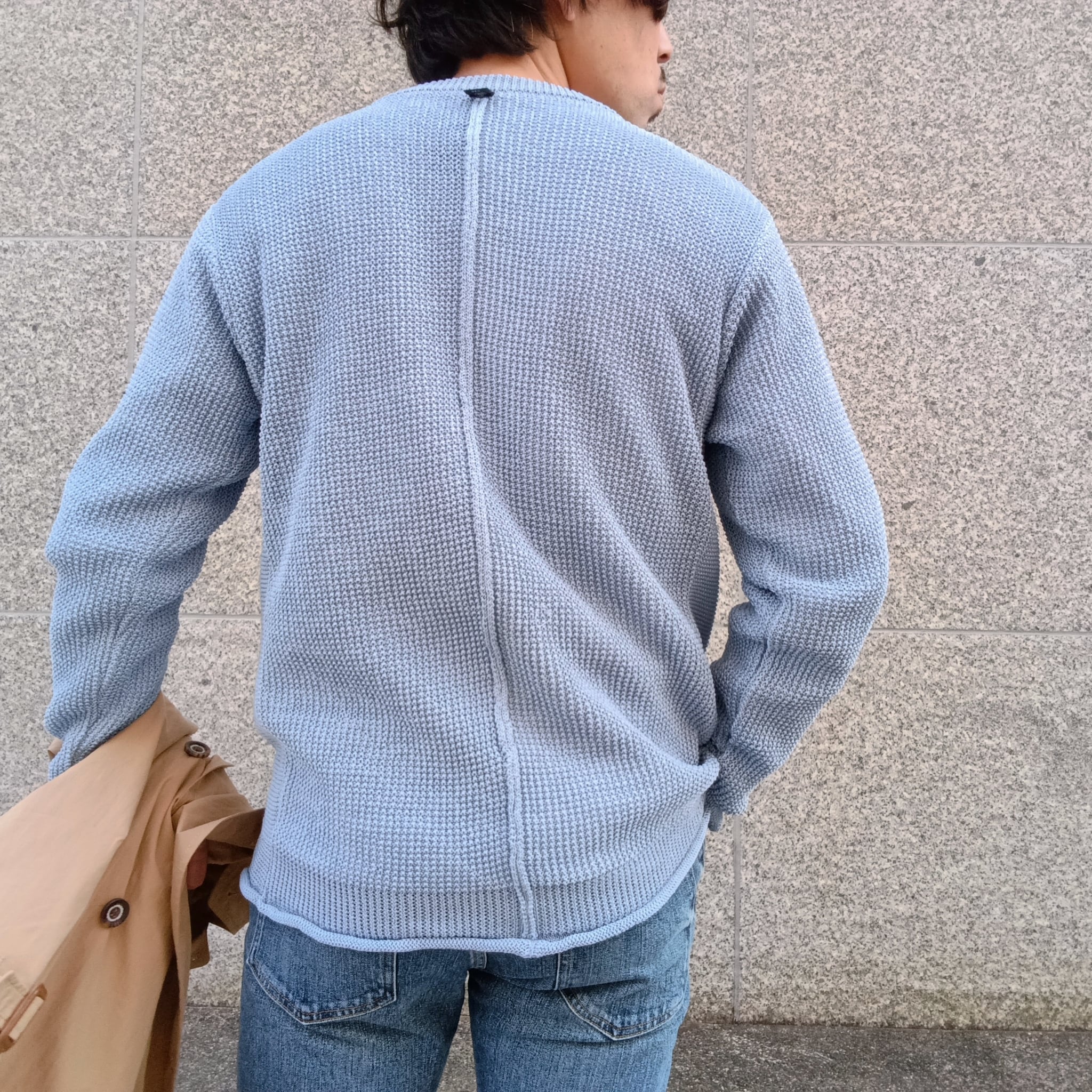 綿コーマ糸を特殊な樹脂で扁平状に固着させる「擬麻(ぎま)」加工を施した糸を使用することで、綿でありながら麻のような独特のシャリっとした風合いを楽しめるプルオーバーニット。
