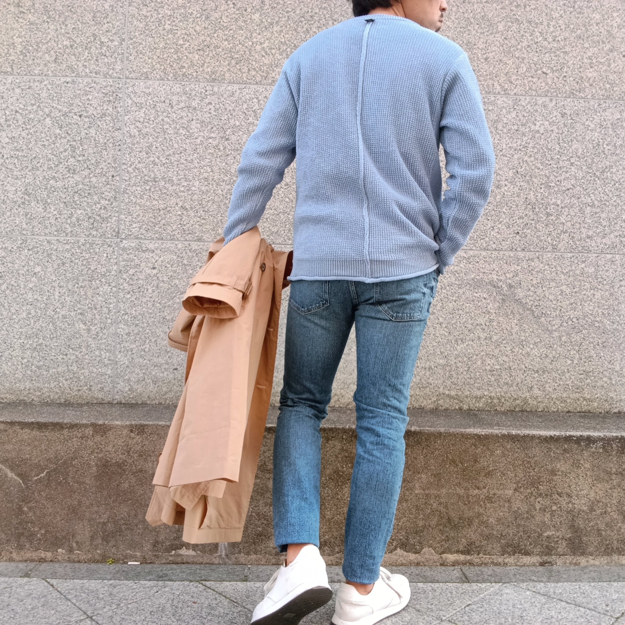 袖口、裾に天竺ロールを施すことでwjkらしいアクセントを加えている。背接ぎをに生地耳を使用し、あえて表に出すことで表情に変化を加えている。