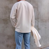 リネンのようなナチュラルな表情を持つ、ダブルフェイスジャージ素材を使用。表面はブークレー調の立体感ある風合いでありながら、裏面はソフトで優しい肌触りを実現しています。耐洗濯性にも優れ、デイリーに扱いやすいイージーケア仕様。毎日のワードローブで、思わず手に取りたくなる一着です。