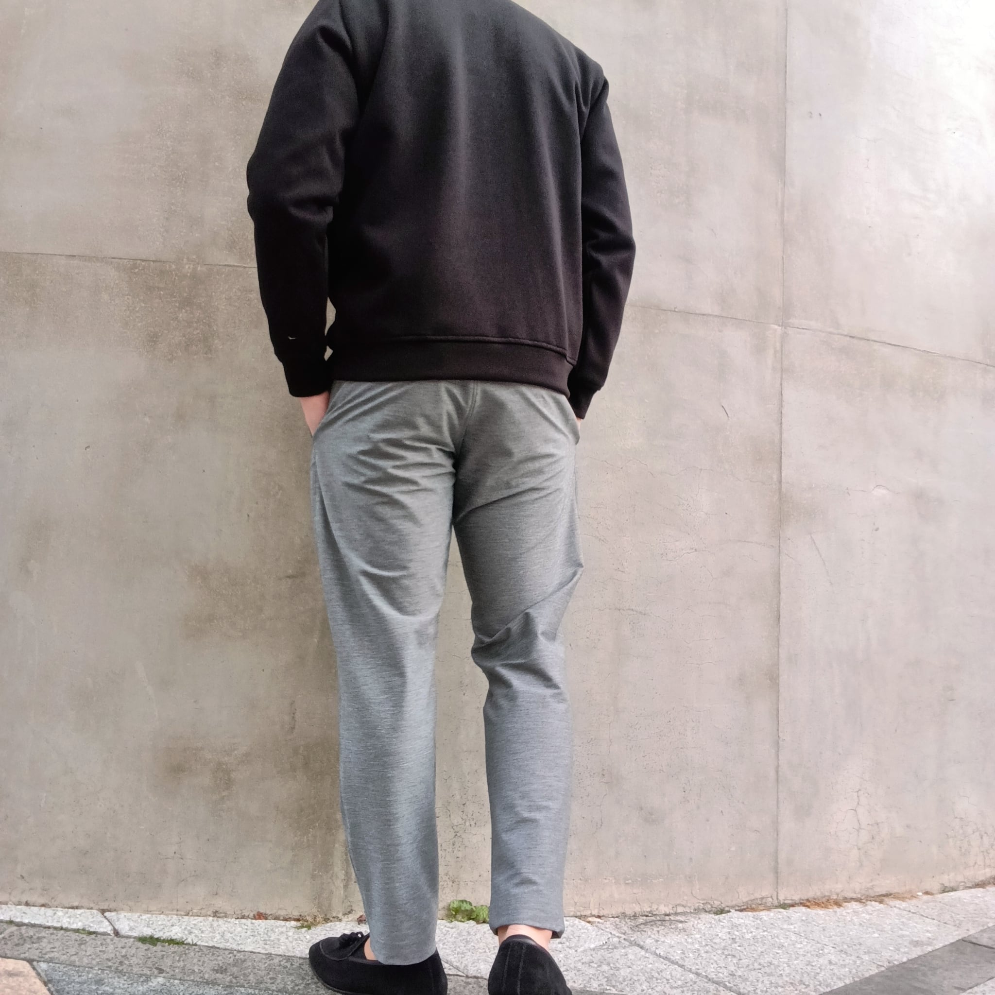 表面はリブ、裏面はフラットな無地のダブルフェイス組織です。タンブル加工で柔らかく仕上げ、ハリ感もありピリング耐性も良い仕上げになっています。