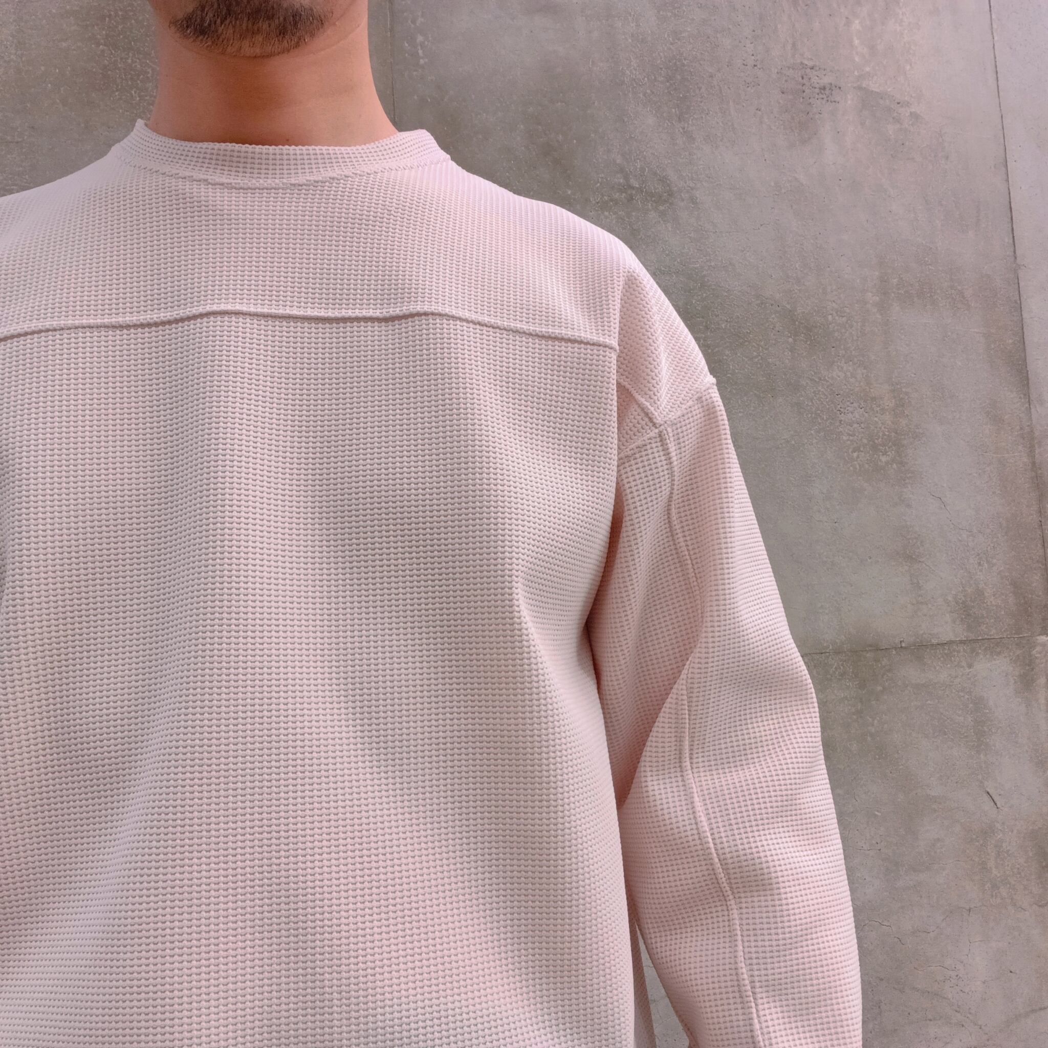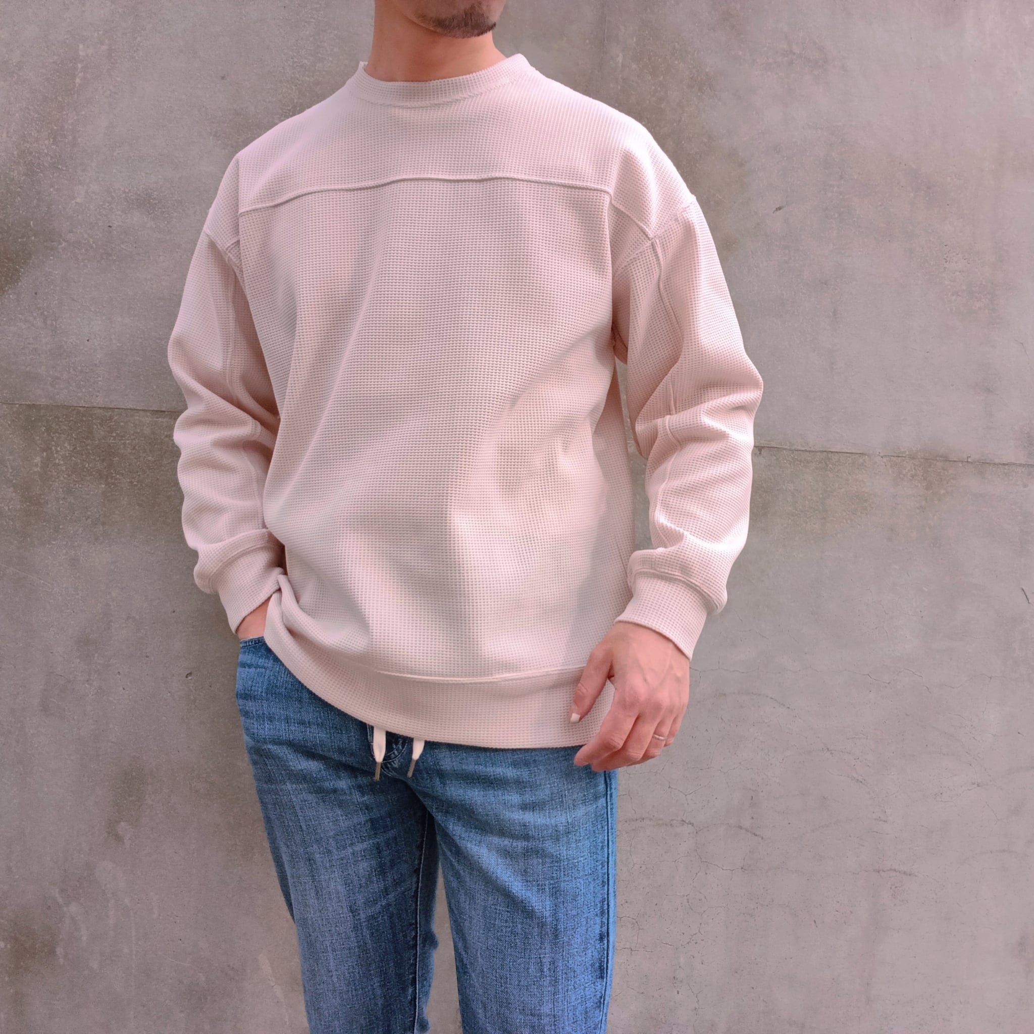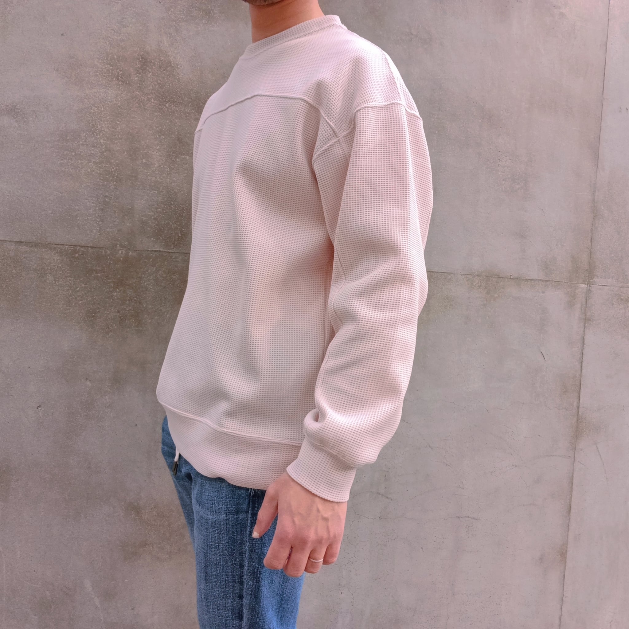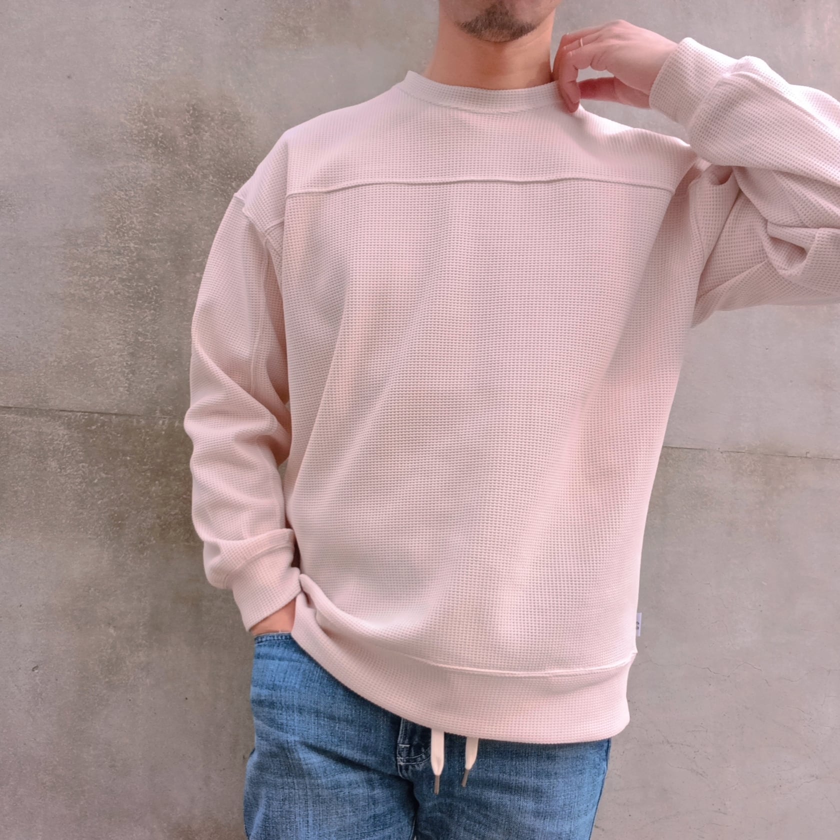 組織の中に伸縮性のあるポリエステルを組み込むことで、肉厚のワッフル独特の反発感と構築的なフォルムがプラスされています。前身、後身、袖を二本針で切替えたゆったり目のクルーです。