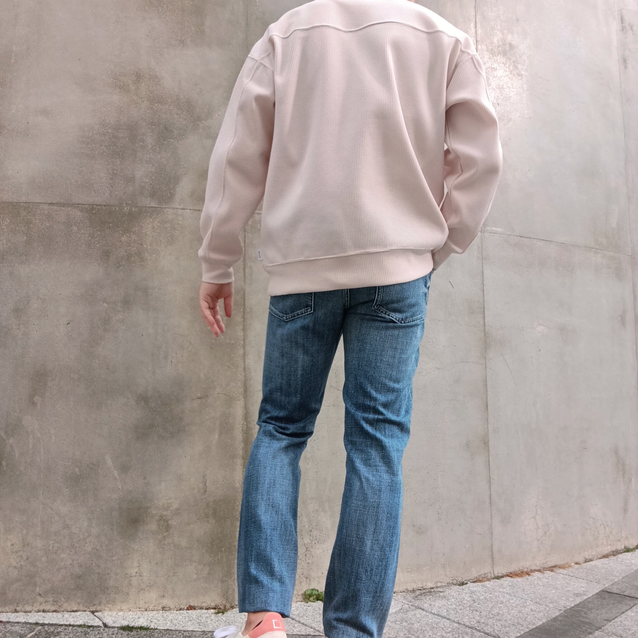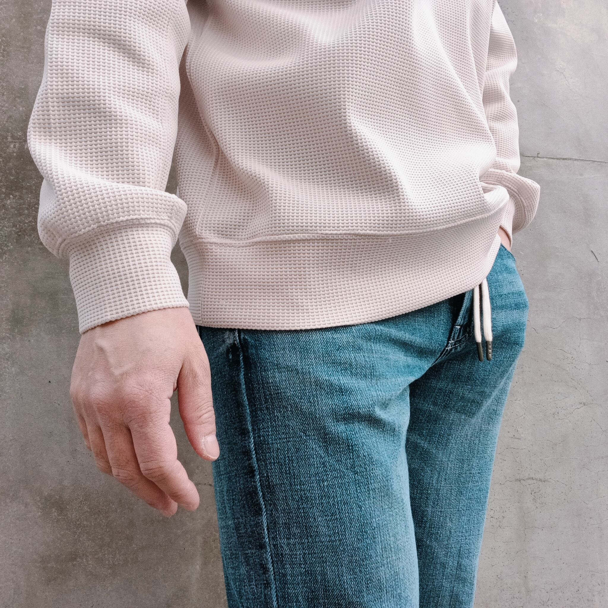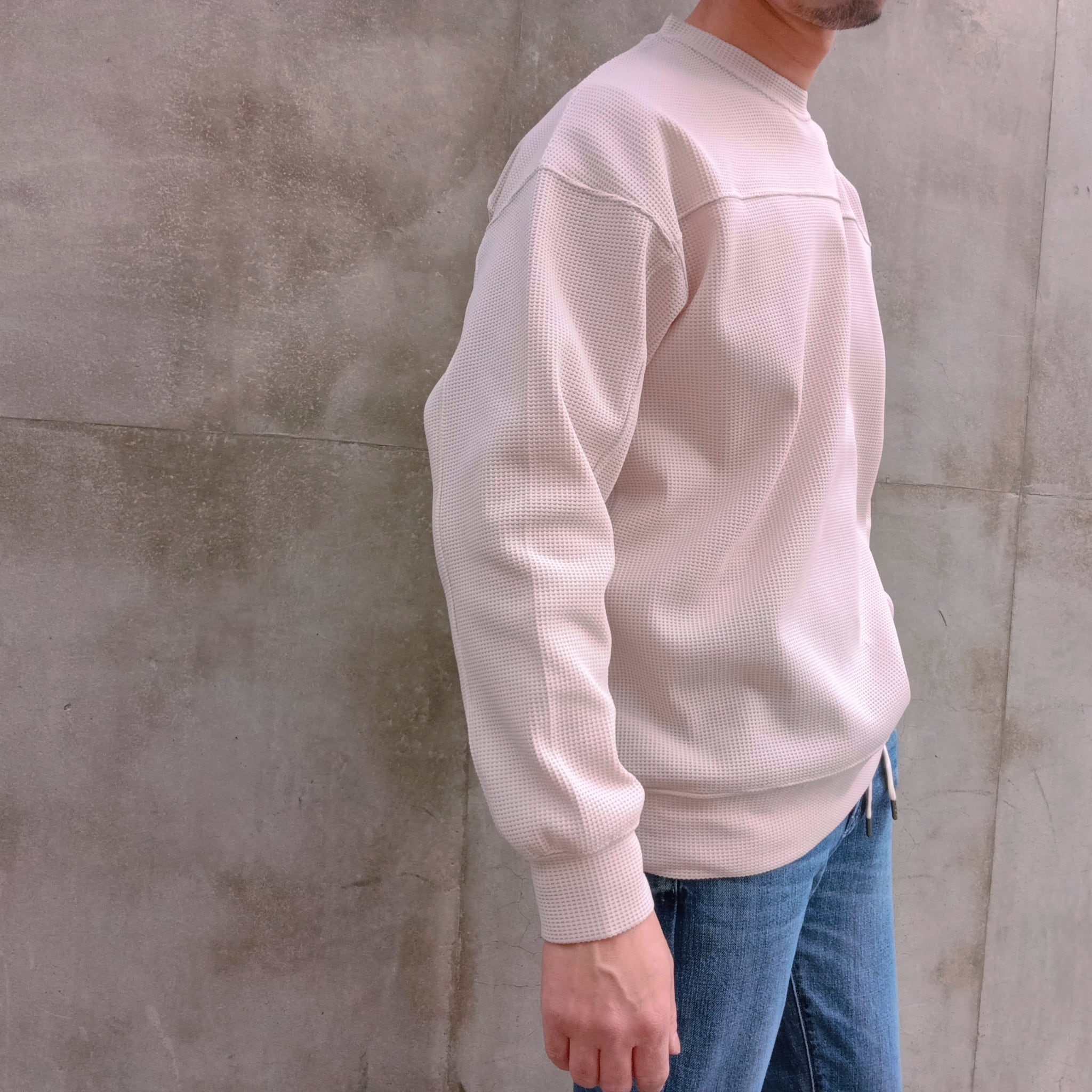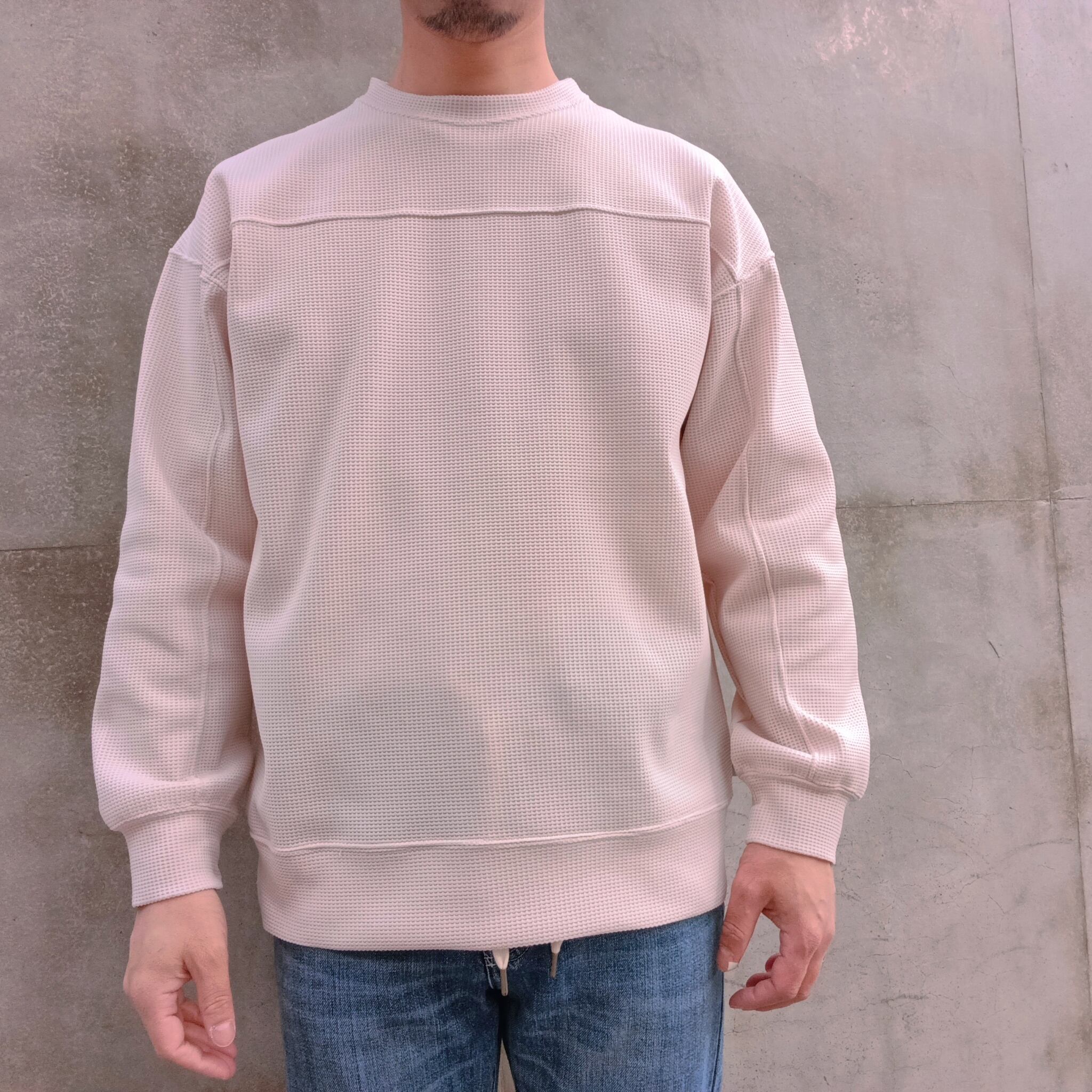 組織の中に伸縮性のあるポリエステルを組み込むことで、肉厚のワッフル独特の反発感と構築的なフォルムがプラスされています。前身、後身、袖を二本針で切替えたゆったり目のクルーです。