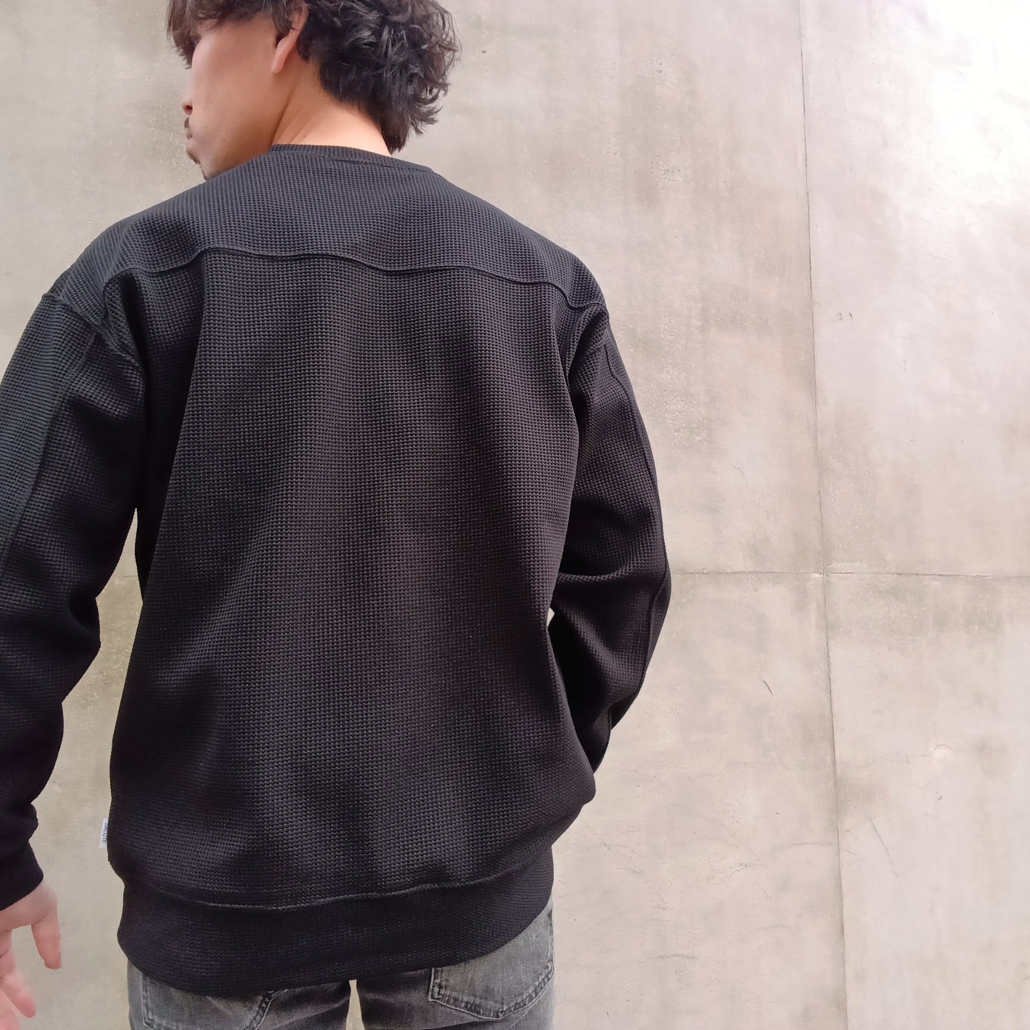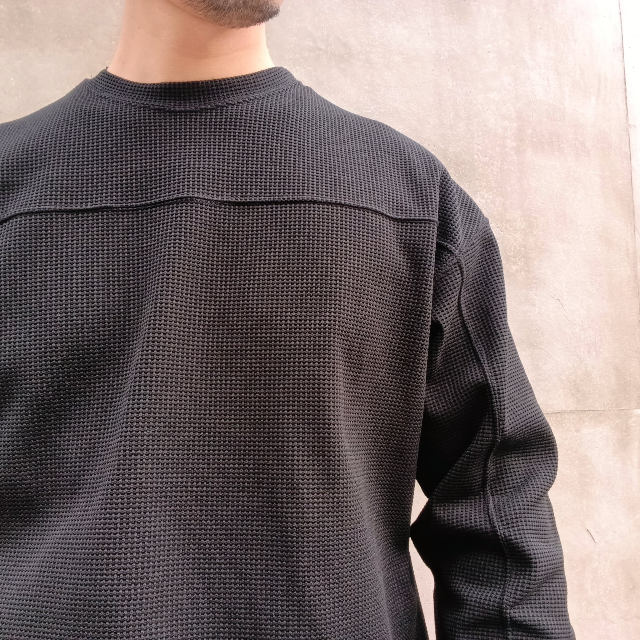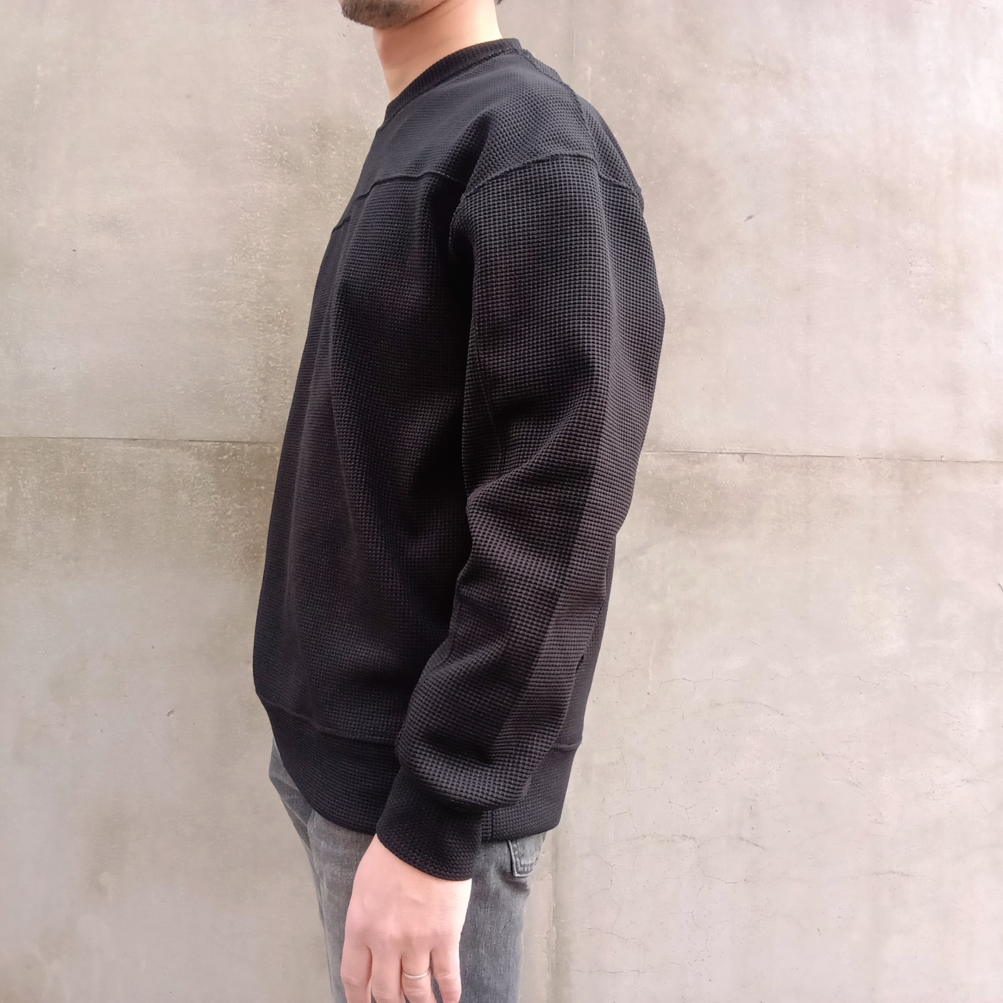 組織の中に伸縮性のあるポリエステルを組み込むことで、肉厚のワッフル独特の反発感と構築的なフォルムがプラスされています。前身、後身、袖を二本針で切替えたゆったり目のクルーです。