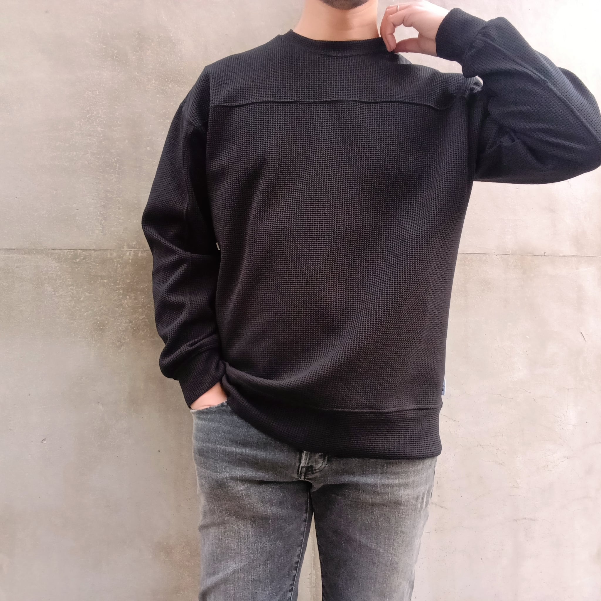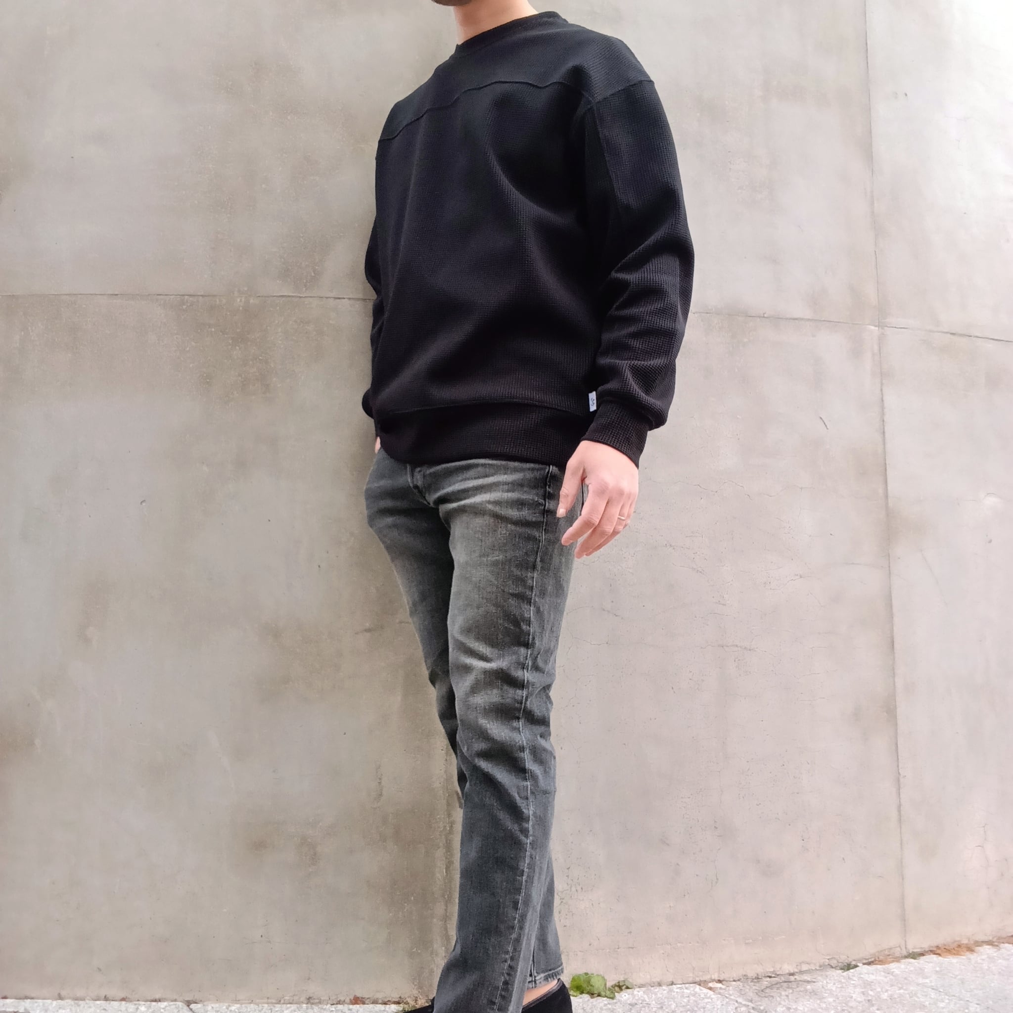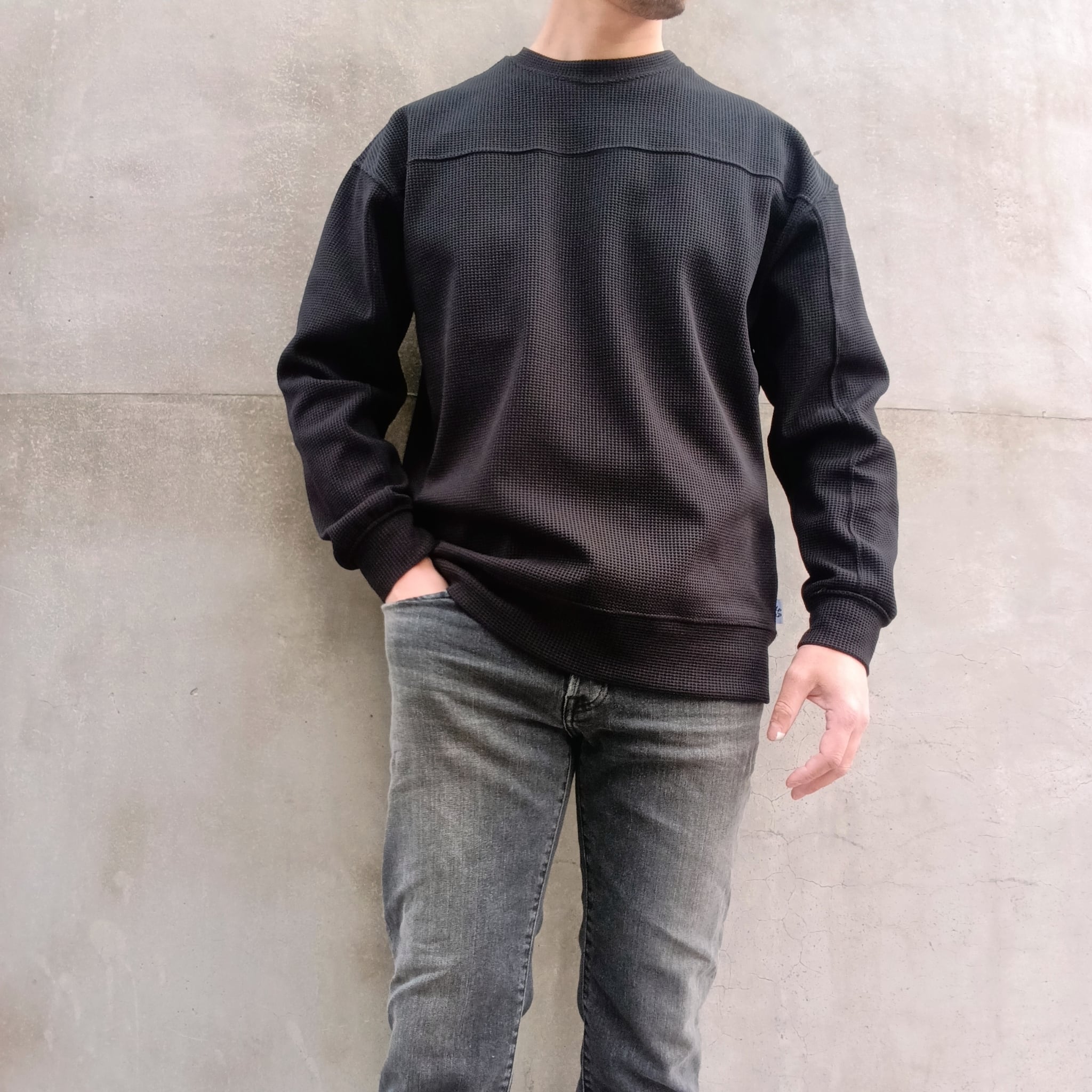 組織の中に伸縮性のあるポリエステルを組み込むことで、肉厚のワッフル独特の反発感と構築的なフォルムがプラスされています。前身、後身、袖を二本針で切替えたゆったり目のクルーです。