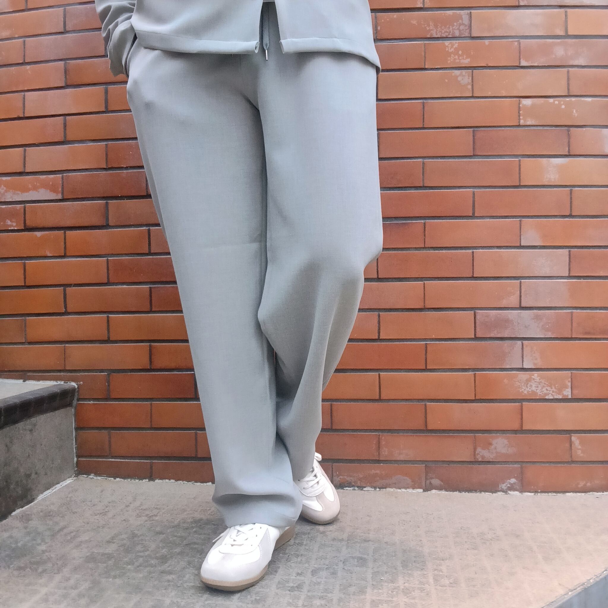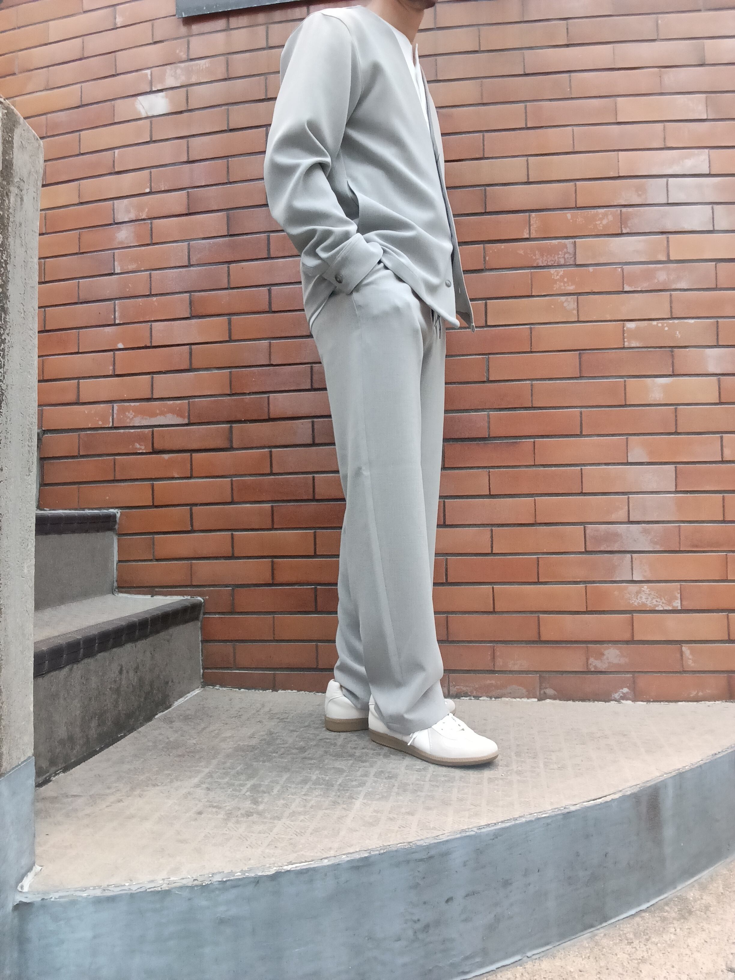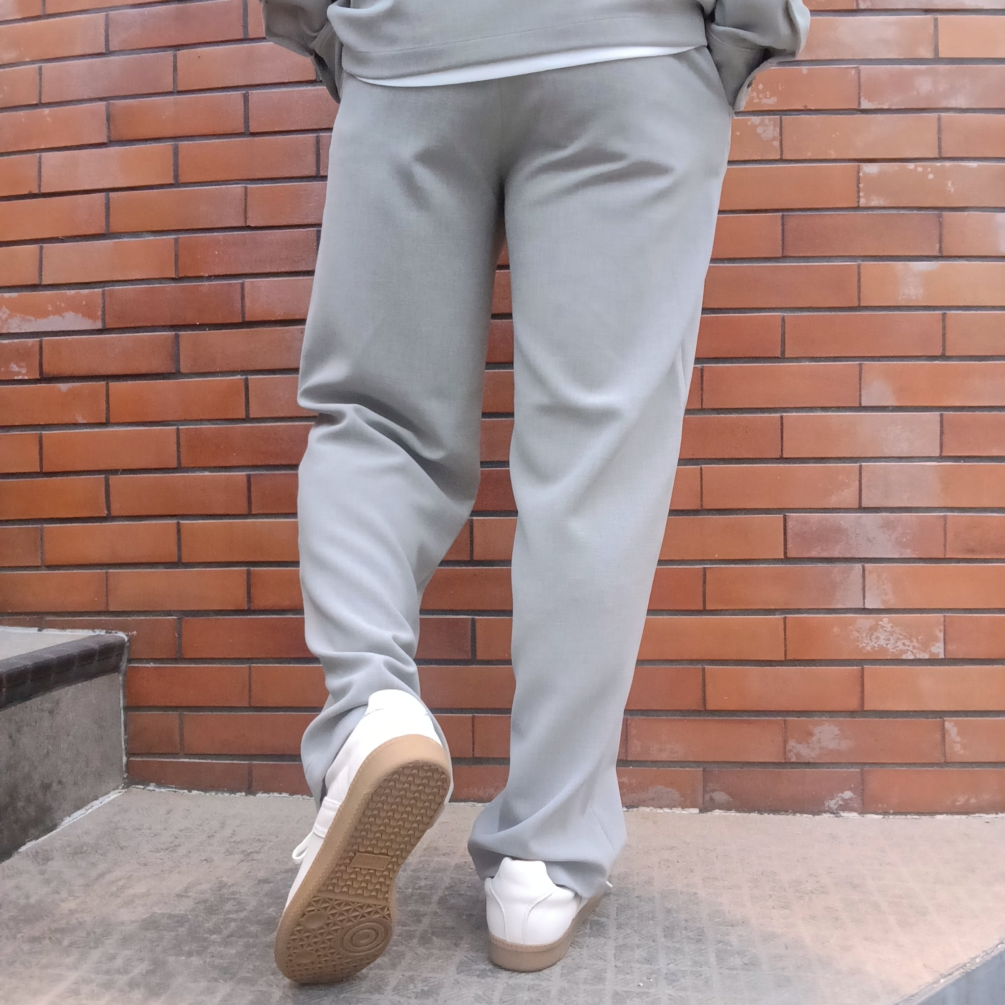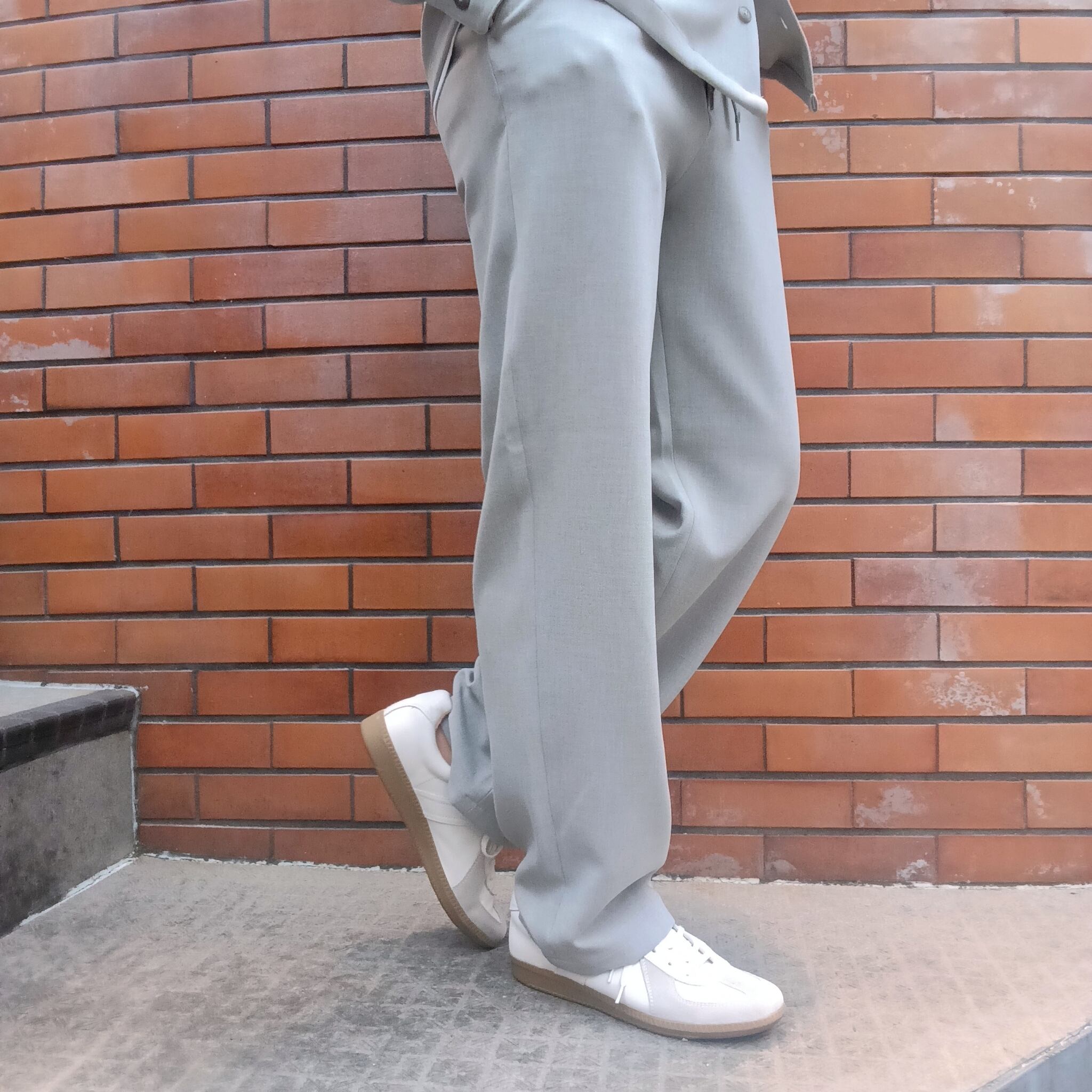 ポリエステルのフィラメント(長繊維)ながらトップ糸のようなメランジ感とパウダーな質感、膨らみがありストレッチ性も兼ね揃えた素材を用いたセットアップシリーズのノータックワイドワイドパンツ。裾に向けた絞りが比較的少なく、太さのままストンと落ちるシルエットがリラックスした雰囲気のあるパンツです。同素材カーディガンシャツジャケットとのセットアップも大変おすすめです。