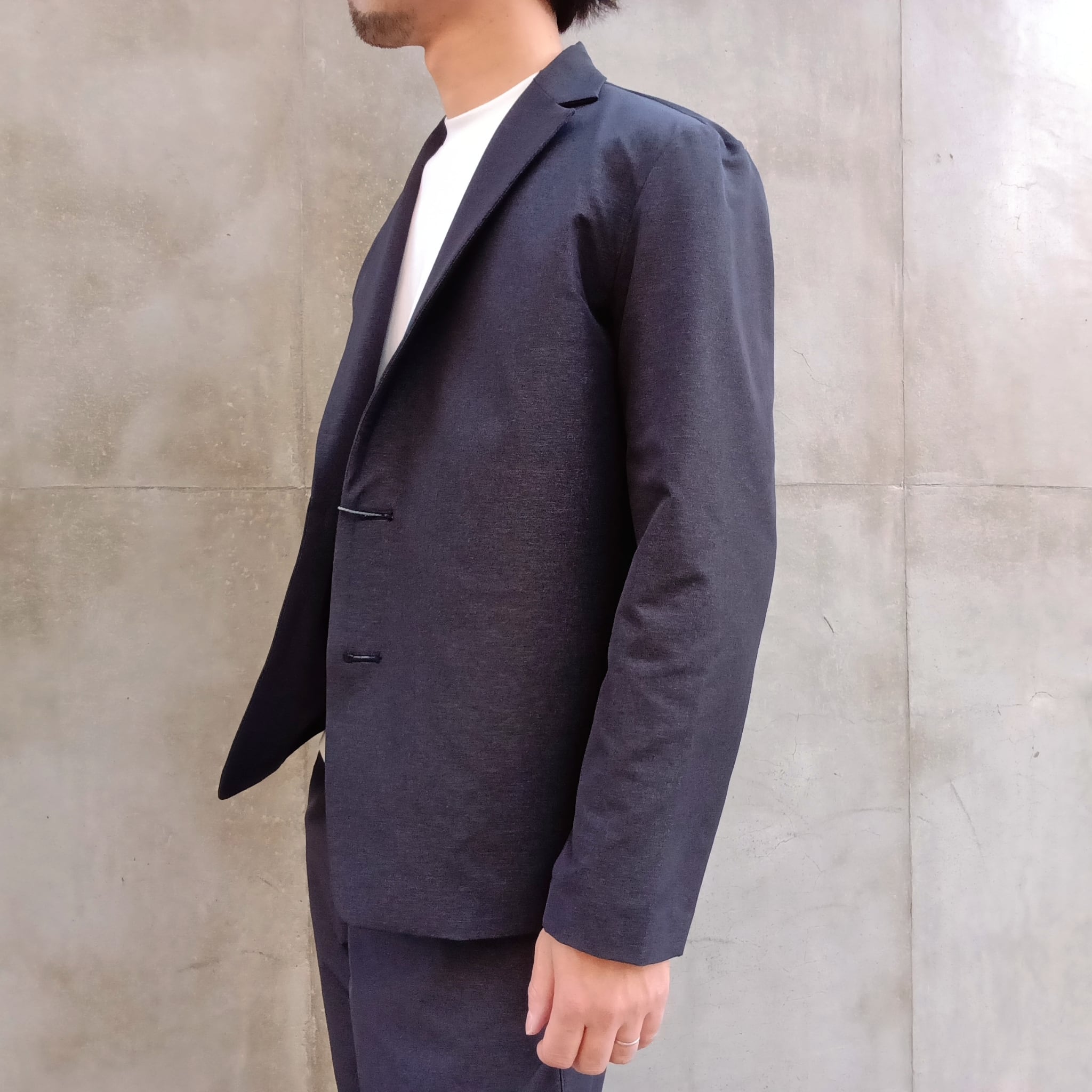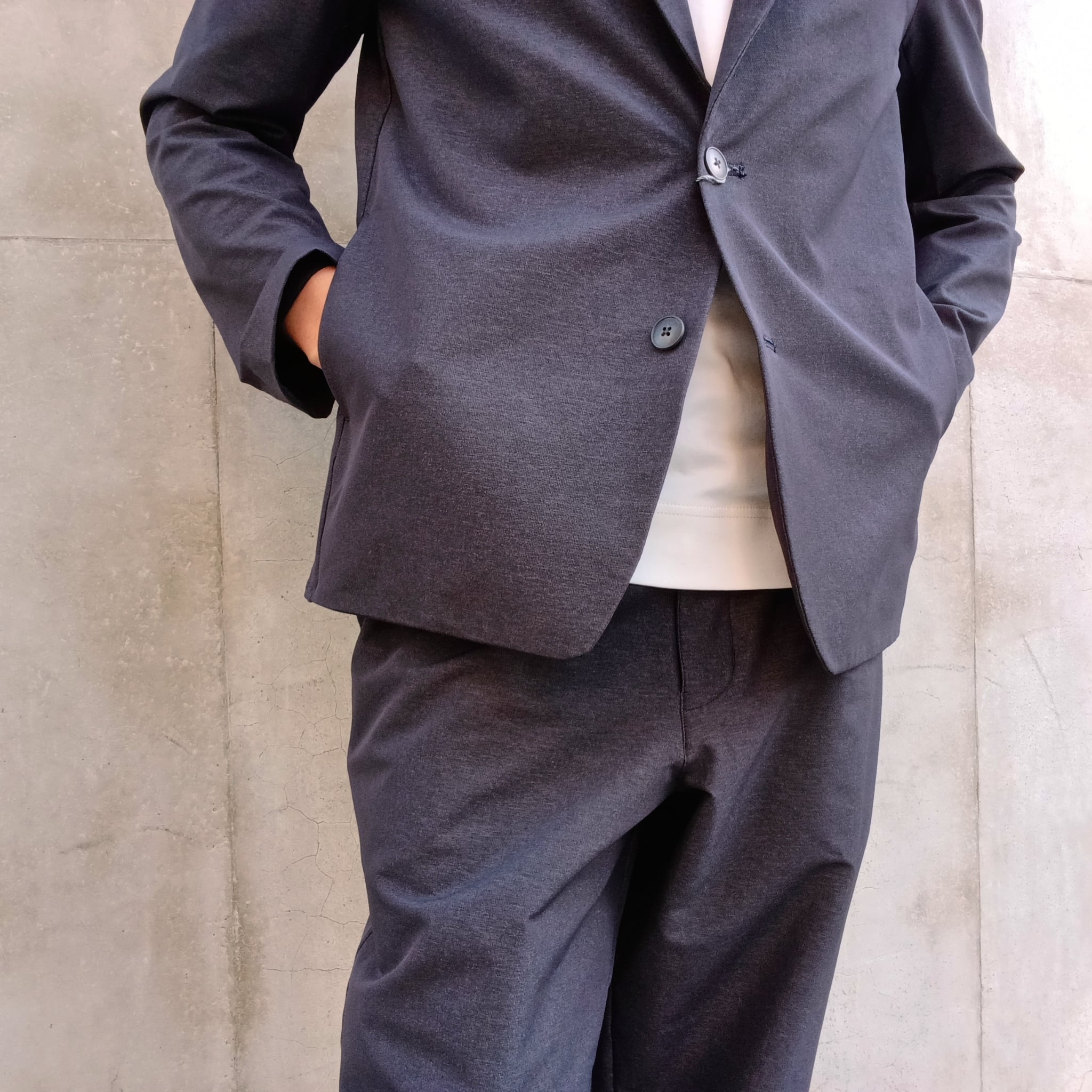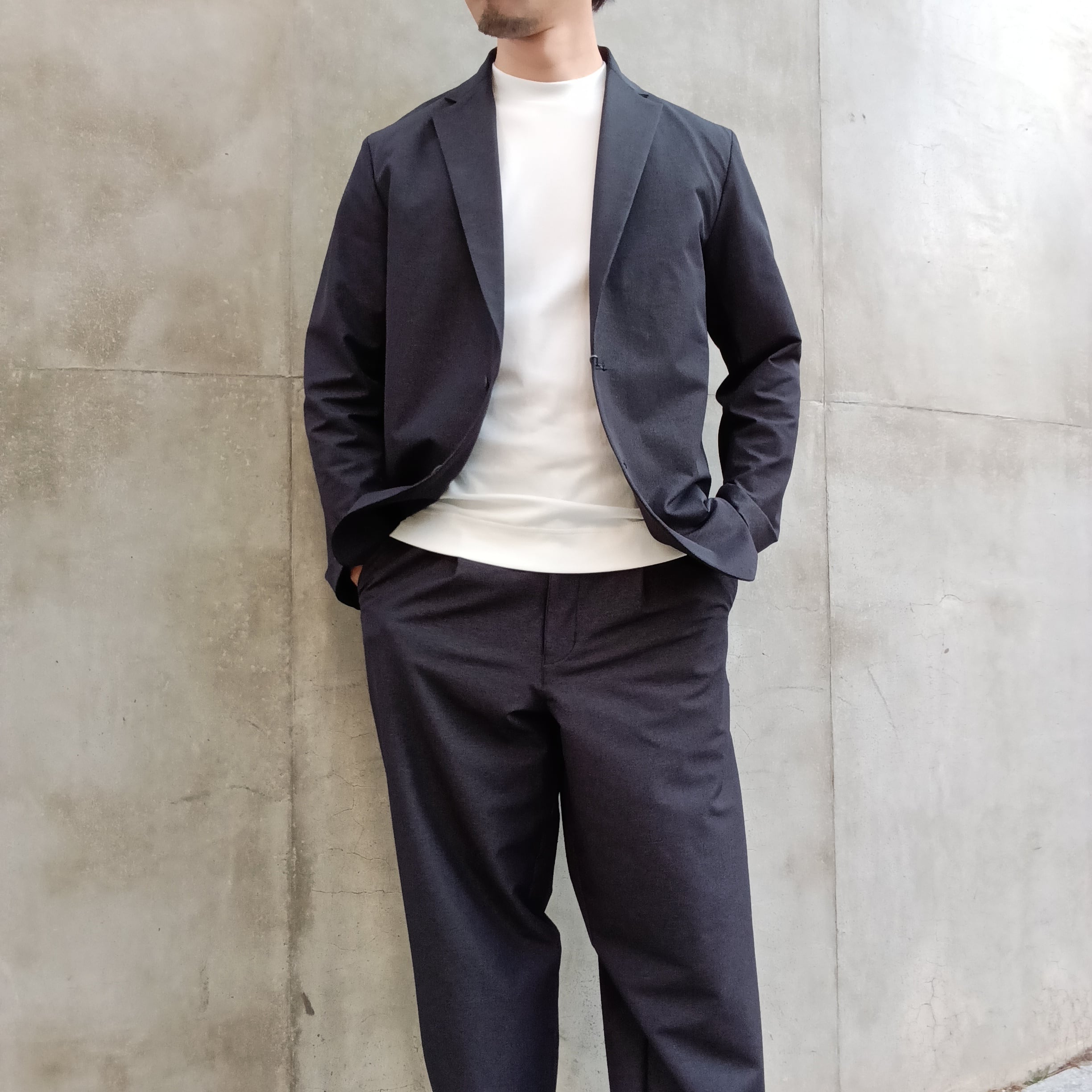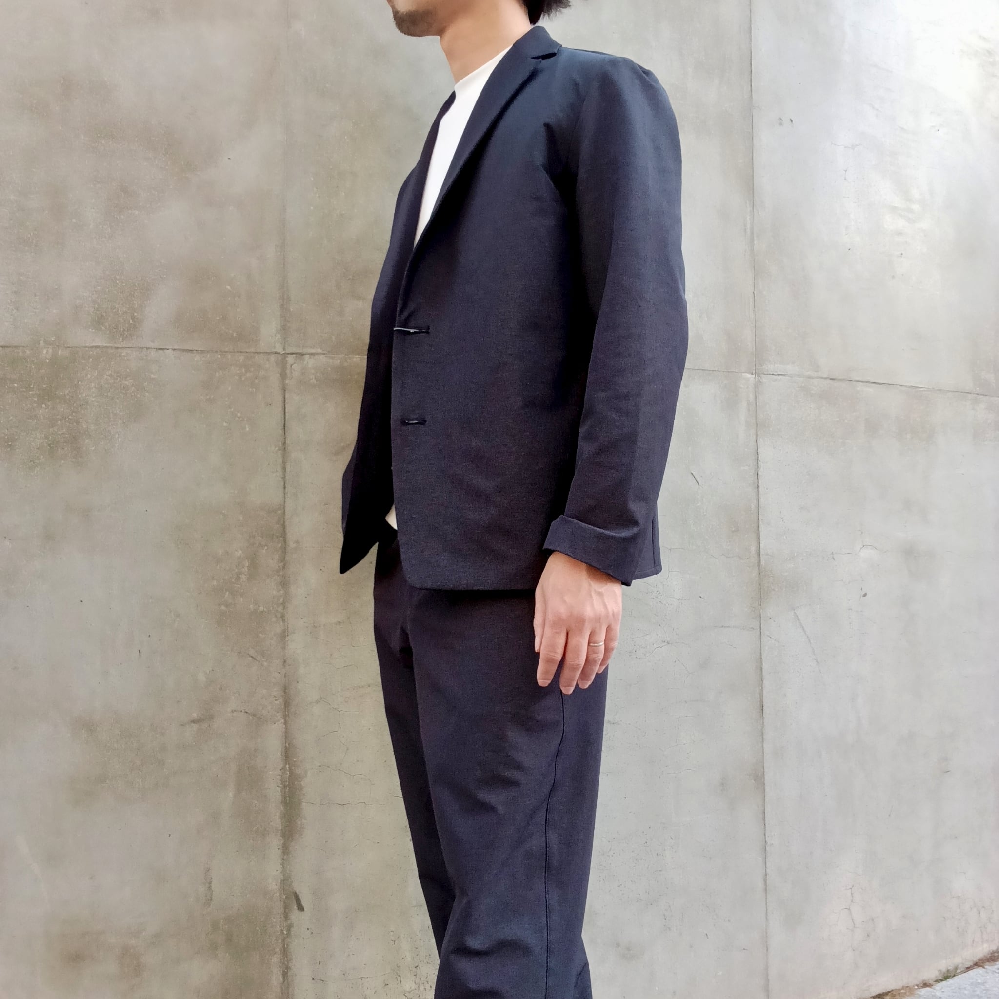 毎シーズン展開のナイロン/ポリエステルの4WAYストレッチ素材。中肉感でハリコシがあり、ナイロン特有のドライタッチとマットな表情が特徴です。アウトドアの定番素材を洗練されたタウンユースにブラッシュアップした素材です。カジュアルにもビジネスにも砕け過ぎないちょうど良さで着回しが効くリラックス2Bイージージャケット。ワンタックワイドパンツとセットアップ出来ます。