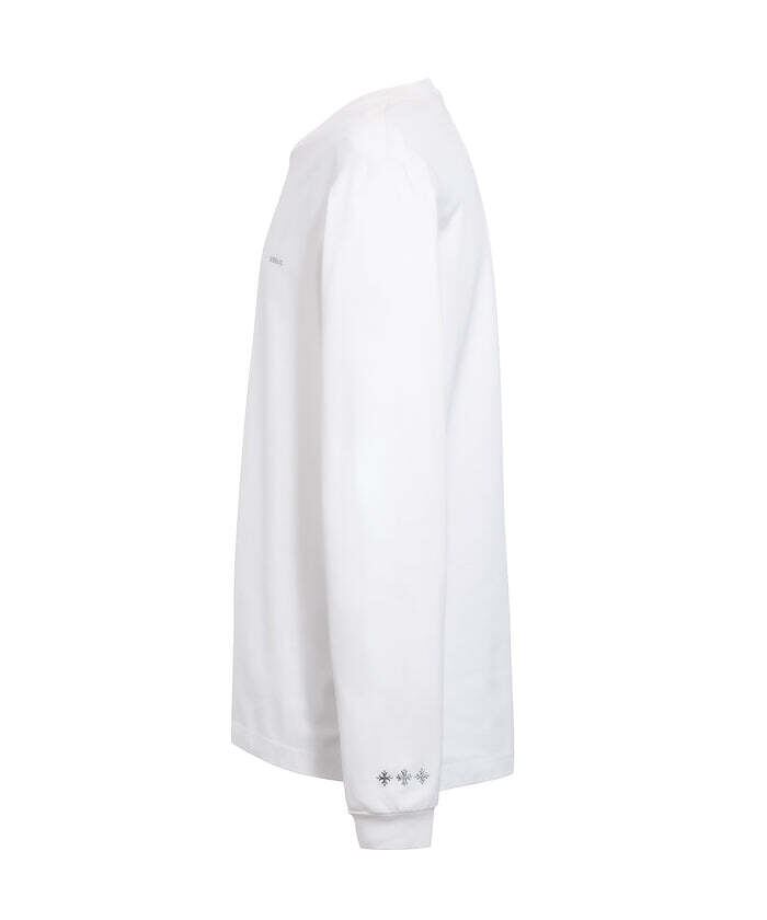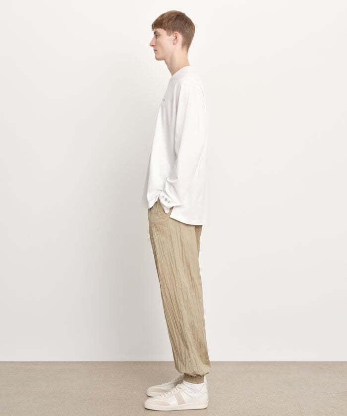 胸元に小さなTATRASロゴを配置して、さりげなくも目を引くデザインに。袖口のアイコンもポイントのひとつ。袖口を絞り、フォルムにメリハリを持たせたことも特徴です。合わせるアイテムを選ばない、着回し力抜群の一着です。