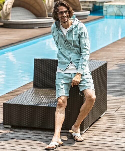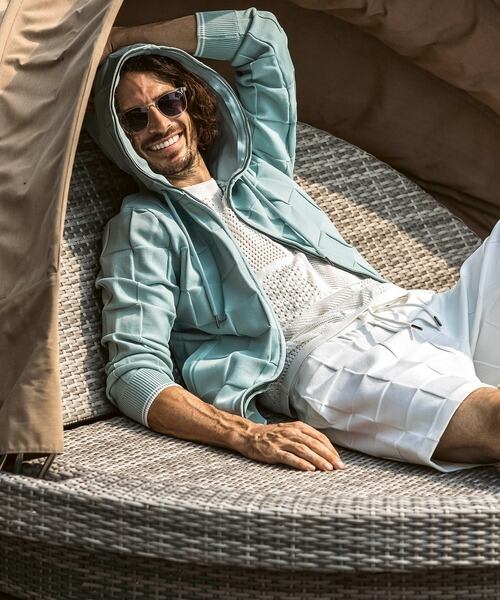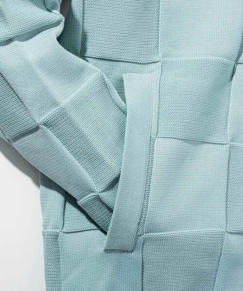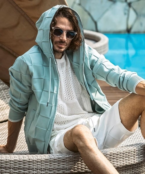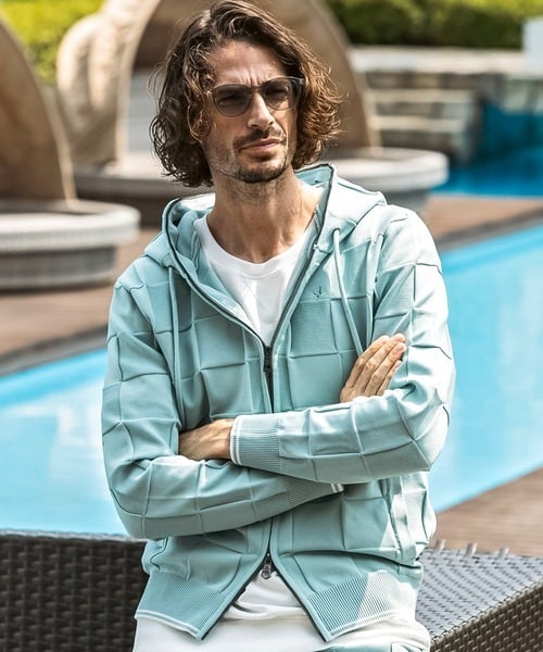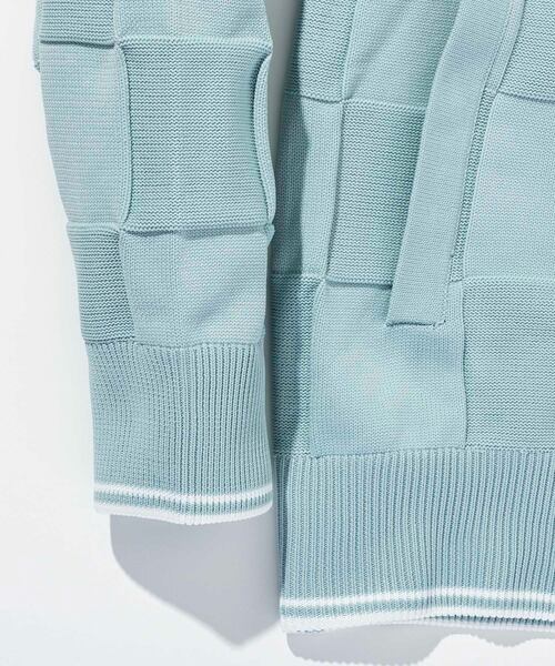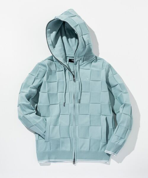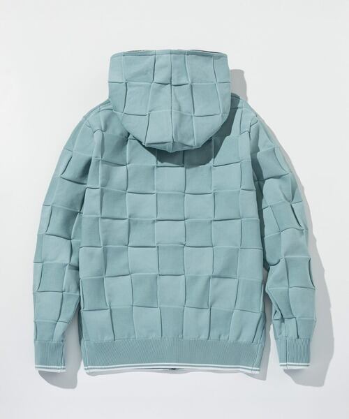 編み込んだような立体的なブロックデザインがクラス感を漂わせる、オリジナルテキスタイルで仕立てたニットパーカー。