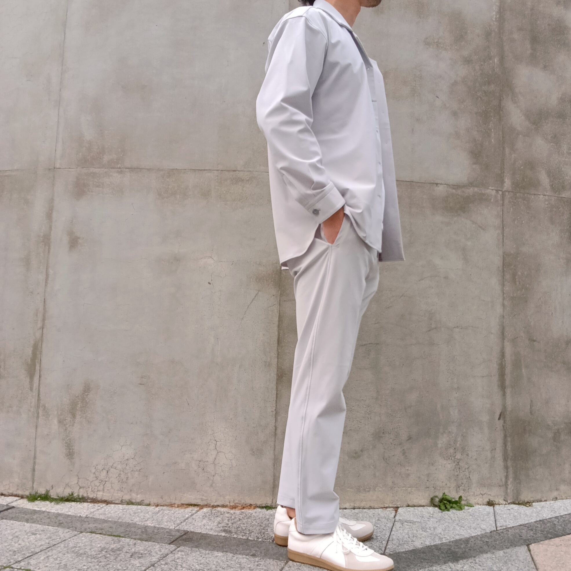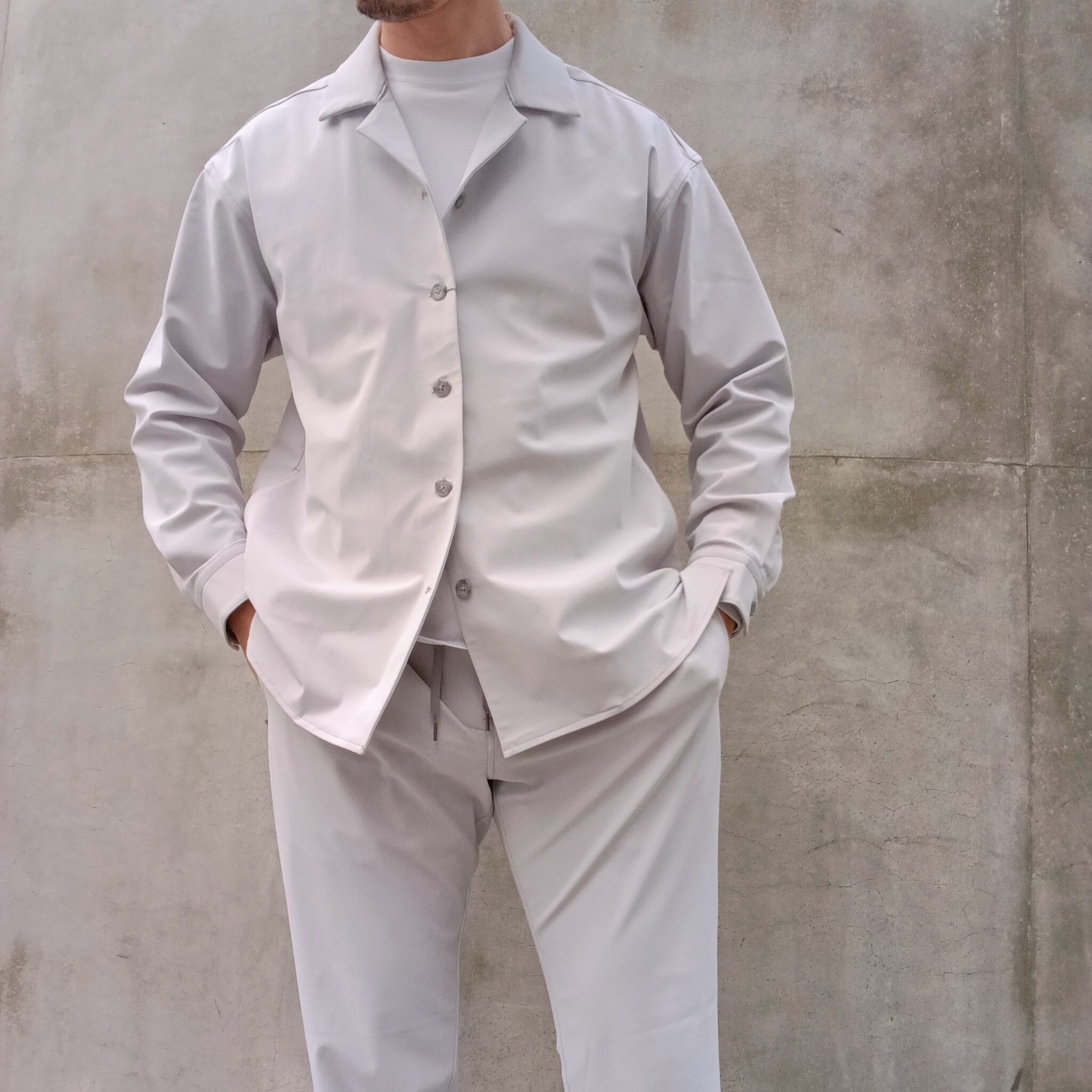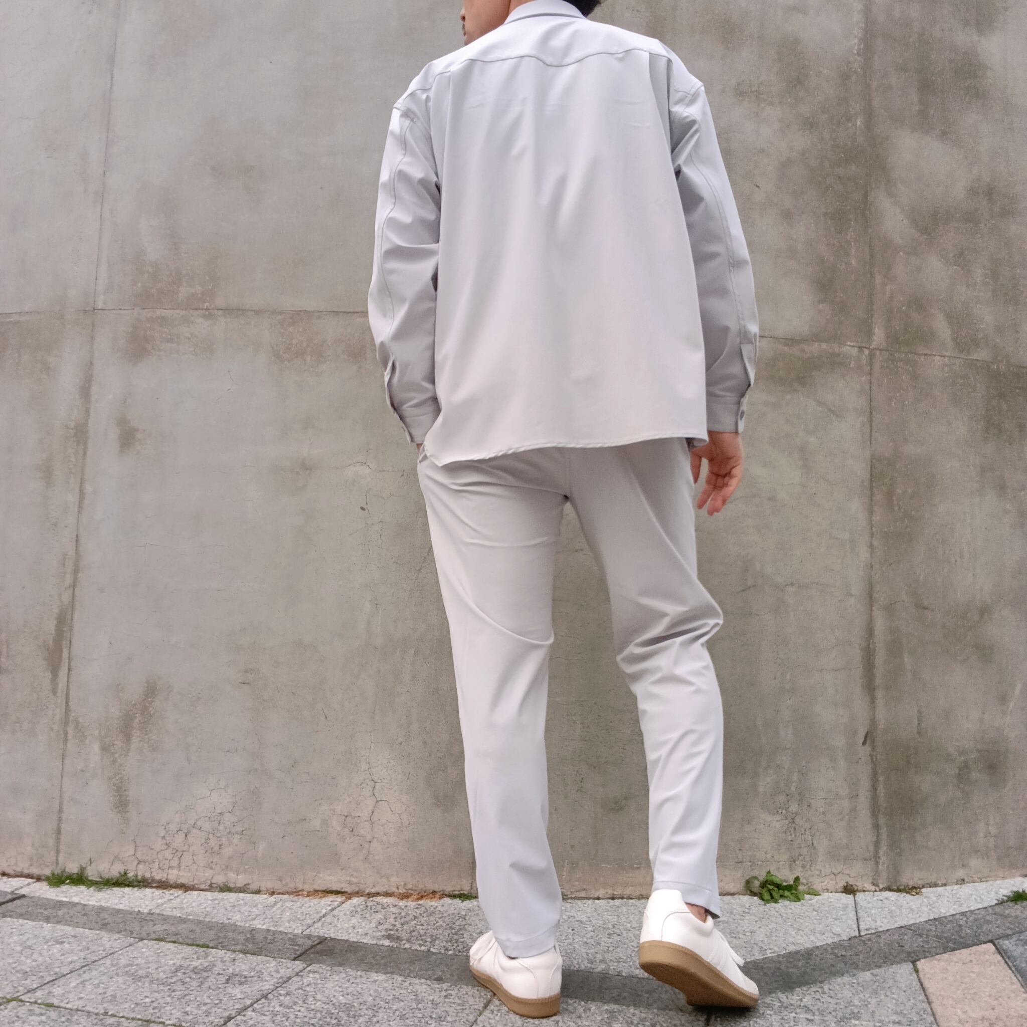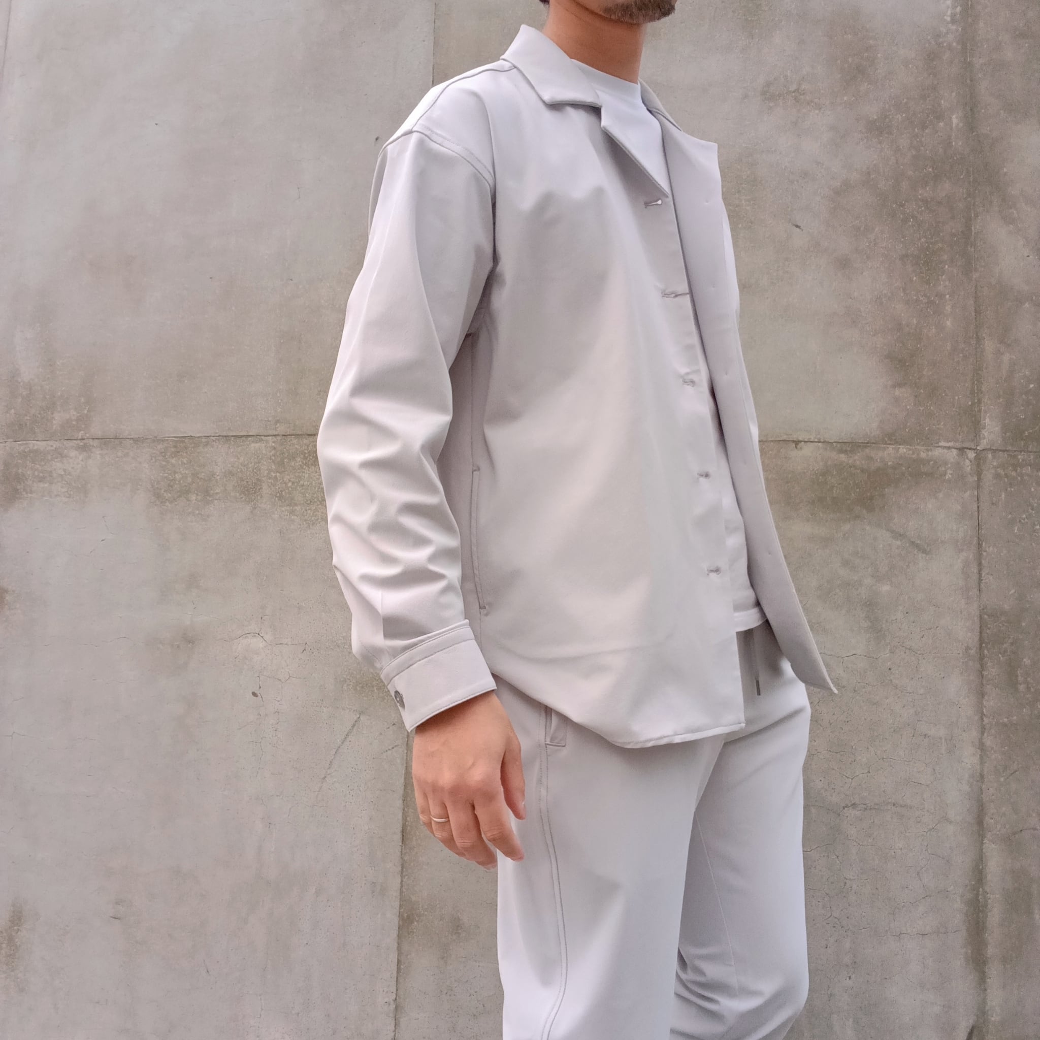 DRAYMASTERを使った多機能トリコットを使い、リラックス感のあるシルエットで作製したシャツジャケット。小さめのラペルやミニマムなディテールにより「シャツ以上アウター未満」の便利なアイテムに仕上げています。凹凸ある上品な表情と機能性を併せ持った素材使いはビジネスからシックなカジュアルスタイルにと幅広いシーンで活躍してくれます。両脇にはシームポケット付き、同素材でリラックスイージーパンツも展開中です。