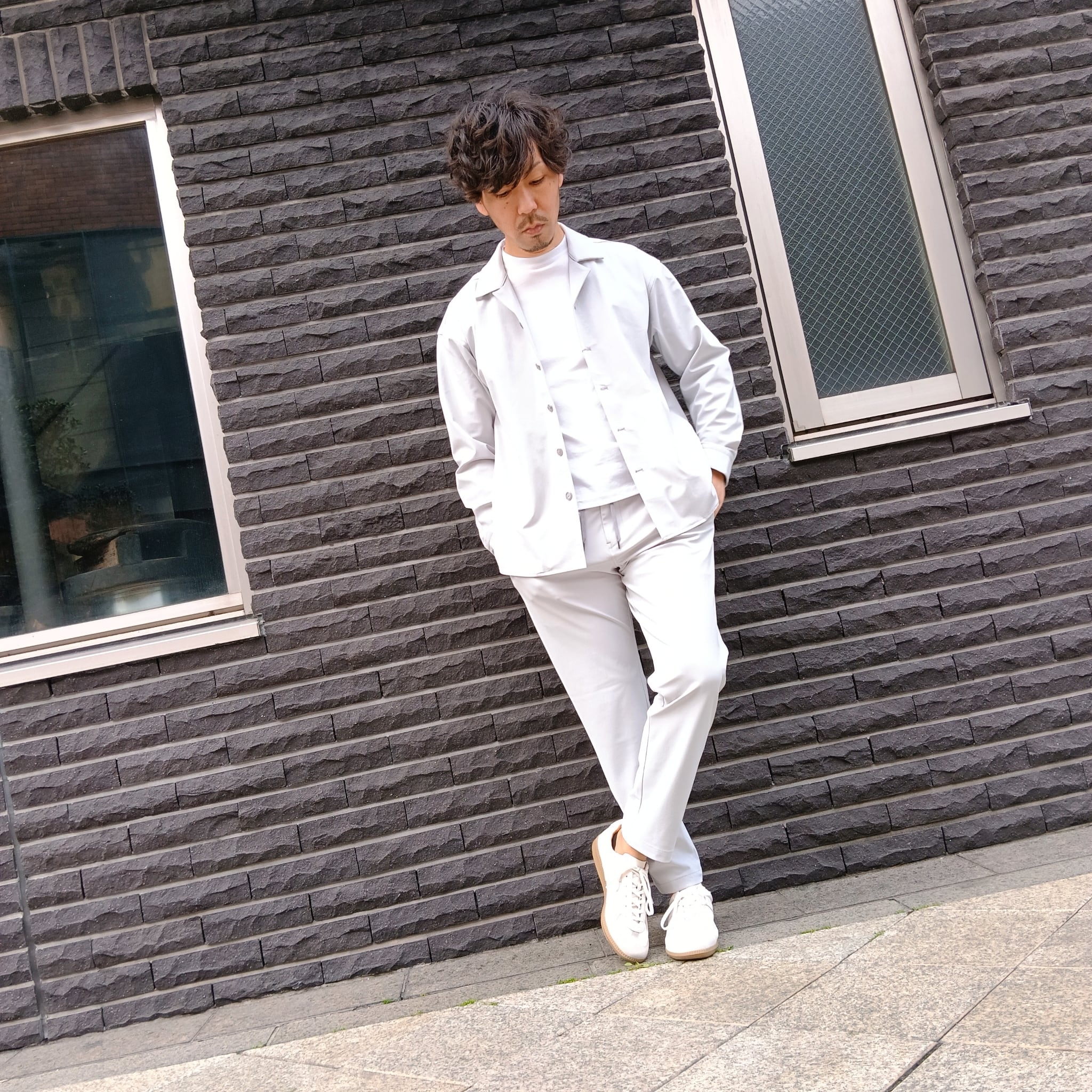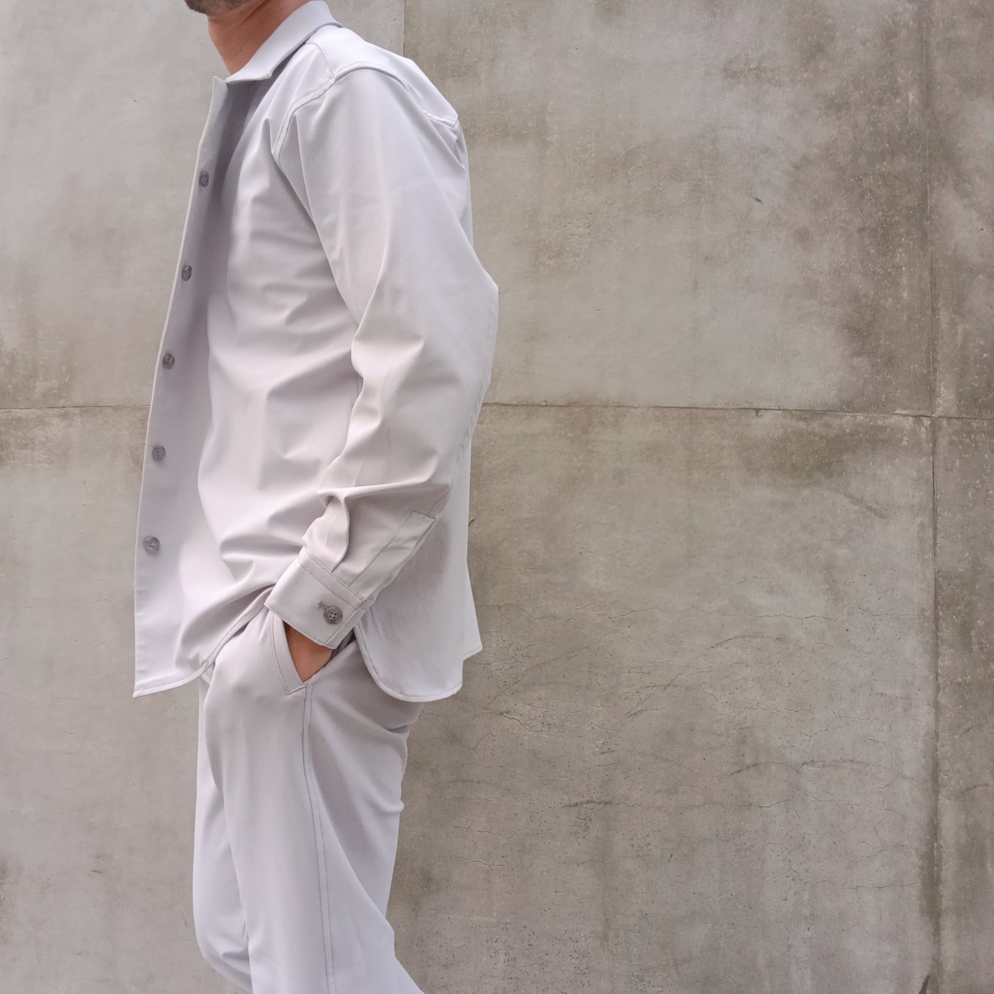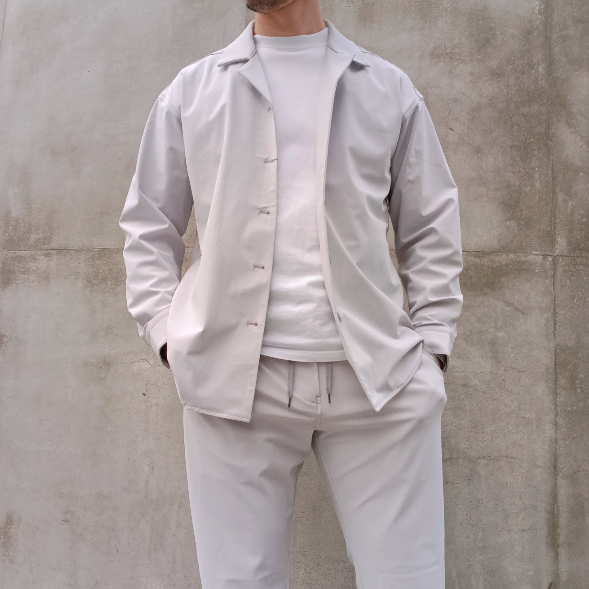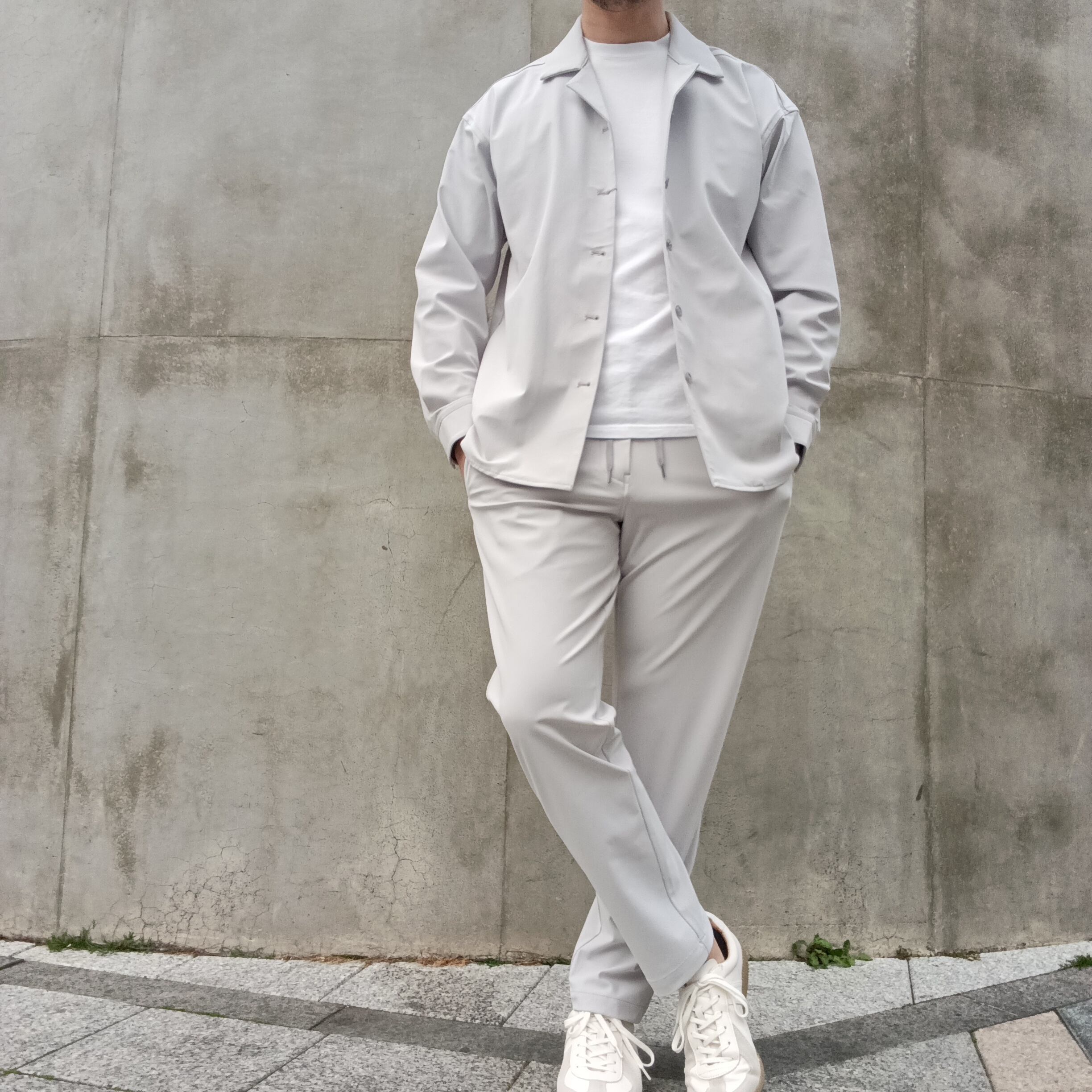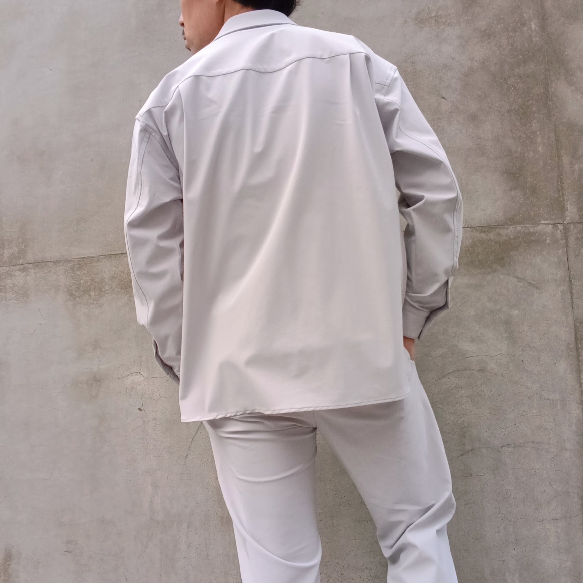 DRAYMASTERを使った多機能トリコットを使い、リラックス感のあるシルエットで作製したシャツジャケット。小さめのラペルやミニマムなディテールにより「シャツ以上アウター未満」の便利なアイテムに仕上げています。凹凸ある上品な表情と機能性を併せ持った素材使いはビジネスからシックなカジュアルスタイルにと幅広いシーンで活躍してくれます。両脇にはシームポケット付き、同素材でリラックスイージーパンツも展開中です。