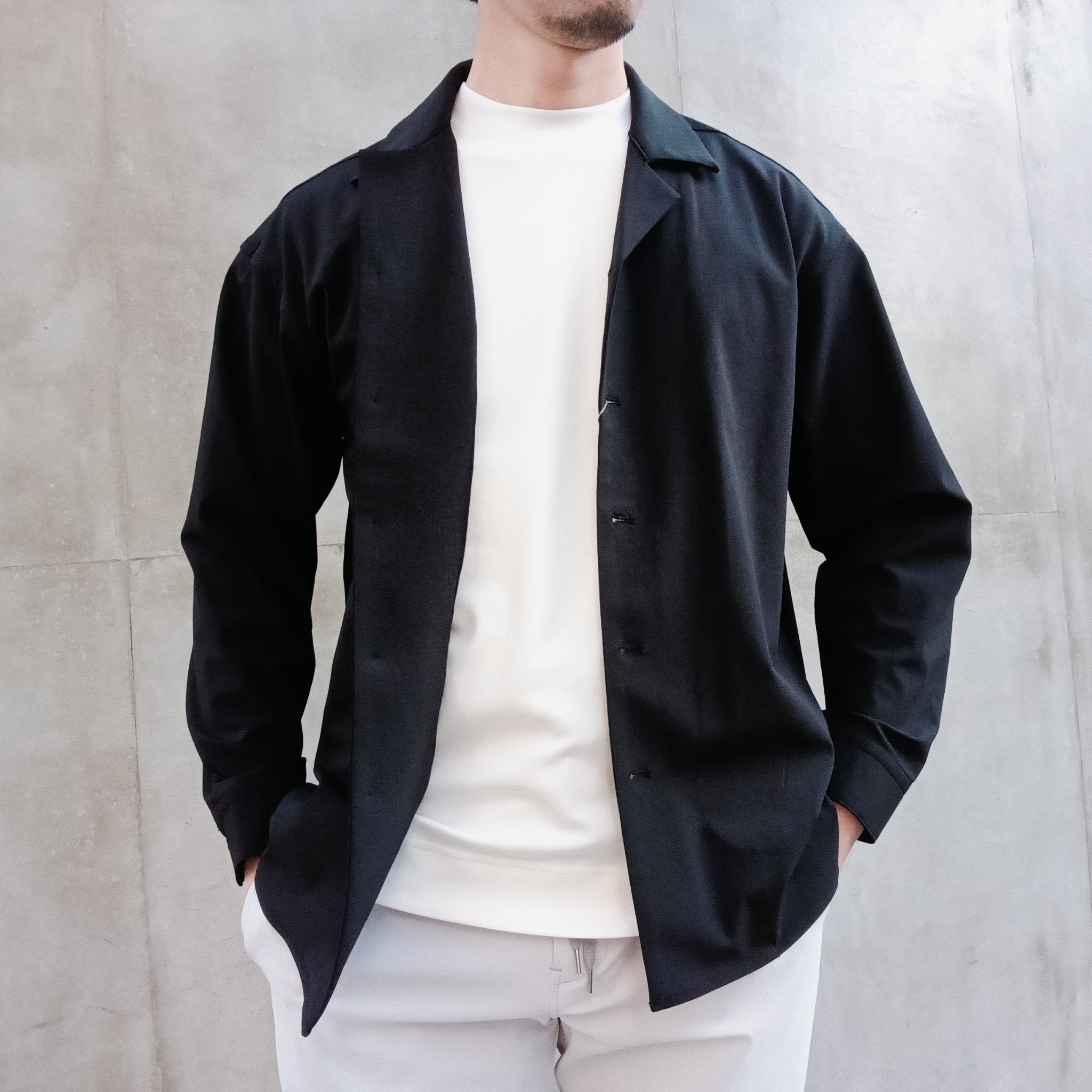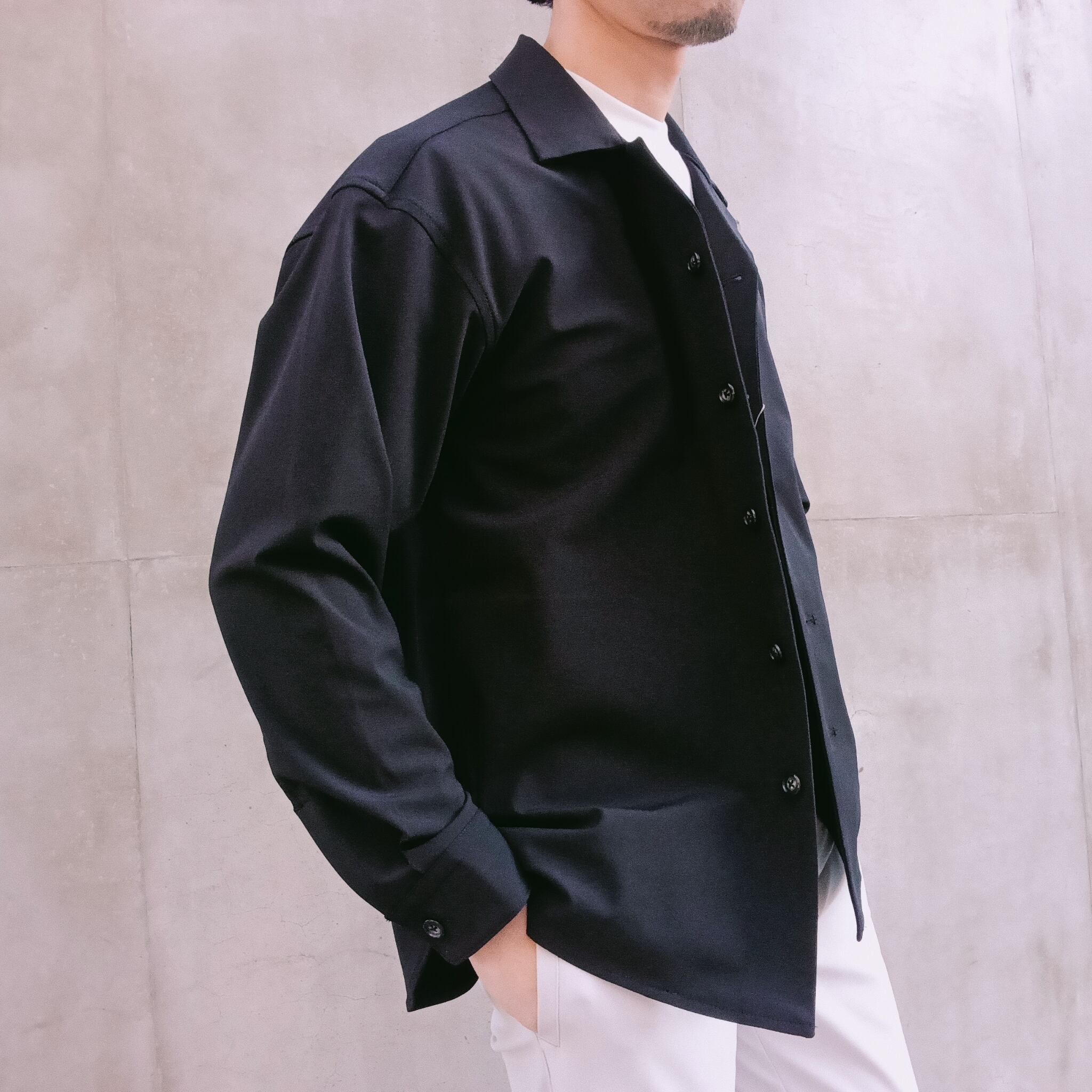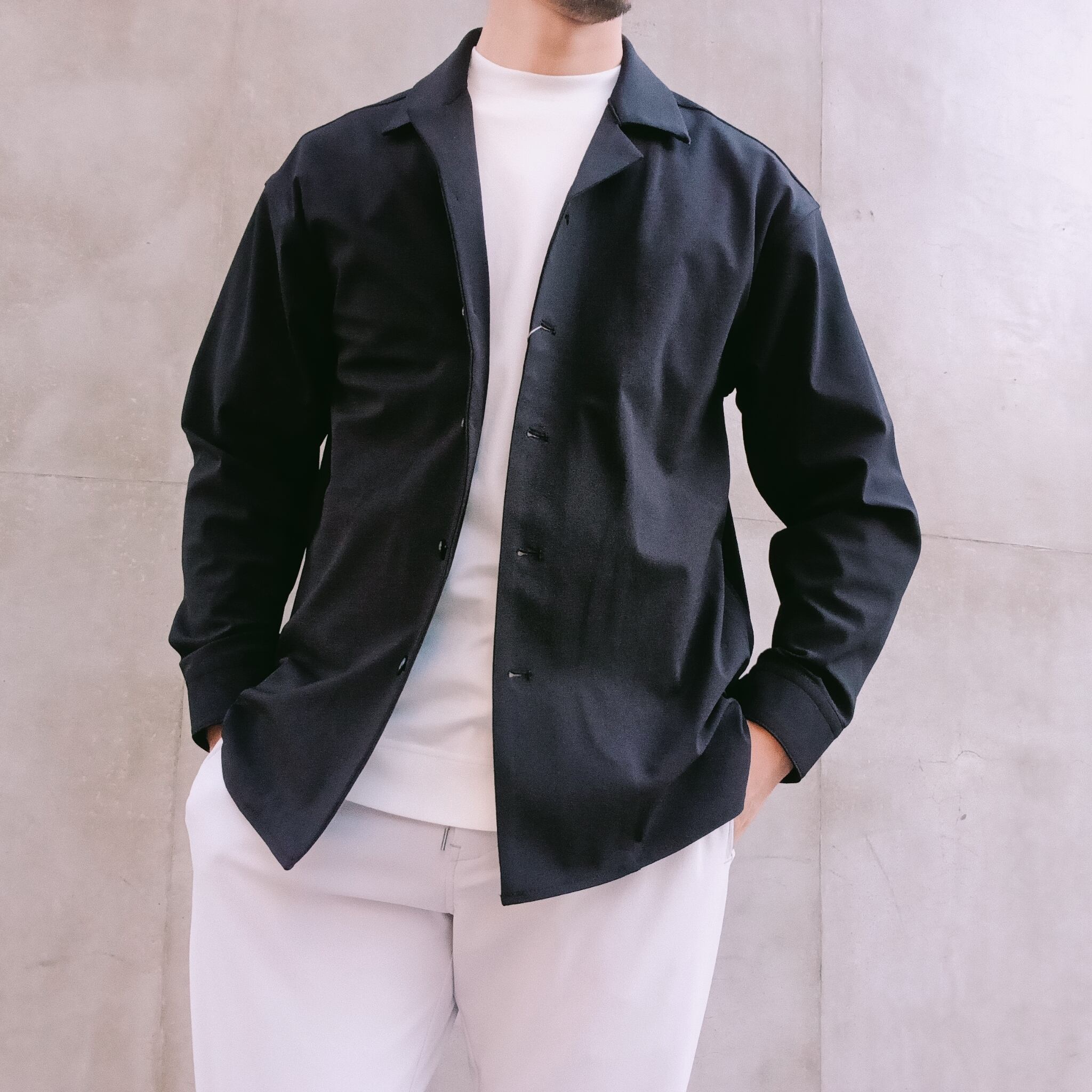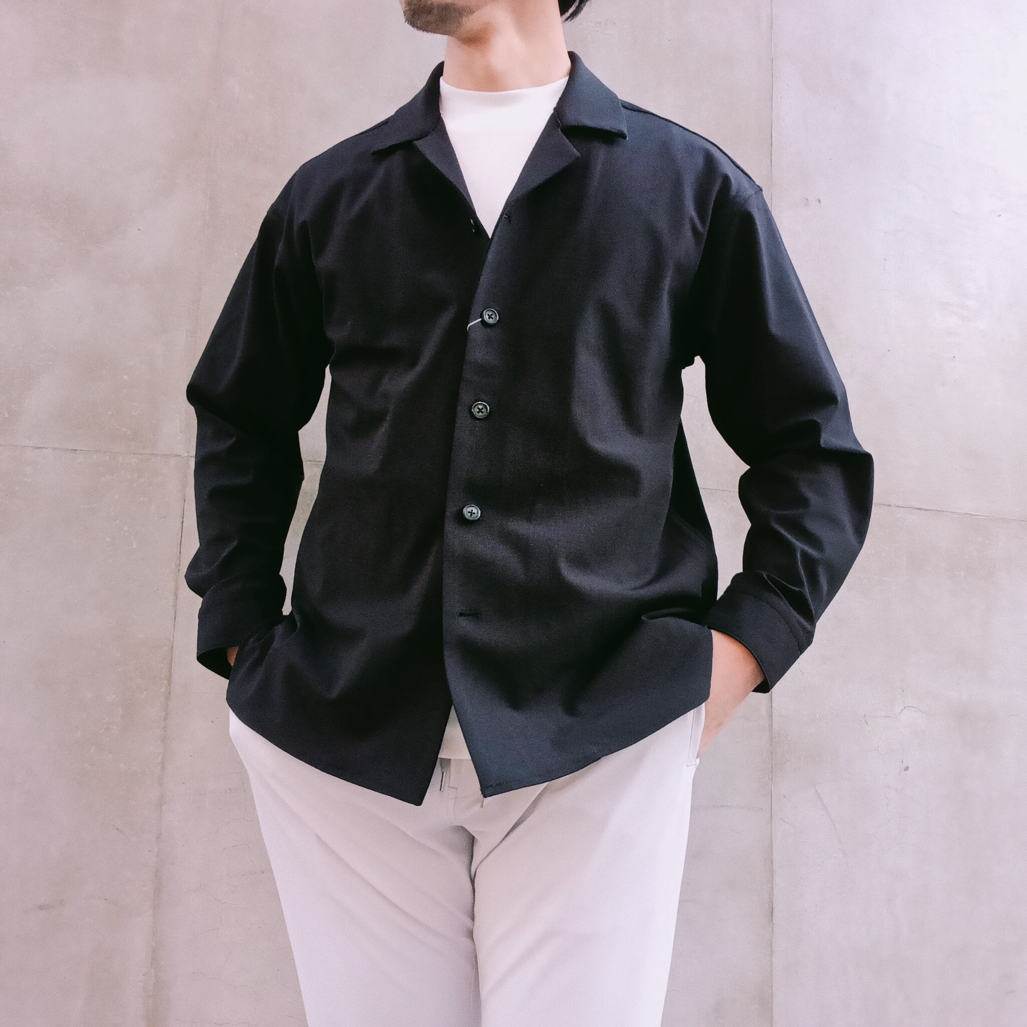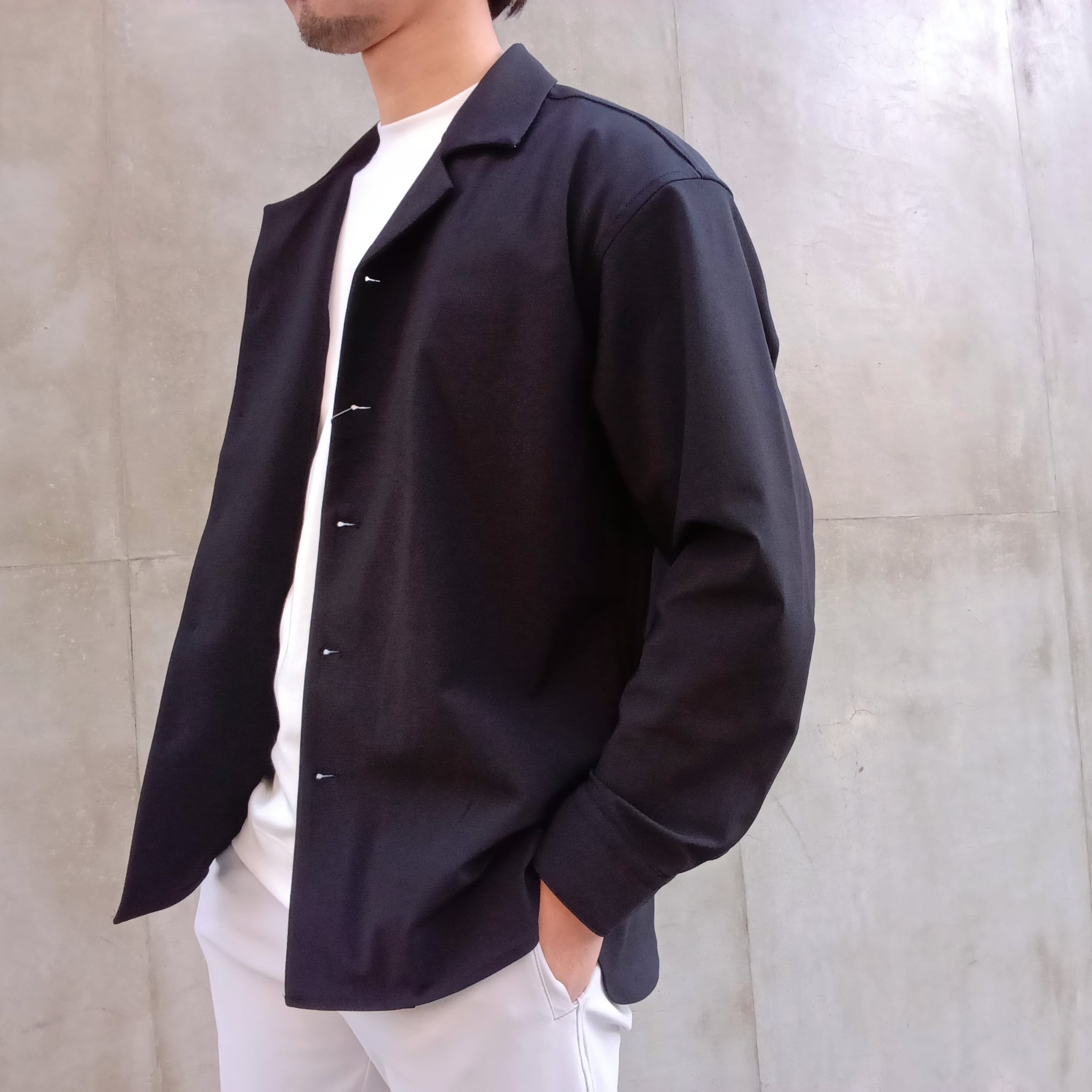 DRAYMASTERを使った多機能トリコットを使い、リラックス感のあるシルエットで作製したシャツジャケット。小さめのラペルやミニマムなディテールにより「シャツ以上アウター未満」の便利なアイテムに仕上げています。凹凸ある上品な表情と機能性を併せ持った素材使いはビジネスからシックなカジュアルスタイルにと幅広いシーンで活躍してくれます。両脇にはシームポケット付き、同素材でリラックスイージーパンツも展開中です。