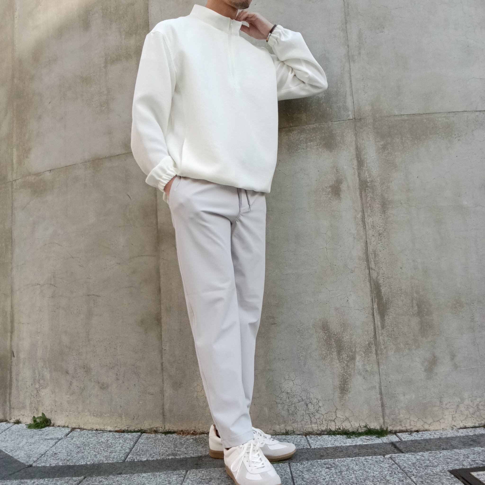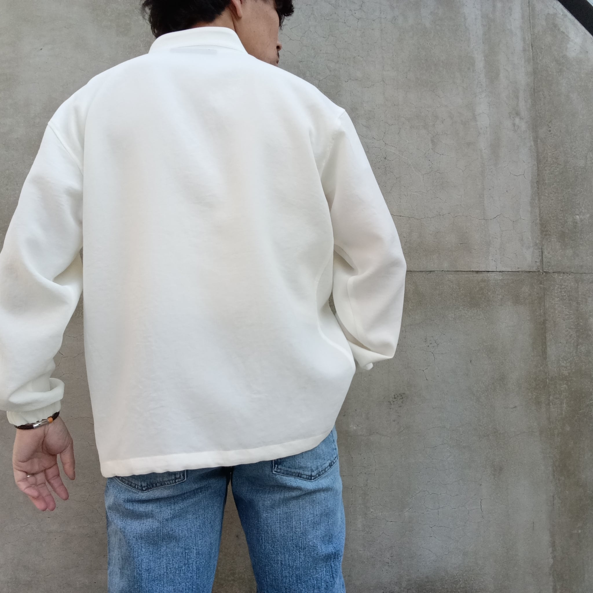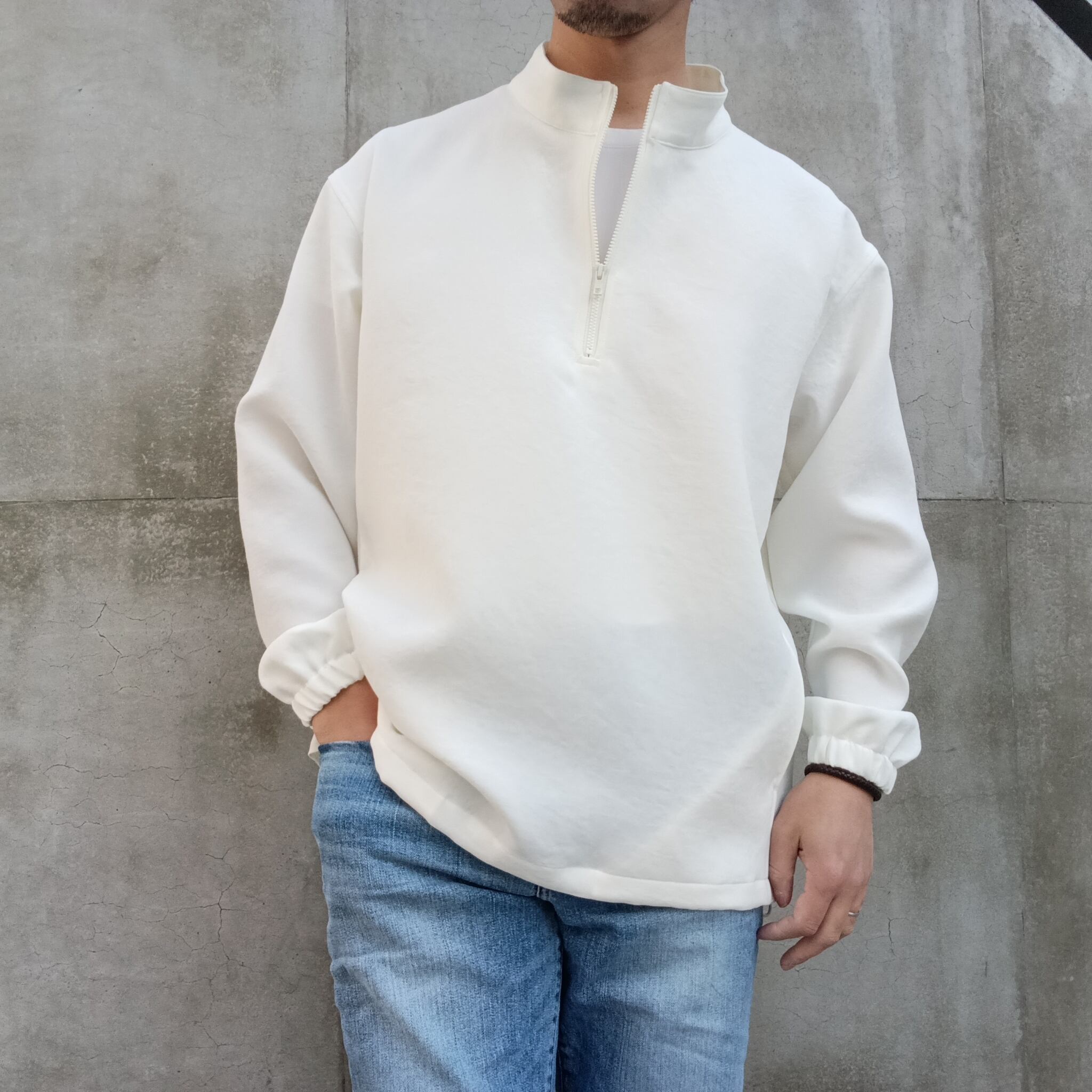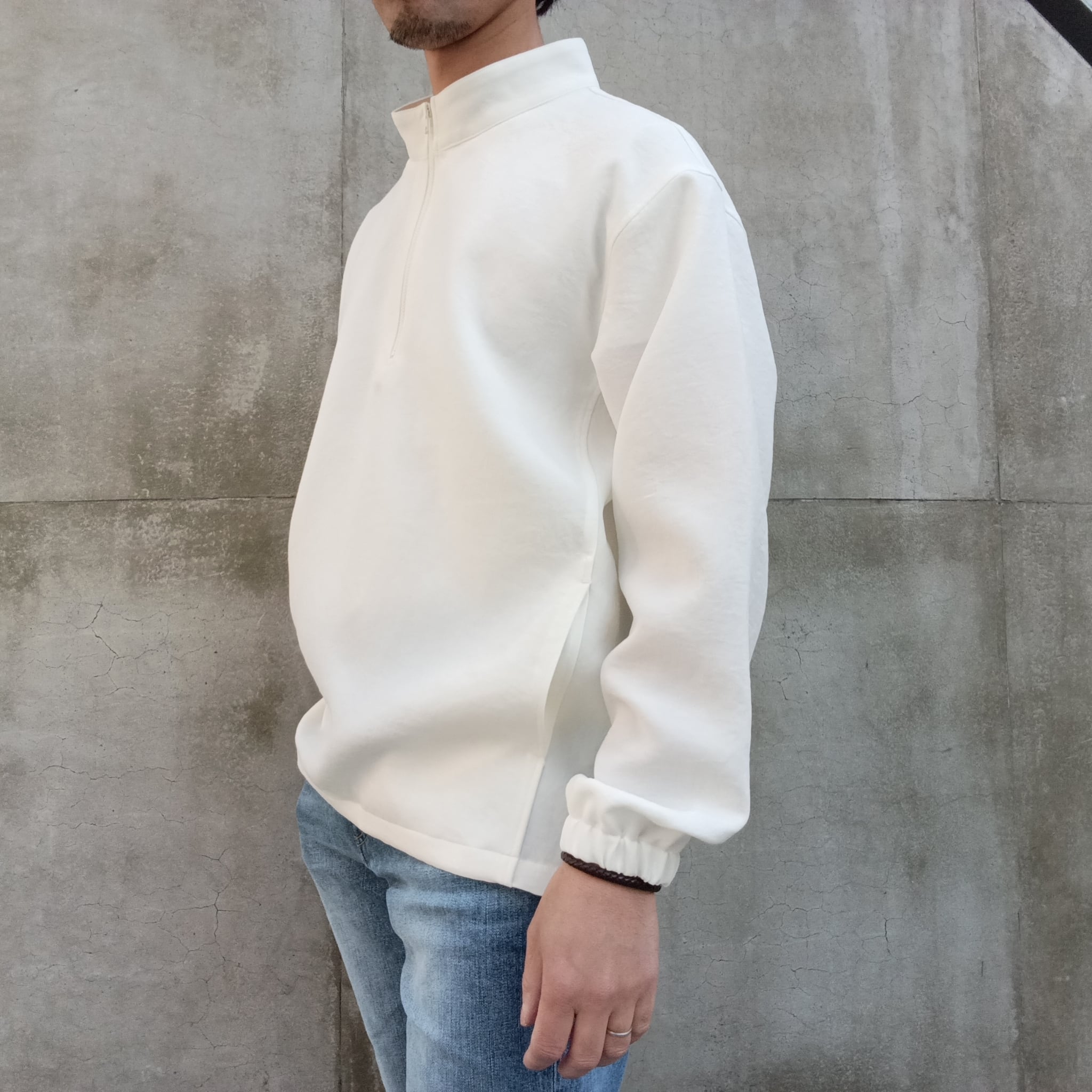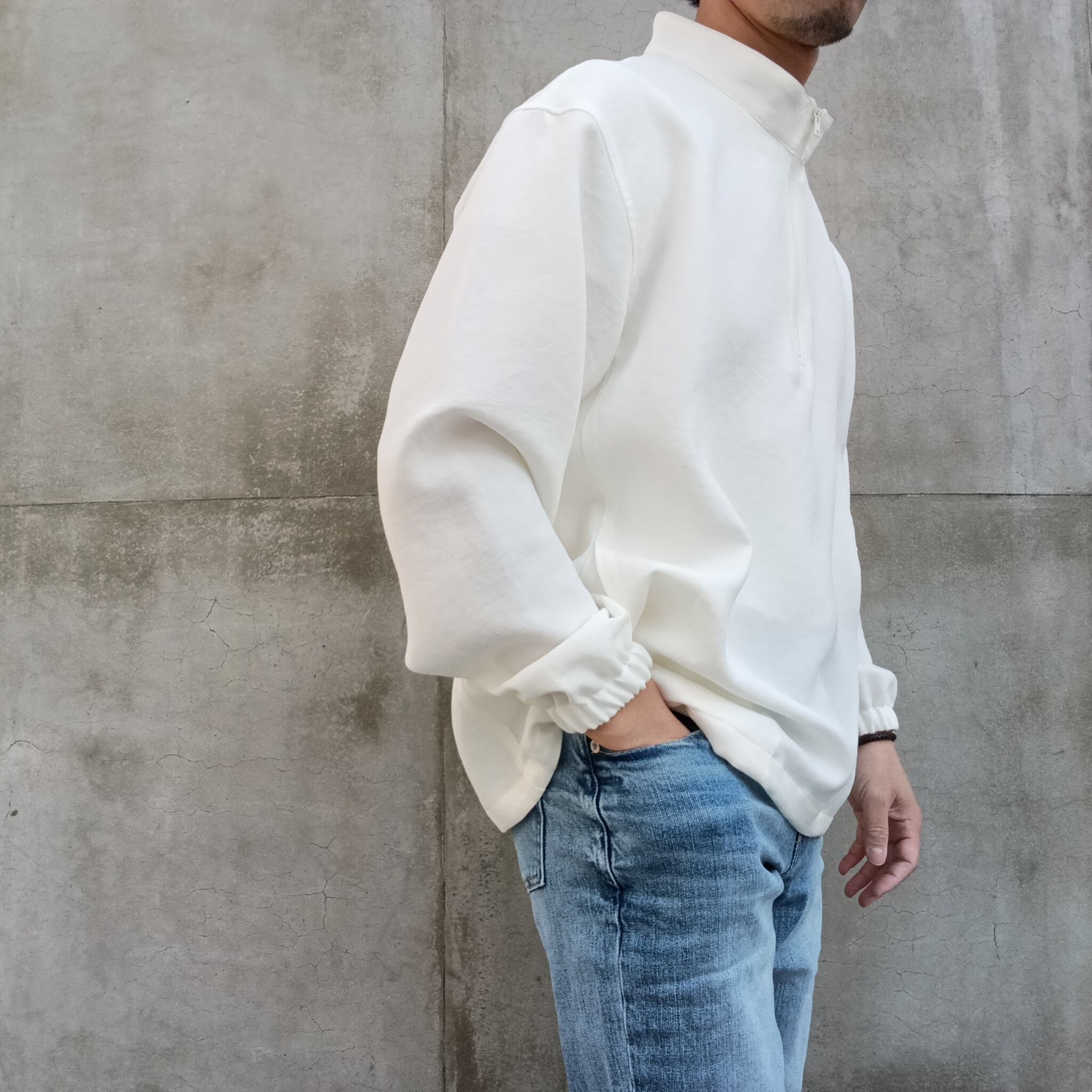 TEIJIN「TRIXIONⓇ」糸を使用し、ナチュラル感のある二重織素材。清涼感のあるさらっとしたドライタッチと、タテヨコのマルチハイストレッチが着用時にストレスを感じさせずリラックス感のある素材です。ブラックの発色も綺麗で大人っぽい雰囲気に仕上がっています。昨秋より大注目のスタンドジップシャツ型。
