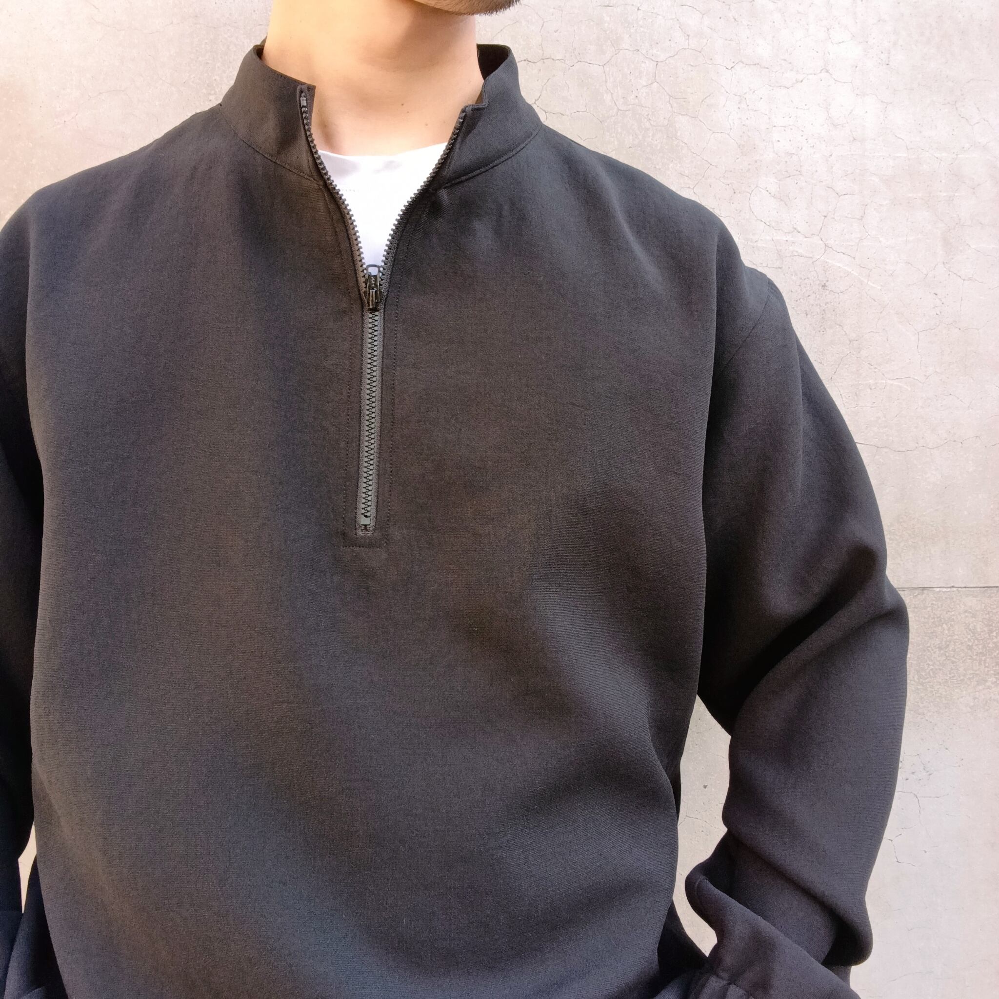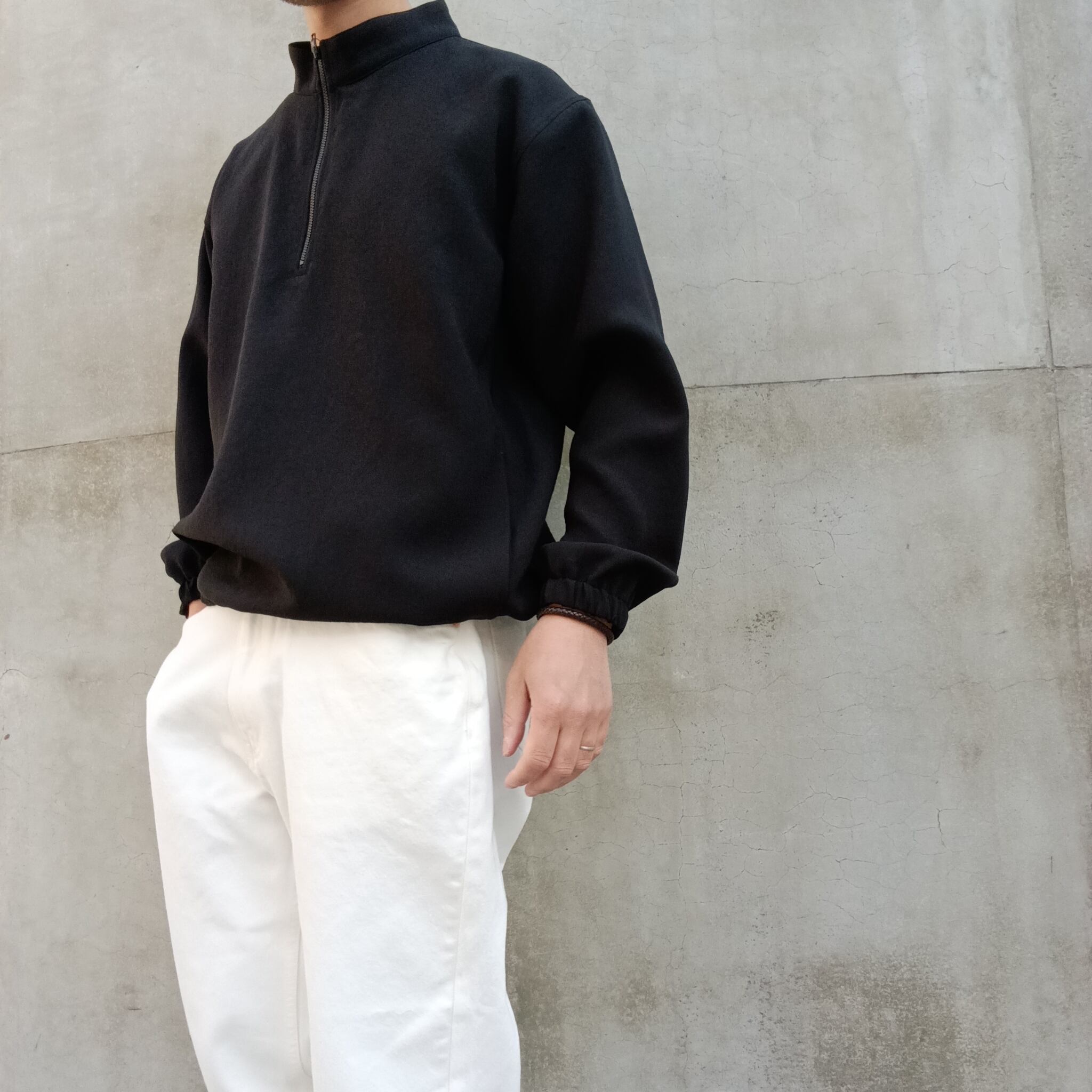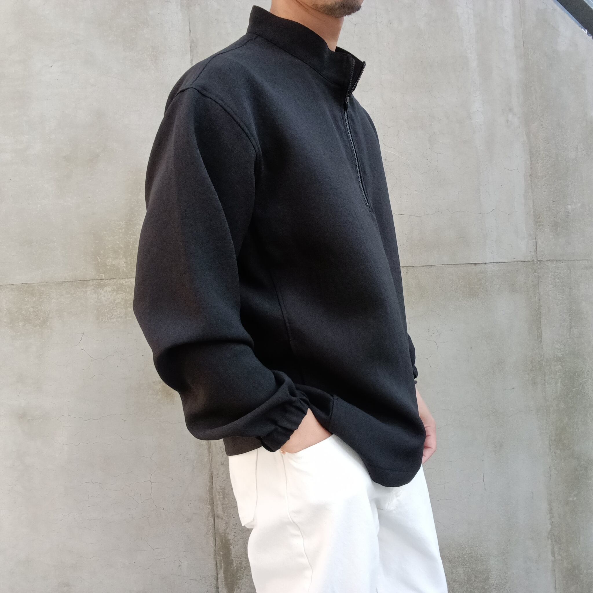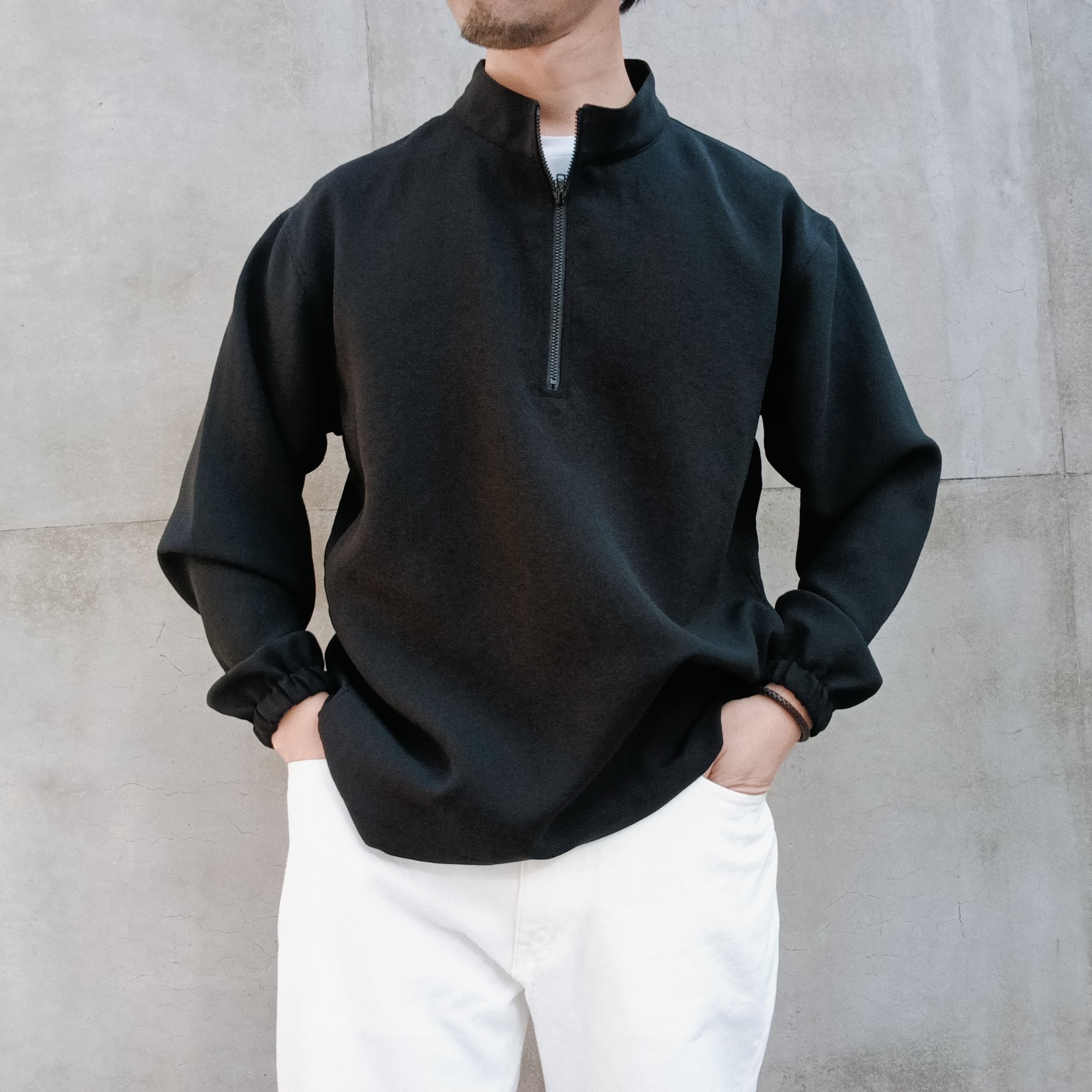 TEIJIN「TRIXIONⓇ」糸を使用し、ナチュラル感のある二重織素材。清涼感のあるさらっとしたドライタッチと、タテヨコのマルチハイストレッチが着用時にストレスを感じさせずリラックス感のある素材です。ブラックの発色も綺麗で大人っぽい雰囲気に仕上がっています。昨秋より大注目のスタンドジップシャツ型。