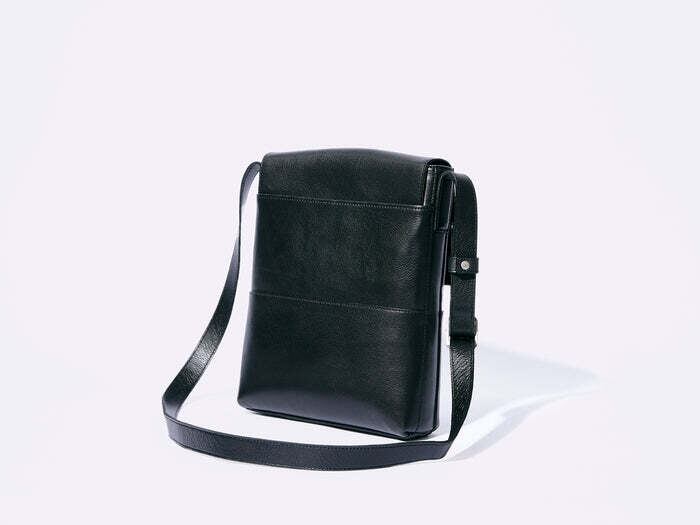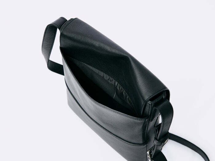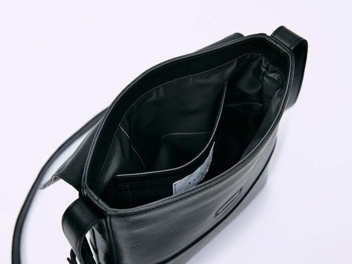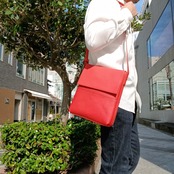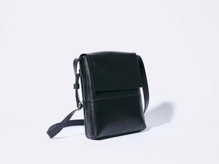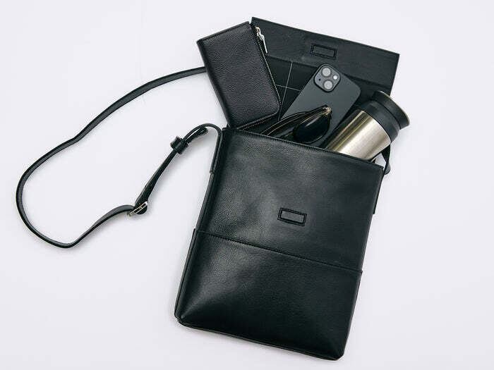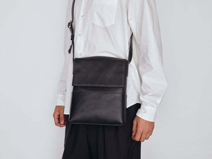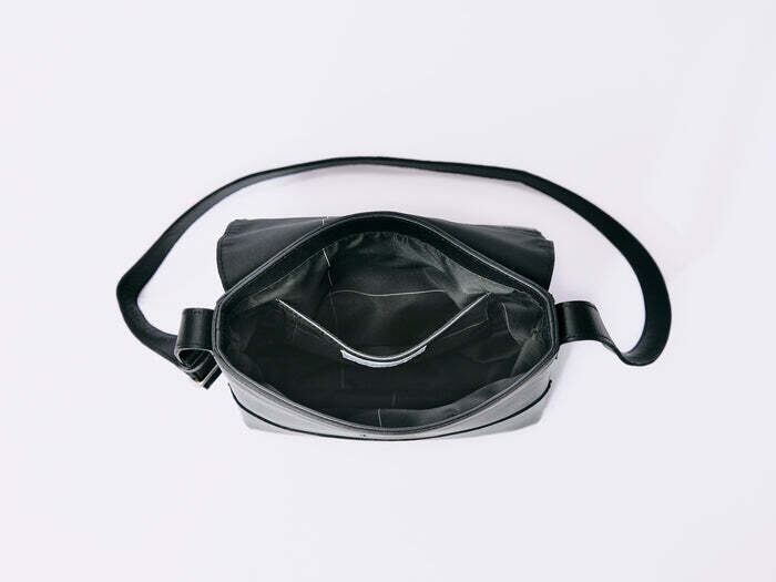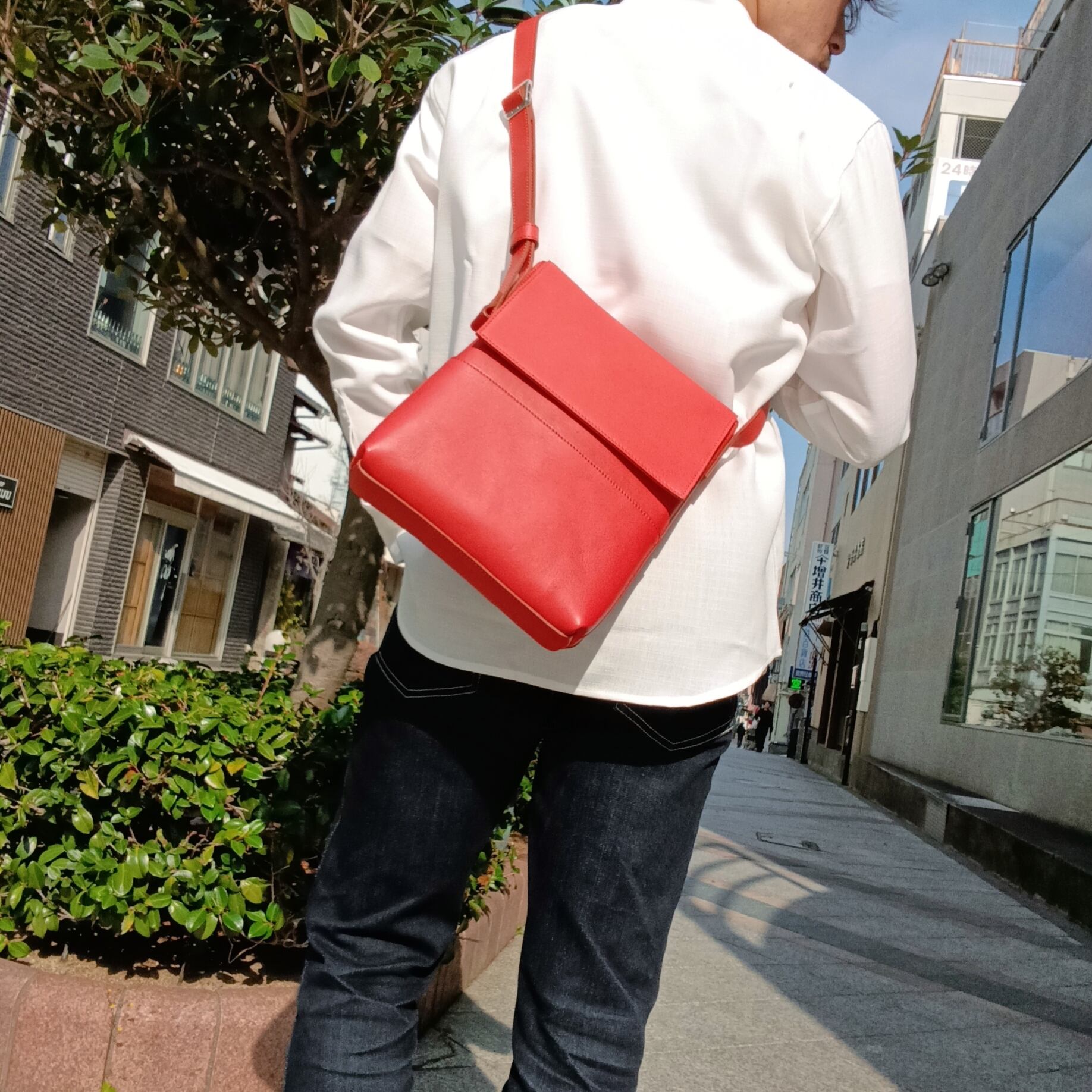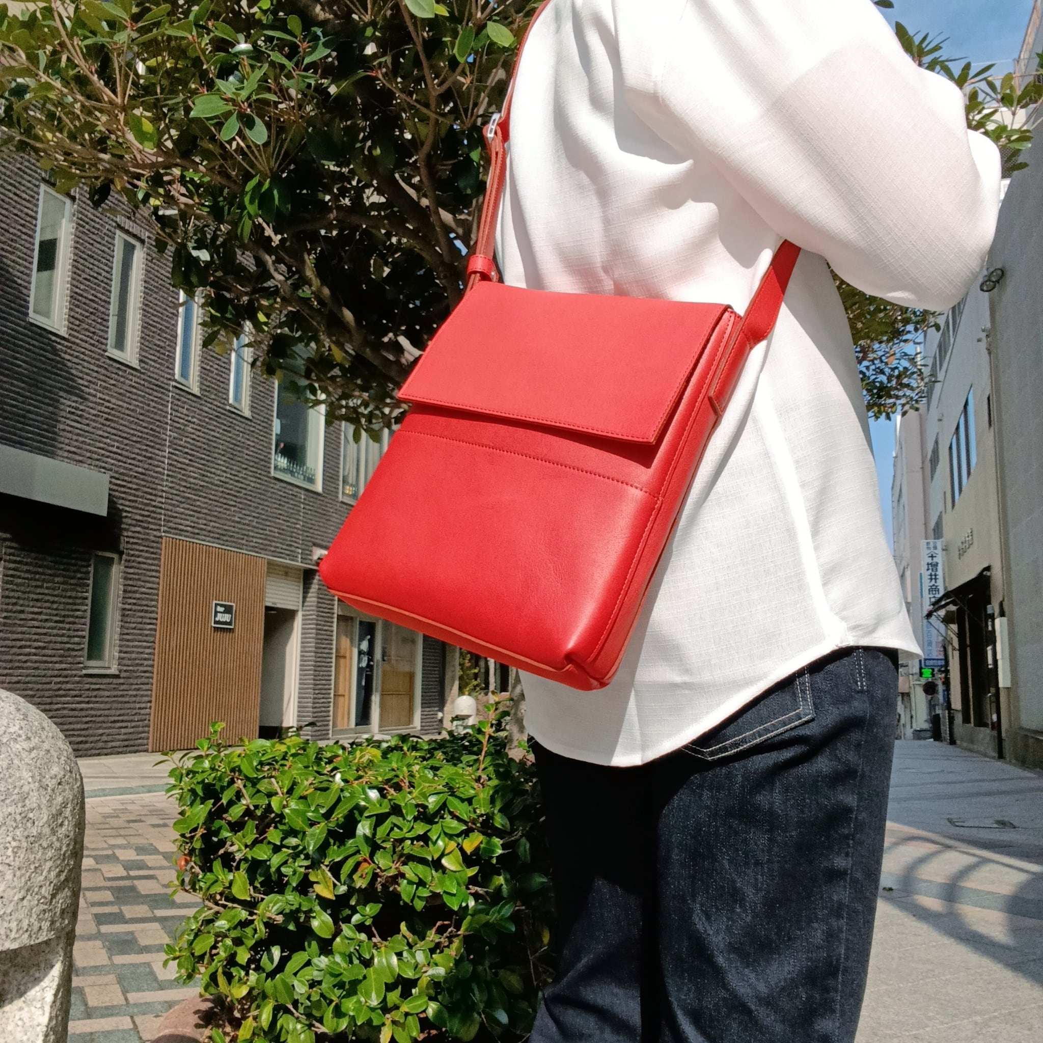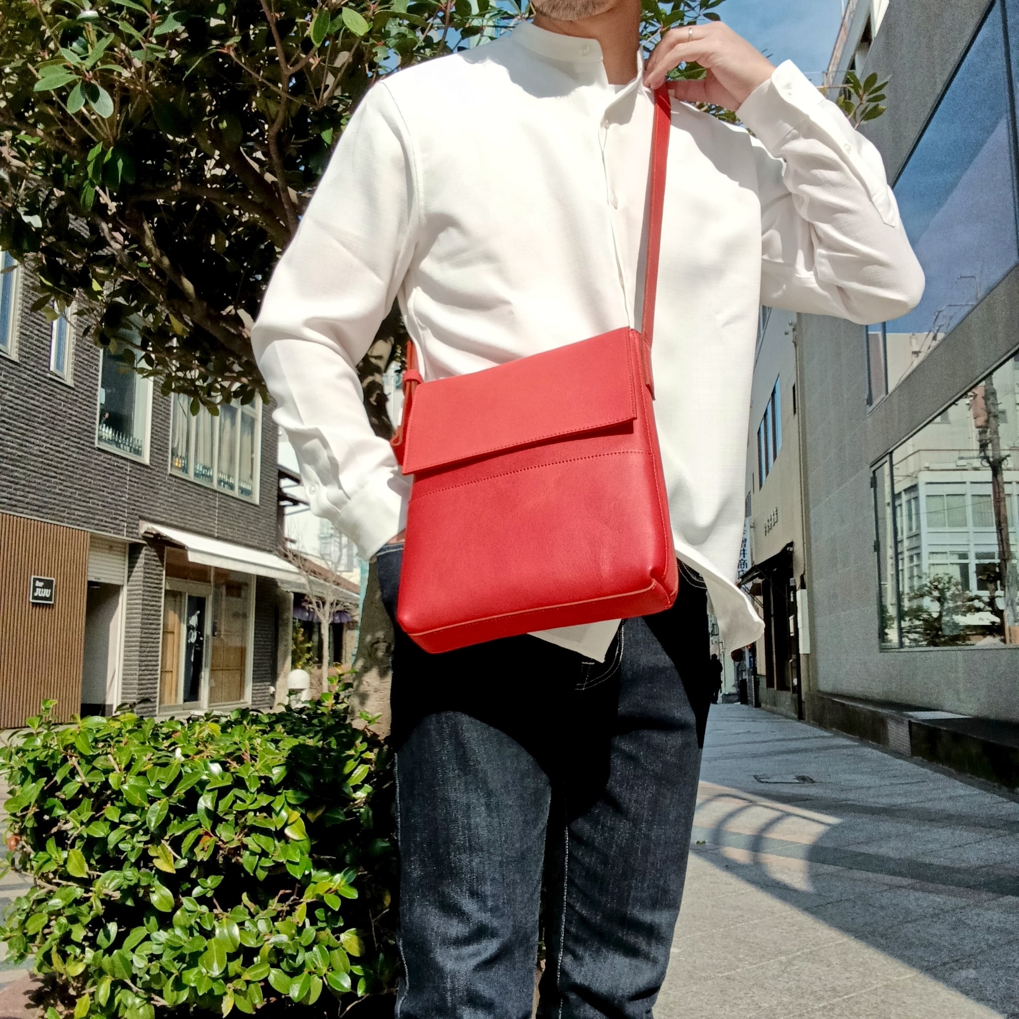 フラップ付きのマグネット開閉仕様を採用し、ファスナーよりもさらにスムーズでストレスのない使い心地が特徴のショルダーバッグです。フォルムは、既視感のないサイズ感を目指し試行錯誤したので、このボディバランスは鮮度抜群かと。とはいえマチは6cmと意外と荷室を広く設計。普段使いからちょっとしたお出かけまで幅広いシーンで活躍するはず。さらに、後面(身体側)には大きな煽りポケットを配備。スマートフォンなどはこちらに入れておくと便利です。マナーモード時の振動にもすぐ気付けるため、そういった実用性も!