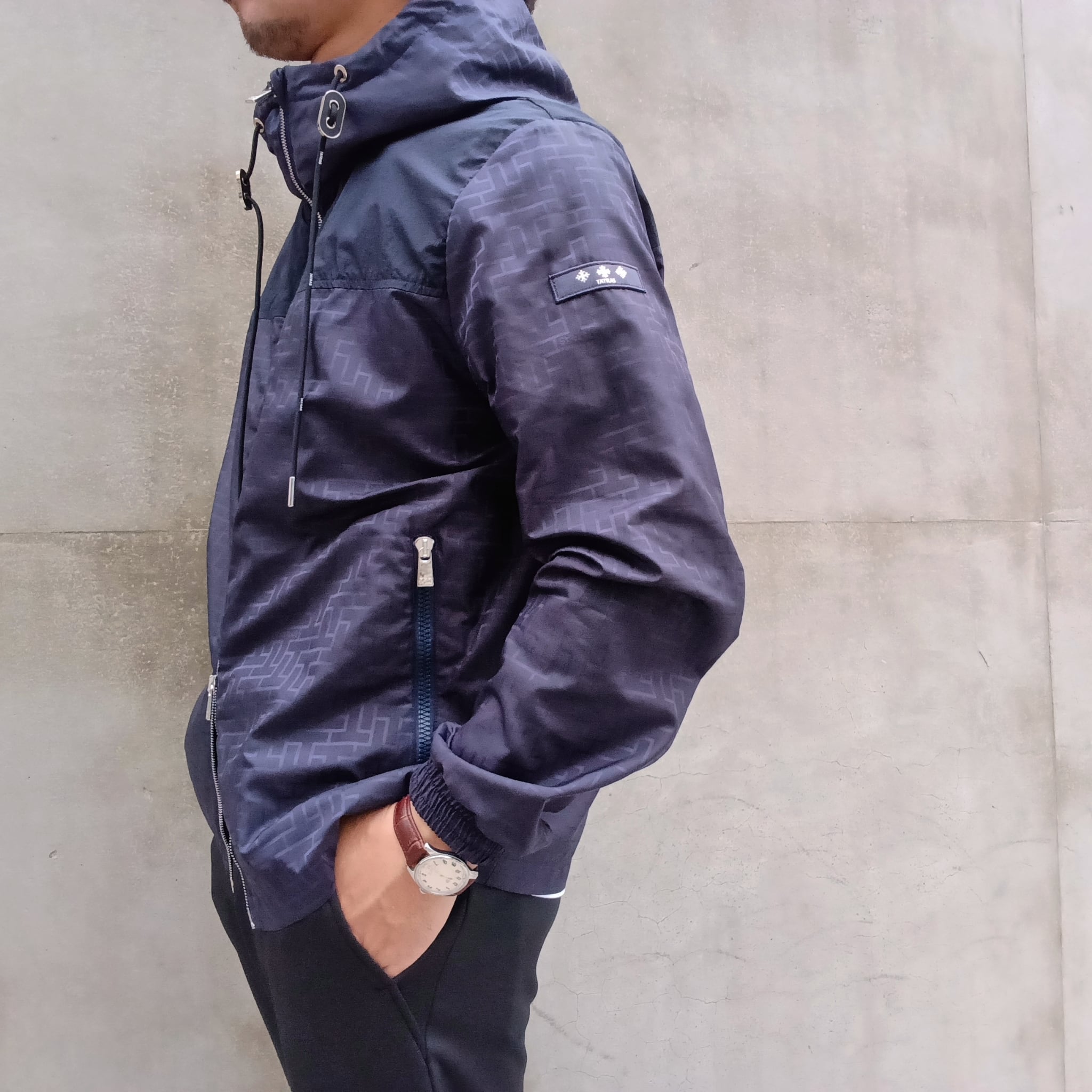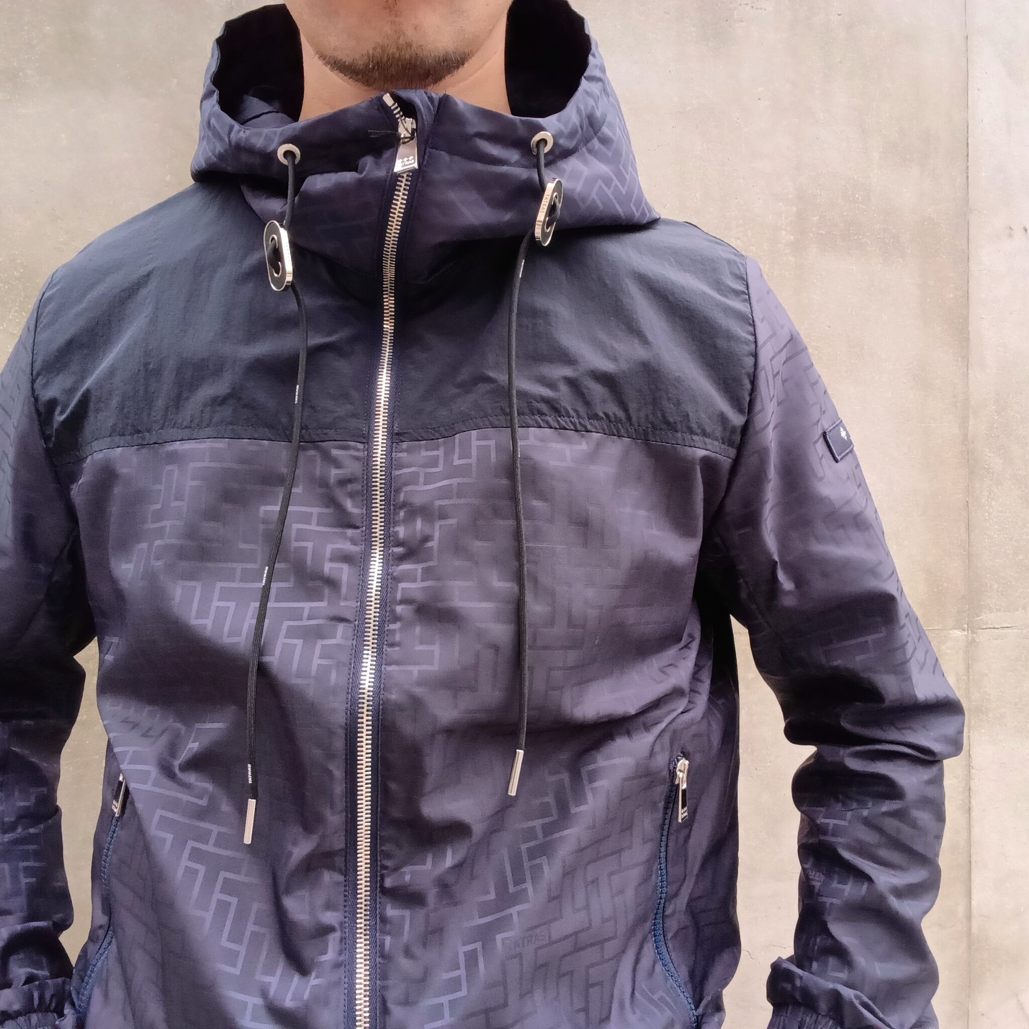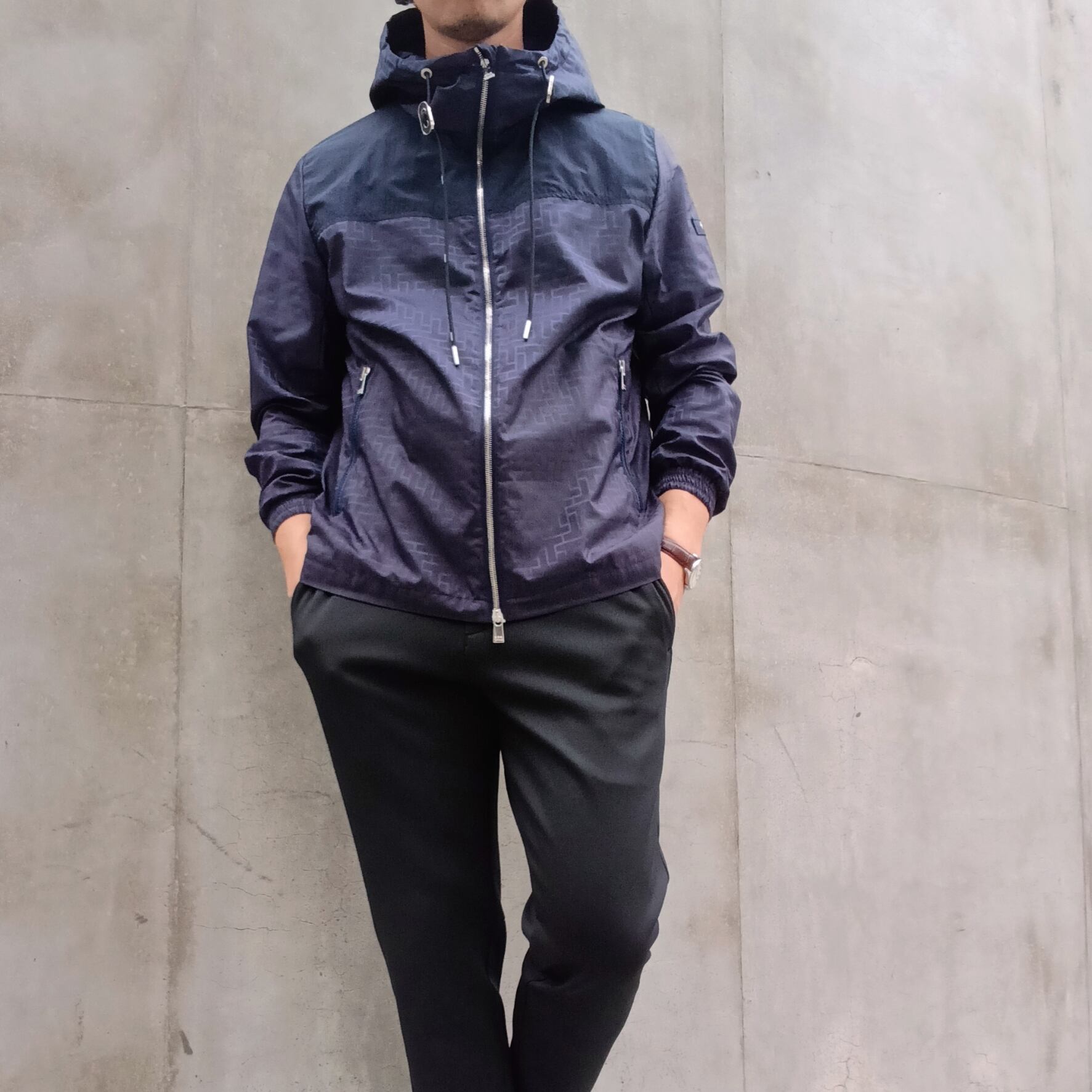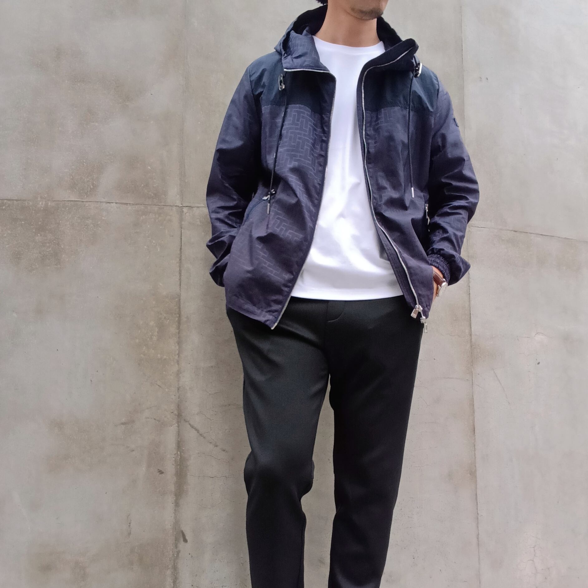 程よい光沢感と撥水性を持つ、滑らかな風合いのモノグラムジャカード素材を使用したフードブルゾン。