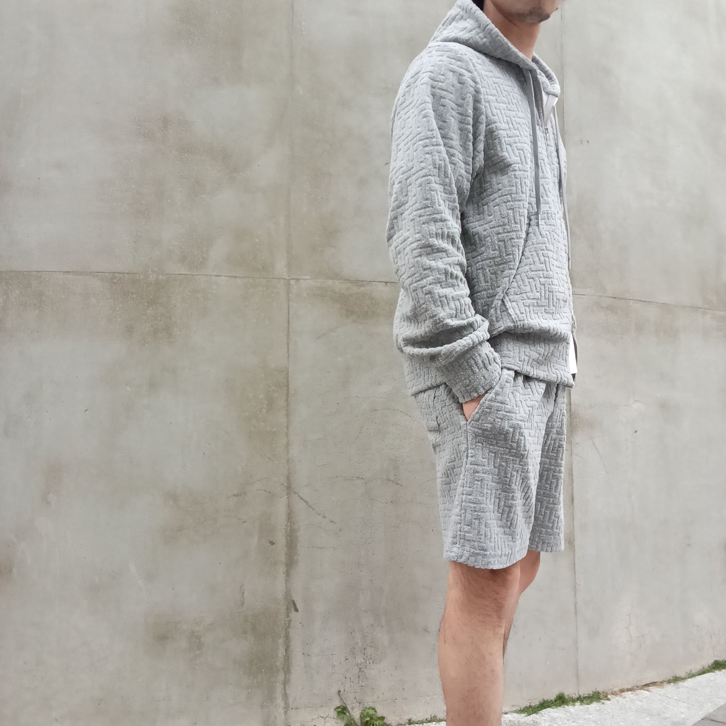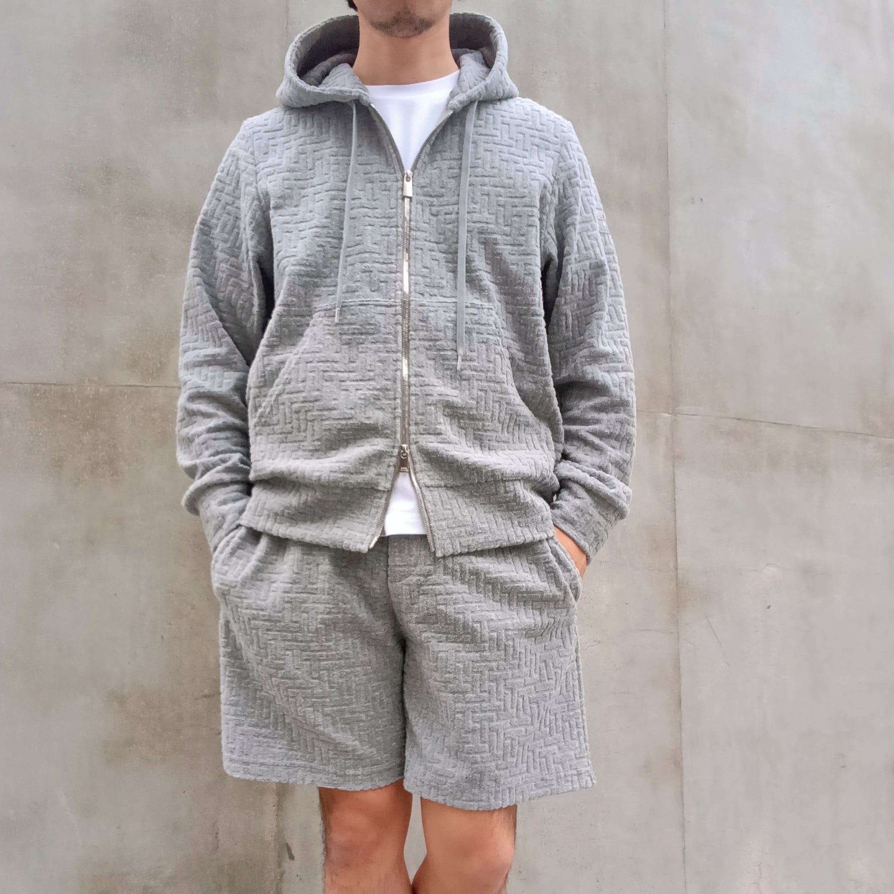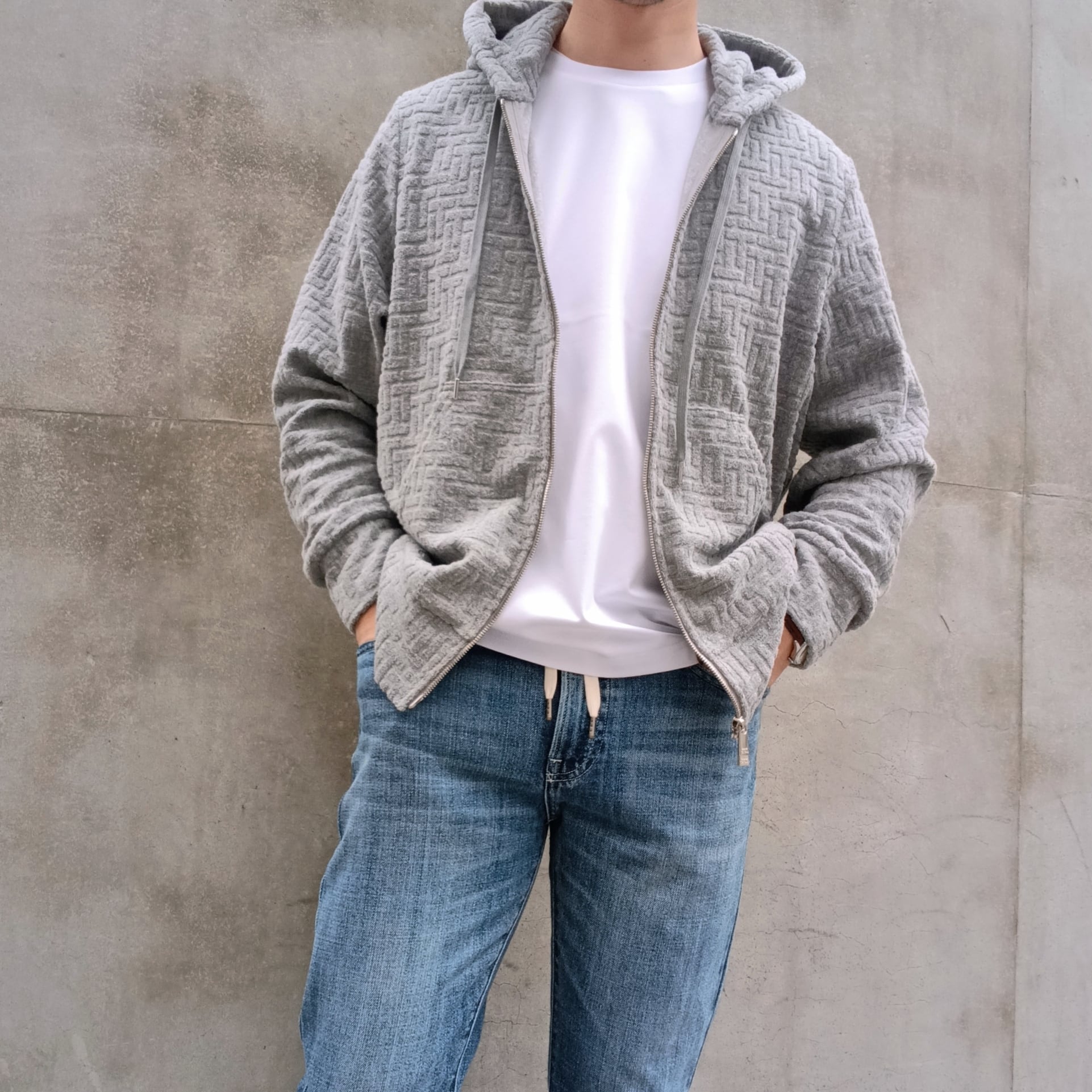 程よい光沢感と撥水性を持つ、滑らかな風合いのモノグラムジャカード素材を使用したフードブルゾン。